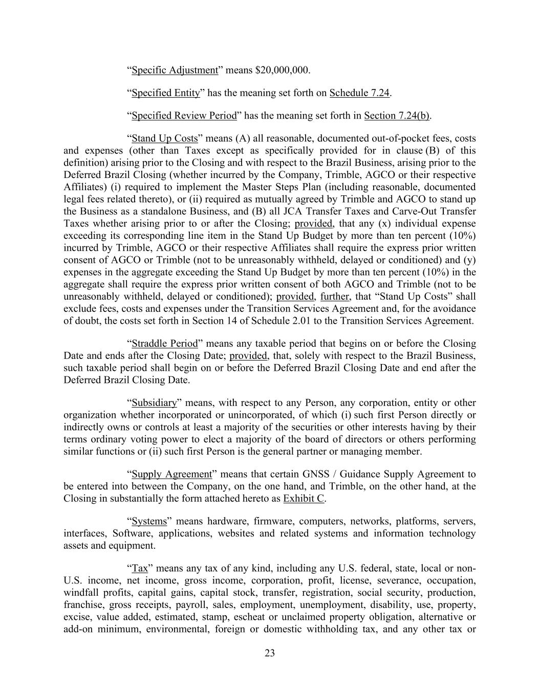 23 “Specific Adjustment” means $20,000,000. “Specified Entity” has the meaning set forth on Schedule 7.24. “Specified Review Period” has the meaning set forth in Section 7.24(b). “Stand Up Costs” means (A) all reasonable, documented out-of-pocket fees, costs and expenses (other than Taxes except as specifically provided for in clause (B) of this definition) arising prior to the Closing and with respect to the Brazil Business, arising prior to the Deferred Brazil Closing (whether incurred by the Company, Trimble, AGCO or their respective Affiliates) (i) required to implement the Master Steps Plan (including reasonable, documented legal fees related thereto), or (ii) required as mutually agreed by Trimble and AGCO to stand up the Business as a standalone Business, and (B) all JCA Transfer Taxes and Carve-Out Transfer Taxes whether arising prior to or after the Closing; provided, that any (x) individual expense exceeding its corresponding line item in the Stand Up Budget by more than ten percent (10%) incurred by Trimble, AGCO or their respective Affiliates shall require the express prior written consent of AGCO or Trimble (not to be unreasonably withheld, delayed or conditioned) and (y) expenses in the aggregate exceeding the Stand Up Budget by more than ten percent (10%) in the aggregate shall require the express prior written consent of both AGCO and Trimble (not to be unreasonably withheld, delayed or conditioned); provided, further, that “Stand Up Costs” shall exclude fees, costs and expenses under the Transition Services Agreement and, for the avoidance of doubt, the costs set forth in Section 14 of Schedule 2.01 to the Transition Services Agreement. “Straddle Period” means any taxable period that begins on or before the Closing Date and ends after the Closing Date; provided, that, solely with respect to the Brazil Business, such taxable period shall begin on or before the Deferred Brazil Closing Date and end after the Deferred Brazil Closing Date. “Subsidiary” means, with respect to any Person, any corporation, entity or other organization whether incorporated or unincorporated, of which (i) such first Person directly or indirectly owns or controls at least a majority of the securities or other interests having by their terms ordinary voting power to elect a majority of the board of directors or others performing similar functions or (ii) such first Person is the general partner or managing member. “Supply Agreement” means that certain GNSS / Guidance Supply Agreement to be entered into between the Company, on the one hand, and Trimble, on the other hand, at the Closing in substantially the form attached hereto as Exhibit C. “Systems” means hardware, firmware, computers, networks, platforms, servers, interfaces, Software, applications, websites and related systems and information technology assets and equipment. “Tax” means any tax of any kind, including any U.S. federal, state, local or non- U.S. income, net income, gross income, corporation, profit, license, severance, occupation, windfall profits, capital gains, capital stock, transfer, registration, social security, production, franchise, gross receipts, payroll, sales, employment, unemployment, disability, use, property, excise, value added, estimated, stamp, escheat or unclaimed property obligation, alternative or add-on minimum, environmental, foreign or domestic withholding tax, and any other tax or