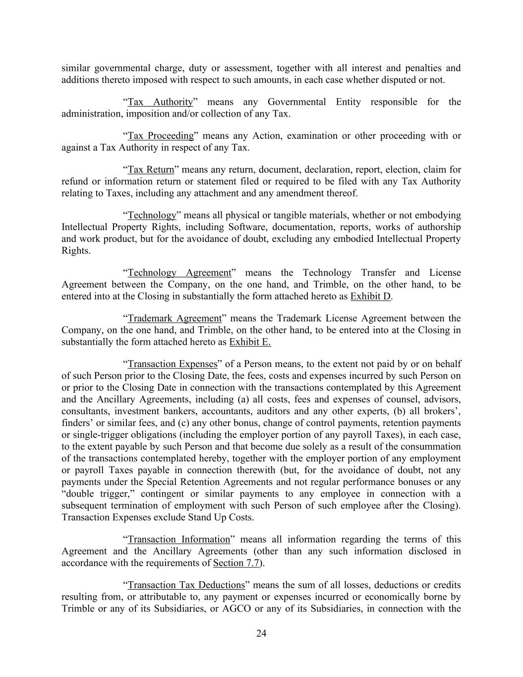24 similar governmental charge, duty or assessment, together with all interest and penalties and additions thereto imposed with respect to such amounts, in each case whether disputed or not. “Tax Authority” means any Governmental Entity responsible for the administration, imposition and/or collection of any Tax. “Tax Proceeding” means any Action, examination or other proceeding with or against a Tax Authority in respect of any Tax. “Tax Return” means any return, document, declaration, report, election, claim for refund or information return or statement filed or required to be filed with any Tax Authority relating to Taxes, including any attachment and any amendment thereof. “Technology” means all physical or tangible materials, whether or not embodying Intellectual Property Rights, including Software, documentation, reports, works of authorship and work product, but for the avoidance of doubt, excluding any embodied Intellectual Property Rights. “Technology Agreement” means the Technology Transfer and License Agreement between the Company, on the one hand, and Trimble, on the other hand, to be entered into at the Closing in substantially the form attached hereto as Exhibit D. “Trademark Agreement” means the Trademark License Agreement between the Company, on the one hand, and Trimble, on the other hand, to be entered into at the Closing in substantially the form attached hereto as Exhibit E. “Transaction Expenses” of a Person means, to the extent not paid by or on behalf of such Person prior to the Closing Date, the fees, costs and expenses incurred by such Person on or prior to the Closing Date in connection with the transactions contemplated by this Agreement and the Ancillary Agreements, including (a) all costs, fees and expenses of counsel, advisors, consultants, investment bankers, accountants, auditors and any other experts, (b) all brokers’, finders’ or similar fees, and (c) any other bonus, change of control payments, retention payments or single-trigger obligations (including the employer portion of any payroll Taxes), in each case, to the extent payable by such Person and that become due solely as a result of the consummation of the transactions contemplated hereby, together with the employer portion of any employment or payroll Taxes payable in connection therewith (but, for the avoidance of doubt, not any payments under the Special Retention Agreements and not regular performance bonuses or any “double trigger,” contingent or similar payments to any employee in connection with a subsequent termination of employment with such Person of such employee after the Closing). Transaction Expenses exclude Stand Up Costs. “Transaction Information” means all information regarding the terms of this Agreement and the Ancillary Agreements (other than any such information disclosed in accordance with the requirements of Section 7.7). “Transaction Tax Deductions” means the sum of all losses, deductions or credits resulting from, or attributable to, any payment or expenses incurred or economically borne by Trimble or any of its Subsidiaries, or AGCO or any of its Subsidiaries, in connection with the