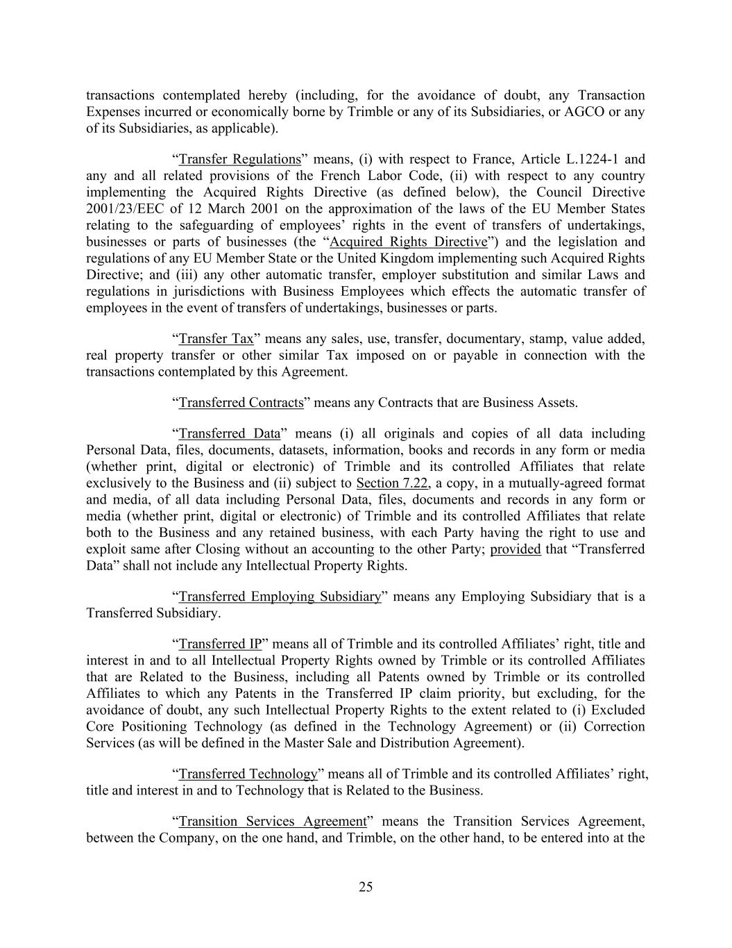25 transactions contemplated hereby (including, for the avoidance of doubt, any Transaction Expenses incurred or economically borne by Trimble or any of its Subsidiaries, or AGCO or any of its Subsidiaries, as applicable). “Transfer Regulations” means, (i) with respect to France, Article L.1224-1 and any and all related provisions of the French Labor Code, (ii) with respect to any country implementing the Acquired Rights Directive (as defined below), the Council Directive 2001/23/EEC of 12 March 2001 on the approximation of the laws of the EU Member States relating to the safeguarding of employees’ rights in the event of transfers of undertakings, businesses or parts of businesses (the “Acquired Rights Directive”) and the legislation and regulations of any EU Member State or the United Kingdom implementing such Acquired Rights Directive; and (iii) any other automatic transfer, employer substitution and similar Laws and regulations in jurisdictions with Business Employees which effects the automatic transfer of employees in the event of transfers of undertakings, businesses or parts. “Transfer Tax” means any sales, use, transfer, documentary, stamp, value added, real property transfer or other similar Tax imposed on or payable in connection with the transactions contemplated by this Agreement. “Transferred Contracts” means any Contracts that are Business Assets. “Transferred Data” means (i) all originals and copies of all data including Personal Data, files, documents, datasets, information, books and records in any form or media (whether print, digital or electronic) of Trimble and its controlled Affiliates that relate exclusively to the Business and (ii) subject to Section 7.22, a copy, in a mutually-agreed format and media, of all data including Personal Data, files, documents and records in any form or media (whether print, digital or electronic) of Trimble and its controlled Affiliates that relate both to the Business and any retained business, with each Party having the right to use and exploit same after Closing without an accounting to the other Party; provided that “Transferred Data” shall not include any Intellectual Property Rights. “Transferred Employing Subsidiary” means any Employing Subsidiary that is a Transferred Subsidiary. “Transferred IP” means all of Trimble and its controlled Affiliates’ right, title and interest in and to all Intellectual Property Rights owned by Trimble or its controlled Affiliates that are Related to the Business, including all Patents owned by Trimble or its controlled Affiliates to which any Patents in the Transferred IP claim priority, but excluding, for the avoidance of doubt, any such Intellectual Property Rights to the extent related to (i) Excluded Core Positioning Technology (as defined in the Technology Agreement) or (ii) Correction Services (as will be defined in the Master Sale and Distribution Agreement). “Transferred Technology” means all of Trimble and its controlled Affiliates’ right, title and interest in and to Technology that is Related to the Business. “Transition Services Agreement” means the Transition Services Agreement, between the Company, on the one hand, and Trimble, on the other hand, to be entered into at the