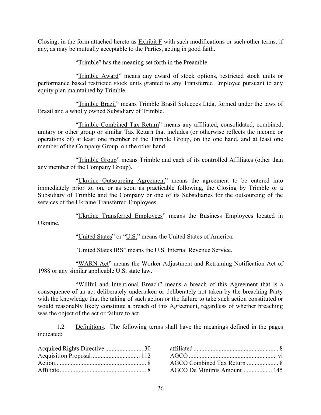 26 Closing, in the form attached hereto as Exhibit F with such modifications or such other terms, if any, as may be mutually acceptable to the Parties, acting in good faith. “Trimble” has the meaning set forth in the Preamble. “Trimble Award” means any award of stock options, restricted stock units or performance based restricted stock units granted to any Transferred Employee pursuant to any equity plan maintained by Trimble. “Trimble Brazil” means Trimble Brasil Solucoes Ltda, formed under the laws of Brazil and a wholly owned Subsidiary of Trimble. “Trimble Combined Tax Return” means any affiliated, consolidated, combined, unitary or other group or similar Tax Return that includes (or otherwise reflects the income or operations of) at least one member of the Trimble Group, on the one hand, and at least one member of the Company Group, on the other hand. “Trimble Group” means Trimble and each of its controlled Affiliates (other than any member of the Company Group). “Ukraine Outsourcing Agreement” means the agreement to be entered into immediately prior to, on, or as soon as practicable following, the Closing by Trimble or a Subsidiary of Trimble and the Company or one of its Subsidiaries for the outsourcing of the services of the Ukraine Transferred Employees. “Ukraine Transferred Employees” means the Business Employees located in Ukraine. “United States” or “U.S.” means the United States of America. “United States IRS” means the U.S. Internal Revenue Service. “WARN Act” means the Worker Adjustment and Retraining Notification Act of 1988 or any similar applicable U.S. state law. “Willful and Intentional Breach” means a breach of this Agreement that is a consequence of an act deliberately undertaken or deliberately not taken by the breaching Party with the knowledge that the taking of such action or the failure to take such action constituted or would reasonably likely constitute a breach of this Agreement, regardless of whether breaching was the object of the act or failure to act. 1.2 Definitions. The following terms shall have the meanings defined in the pages indicated: Acquired Rights Directive ........................ 30 Acquisition Proposal ............................... 112 Action .......................................................... 8 Affiliate ....................................................... 8 affiliated ...................................................... 8 AGCO ........................................................ vi AGCO Combined Tax Return .................... 8 AGCO De Minimis Amount ................... 145