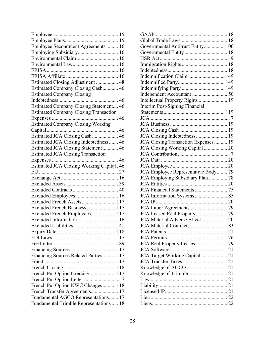 28 Employee .................................................. 15 Employee Plans ......................................... 15 Employee Secondment Agreements ......... 16 Employing Subsidiary ............................... 16 Environmental Claim ................................ 16 Environmental Law ................................... 16 ERISA ....................................................... 16 ERISA Affiliate ........................................ 16 Estimated Closing Adjustment ................. 48 Estimated Company Closing Cash............ 46 Estimated Company Closing Indebtedness .............................................. 46 Estimated Company Closing Statement.... 46 Estimated Company Closing Transaction Expenses ................................................... 46 Estimated Company Closing Working Capital ....................................................... 46 Estimated JCA Closing Cash .................... 46 Estimated JCA Closing Indebtedness ....... 46 Estimated JCA Closing Statement ............ 46 Estimated JCA Closing Transaction Expenses ................................................... 46 Estimated JCA Closing Working Capital . 46 EU ............................................................. 27 Exchange Act ............................................ 16 Excluded Assets ........................................ 39 Excluded Contracts ................................... 40 Excluded Employees ................................. 16 Excluded French Assets .......................... 117 Excluded French Business ...................... 117 Excluded French Employees................... 117 Excluded Information ............................... 16 Excluded Liabilities .................................. 41 Expiry Date ............................................. 118 FDI Laws .................................................. 17 Fee Letter .................................................. 89 Financing Sources ..................................... 17 Financing Sources Related Parties ............ 17 Fraud ......................................................... 17 French Closing ........................................ 118 French Put Option Exercise .................... 117 French Put Option Letter ............................ 7 French Put Option NWC Changes .......... 118 French Transfer Agreements..................... 17 Fundamental AGCO Representations ....... 17 Fundamental Trimble Representations ..... 18 GAAP ........................................................ 18 Global Trade Laws .................................... 18 Governmental Antitrust Entity ................ 100 Governmental Entity ................................. 18 HSR Act ...................................................... 9 Immigration Rights ................................... 18 Indebtedness .............................................. 18 Indemnification Claim ............................ 149 Indemnified Party.................................... 149 Indemnifying Party ................................. 149 Independent Accountant ........................... 50 Intellectual Property Rights ...................... 19 Interim Post-Signing Financial Statements ............................................... 119 JCA ............................................................. 7 JCA Business ............................................ 19 JCA Closing Cash ..................................... 19 JCA Closing Indebtedness ........................ 19 JCA Closing Transaction Expenses .......... 19 JCA Closing Working Capital .................. 20 JCA Contribution ........................................ 7 JCA Data ................................................... 20 JCA Employee .......................................... 20 JCA Employee Representative Body ........ 79 JCA Employing Subsidiary Plan .............. 78 JCA Entities .............................................. 20 JCA Financial Statements ......................... 75 JCA Information Systems ......................... 85 JCA IP ....................................................... 20 JCA Labor Agreements............................. 79 JCA Leased Real Property ........................ 79 JCA Material Adverse Effect .................... 20 JCA Material Contracts............................. 83 JCA Patents ............................................... 21 JCA Permits .............................................. 76 JCA Real Property Leases ........................ 79 JCA Software ............................................ 21 JCA Target Working Capital .................... 21 JCA Transfer Taxes .................................. 21 Knowledge of AGCO ............................... 21 Knowledge of Trimble .............................. 21 Law ........................................................... 21 Liability ..................................................... 21 Licensed IP................................................ 21 Lien ........................................................... 22 Liens .......................................................... 22