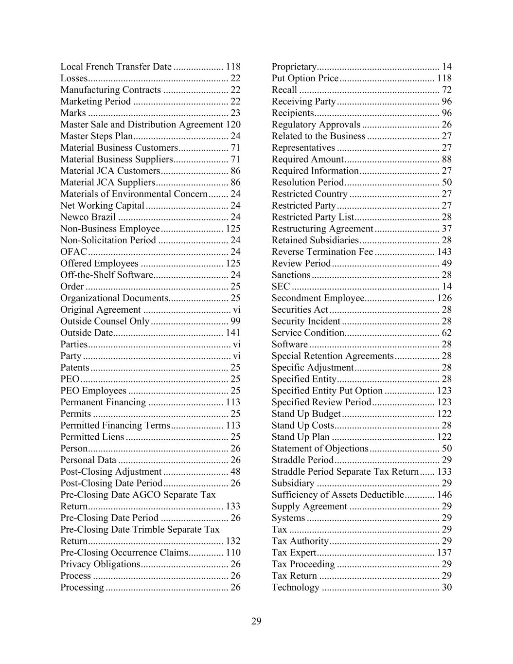 29 Local French Transfer Date .................... 118 Losses ........................................................ 22 Manufacturing Contracts .......................... 22 Marketing Period ...................................... 22 Marks ........................................................ 23 Master Sale and Distribution Agreement 120 Master Steps Plan ...................................... 24 Material Business Customers .................... 71 Material Business Suppliers ...................... 71 Material JCA Customers ........................... 86 Material JCA Suppliers ............................. 86 Materials of Environmental Concern ........ 24 Net Working Capital ................................. 24 Newco Brazil ............................................ 24 Non-Business Employee ......................... 125 Non-Solicitation Period ............................ 24 OFAC ........................................................ 24 Offered Employees ................................. 125 Off-the-Shelf Software.............................. 24 Order ......................................................... 25 Organizational Documents........................ 25 Original Agreement ................................... vi Outside Counsel Only ............................... 99 Outside Date............................................ 141 Parties ......................................................... vi Party ........................................................... vi Patents ....................................................... 25 PEO ........................................................... 25 PEO Employees ........................................ 25 Permanent Financing .............................. 113 Permits ...................................................... 25 Permitted Financing Terms ..................... 113 Permitted Liens ......................................... 25 Person ........................................................ 26 Personal Data ............................................ 26 Post-Closing Adjustment .......................... 48 Post-Closing Date Period .......................... 26 Pre-Closing Date AGCO Separate Tax Return ...................................................... 133 Pre-Closing Date Period ........................... 26 Pre-Closing Date Trimble Separate Tax Return ...................................................... 132 Pre-Closing Occurrence Claims .............. 110 Privacy Obligations ................................... 26 Process ...................................................... 26 Processing ................................................. 26 Proprietary................................................. 14 Put Option Price ...................................... 118 Recall ........................................................ 72 Receiving Party ......................................... 96 Recipients .................................................. 96 Regulatory Approvals ............................... 26 Related to the Business ............................. 27 Representatives ......................................... 27 Required Amount ...................................... 88 Required Information ................................ 27 Resolution Period ...................................... 50 Restricted Country .................................... 27 Restricted Party ......................................... 27 Restricted Party List .................................. 28 Restructuring Agreement .......................... 37 Retained Subsidiaries ................................ 28 Reverse Termination Fee ........................ 143 Review Period ........................................... 49 Sanctions ................................................... 28 SEC ........................................................... 14 Secondment Employee............................ 126 Securities Act ............................................ 28 Security Incident ....................................... 28 Service Condition...................................... 62 Software .................................................... 28 Special Retention Agreements .................. 28 Specific Adjustment .................................. 28 Specified Entity ......................................... 28 Specified Entity Put Option .................... 123 Specified Review Period ......................... 123 Stand Up Budget ..................................... 122 Stand Up Costs .......................................... 28 Stand Up Plan ......................................... 122 Statement of Objections ............................ 50 Straddle Period .......................................... 29 Straddle Period Separate Tax Return ...... 133 Subsidiary ................................................. 29 Sufficiency of Assets Deductible ............ 146 Supply Agreement .................................... 29 Systems ..................................................... 29 Tax ............................................................ 29 Tax Authority ............................................ 29 Tax Expert ............................................... 137 Tax Proceeding ......................................... 29 Tax Return ................................................ 29 Technology ............................................... 30