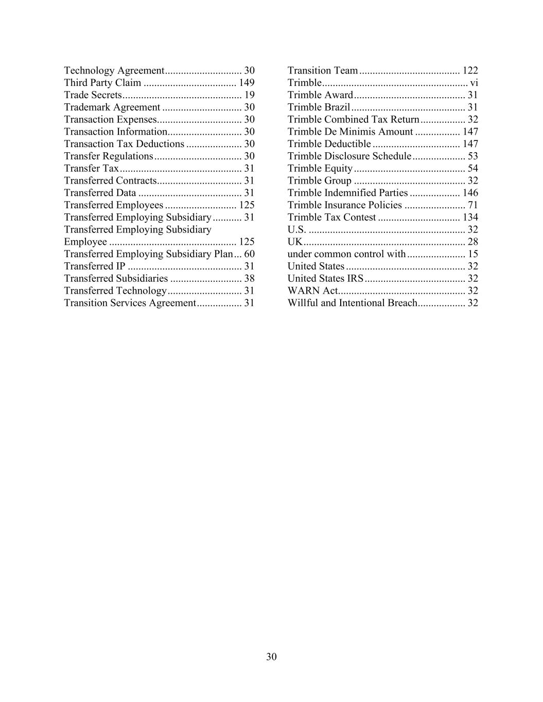 30 Technology Agreement ............................. 30 Third Party Claim ................................... 149 Trade Secrets ............................................. 19 Trademark Agreement .............................. 30 Transaction Expenses................................ 30 Transaction Information............................ 30 Transaction Tax Deductions ..................... 30 Transfer Regulations ................................. 30 Transfer Tax .............................................. 31 Transferred Contracts................................ 31 Transferred Data ....................................... 31 Transferred Employees ........................... 125 Transferred Employing Subsidiary ........... 31 Transferred Employing Subsidiary Employee ................................................ 125 Transferred Employing Subsidiary Plan ... 60 Transferred IP ........................................... 31 Transferred Subsidiaries ........................... 38 Transferred Technology ............................ 31 Transition Services Agreement ................. 31 Transition Team ...................................... 122 Trimble ....................................................... vi Trimble Award .......................................... 31 Trimble Brazil ........................................... 31 Trimble Combined Tax Return ................. 32 Trimble De Minimis Amount ................. 147 Trimble Deductible ................................. 147 Trimble Disclosure Schedule .................... 53 Trimble Equity .......................................... 54 Trimble Group .......................................... 32 Trimble Indemnified Parties ................... 146 Trimble Insurance Policies ....................... 71 Trimble Tax Contest ............................... 134 U.S. ........................................................... 32 UK ............................................................. 28 under common control with ...................... 15 United States ............................................. 32 United States IRS ...................................... 32 WARN Act................................................ 32 Willful and Intentional Breach .................. 32