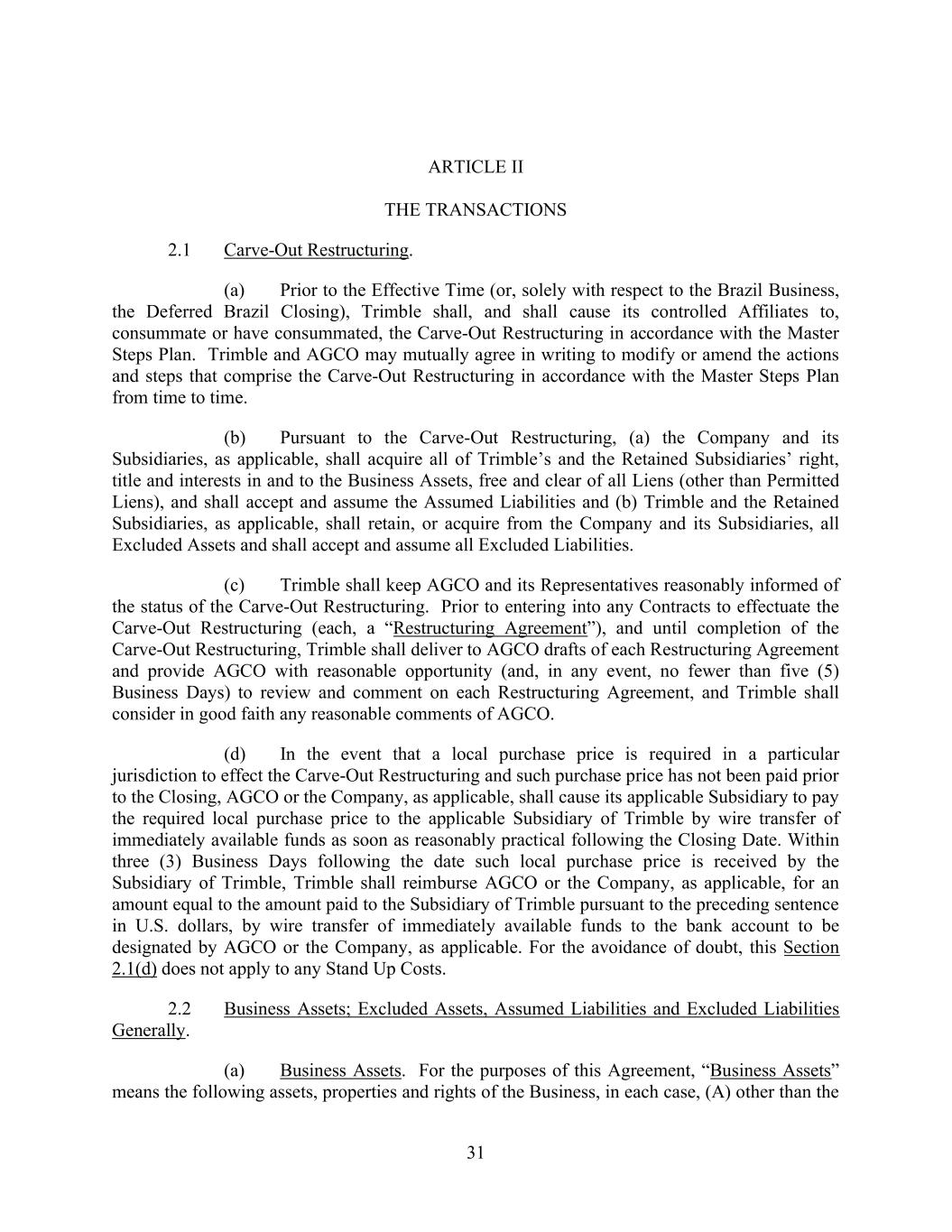 31 ARTICLE II THE TRANSACTIONS 2.1 Carve-Out Restructuring. (a) Prior to the Effective Time (or, solely with respect to the Brazil Business, the Deferred Brazil Closing), Trimble shall, and shall cause its controlled Affiliates to, consummate or have consummated, the Carve-Out Restructuring in accordance with the Master Steps Plan. Trimble and AGCO may mutually agree in writing to modify or amend the actions and steps that comprise the Carve-Out Restructuring in accordance with the Master Steps Plan from time to time. (b) Pursuant to the Carve-Out Restructuring, (a) the Company and its Subsidiaries, as applicable, shall acquire all of Trimble’s and the Retained Subsidiaries’ right, title and interests in and to the Business Assets, free and clear of all Liens (other than Permitted Liens), and shall accept and assume the Assumed Liabilities and (b) Trimble and the Retained Subsidiaries, as applicable, shall retain, or acquire from the Company and its Subsidiaries, all Excluded Assets and shall accept and assume all Excluded Liabilities. (c) Trimble shall keep AGCO and its Representatives reasonably informed of the status of the Carve-Out Restructuring. Prior to entering into any Contracts to effectuate the Carve-Out Restructuring (each, a “Restructuring Agreement”), and until completion of the Carve-Out Restructuring, Trimble shall deliver to AGCO drafts of each Restructuring Agreement and provide AGCO with reasonable opportunity (and, in any event, no fewer than five (5) Business Days) to review and comment on each Restructuring Agreement, and Trimble shall consider in good faith any reasonable comments of AGCO. (d) In the event that a local purchase price is required in a particular jurisdiction to effect the Carve-Out Restructuring and such purchase price has not been paid prior to the Closing, AGCO or the Company, as applicable, shall cause its applicable Subsidiary to pay the required local purchase price to the applicable Subsidiary of Trimble by wire transfer of immediately available funds as soon as reasonably practical following the Closing Date. Within three (3) Business Days following the date such local purchase price is received by the Subsidiary of Trimble, Trimble shall reimburse AGCO or the Company, as applicable, for an amount equal to the amount paid to the Subsidiary of Trimble pursuant to the preceding sentence in U.S. dollars, by wire transfer of immediately available funds to the bank account to be designated by AGCO or the Company, as applicable. For the avoidance of doubt, this Section 2.1(d) does not apply to any Stand Up Costs. 2.2 Business Assets; Excluded Assets, Assumed Liabilities and Excluded Liabilities Generally. (a) Business Assets. For the purposes of this Agreement, “Business Assets” means the following assets, properties and rights of the Business, in each case, (A) other than the
