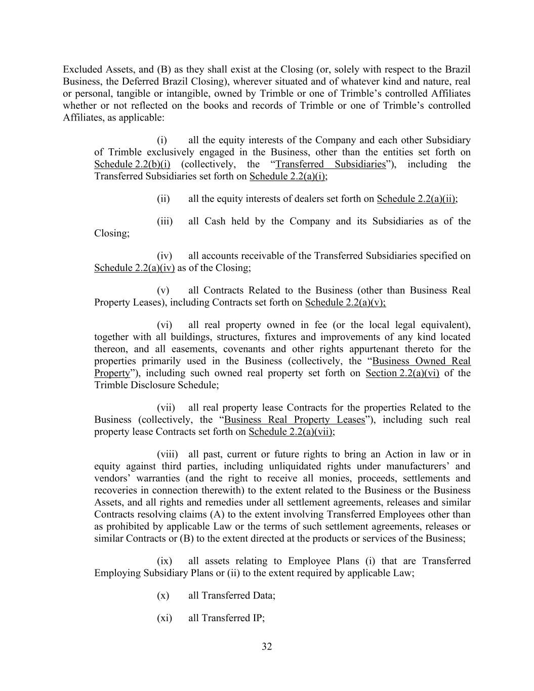 32 Excluded Assets, and (B) as they shall exist at the Closing (or, solely with respect to the Brazil Business, the Deferred Brazil Closing), wherever situated and of whatever kind and nature, real or personal, tangible or intangible, owned by Trimble or one of Trimble’s controlled Affiliates whether or not reflected on the books and records of Trimble or one of Trimble’s controlled Affiliates, as applicable: (i) all the equity interests of the Company and each other Subsidiary of Trimble exclusively engaged in the Business, other than the entities set forth on Schedule 2.2(b)(i) (collectively, the “Transferred Subsidiaries”), including the Transferred Subsidiaries set forth on Schedule 2.2(a)(i); (ii) all the equity interests of dealers set forth on Schedule 2.2(a)(ii); (iii) all Cash held by the Company and its Subsidiaries as of the Closing; (iv) all accounts receivable of the Transferred Subsidiaries specified on Schedule 2.2(a)(iv) as of the Closing; (v) all Contracts Related to the Business (other than Business Real Property Leases), including Contracts set forth on Schedule 2.2(a)(v); (vi) all real property owned in fee (or the local legal equivalent), together with all buildings, structures, fixtures and improvements of any kind located thereon, and all easements, covenants and other rights appurtenant thereto for the properties primarily used in the Business (collectively, the “Business Owned Real Property”), including such owned real property set forth on Section 2.2(a)(vi) of the Trimble Disclosure Schedule; (vii) all real property lease Contracts for the properties Related to the Business (collectively, the “Business Real Property Leases”), including such real property lease Contracts set forth on Schedule 2.2(a)(vii); (viii) all past, current or future rights to bring an Action in law or in equity against third parties, including unliquidated rights under manufacturers’ and vendors’ warranties (and the right to receive all monies, proceeds, settlements and recoveries in connection therewith) to the extent related to the Business or the Business Assets, and all rights and remedies under all settlement agreements, releases and similar Contracts resolving claims (A) to the extent involving Transferred Employees other than as prohibited by applicable Law or the terms of such settlement agreements, releases or similar Contracts or (B) to the extent directed at the products or services of the Business; (ix) all assets relating to Employee Plans (i) that are Transferred Employing Subsidiary Plans or (ii) to the extent required by applicable Law; (x) all Transferred Data; (xi) all Transferred IP;