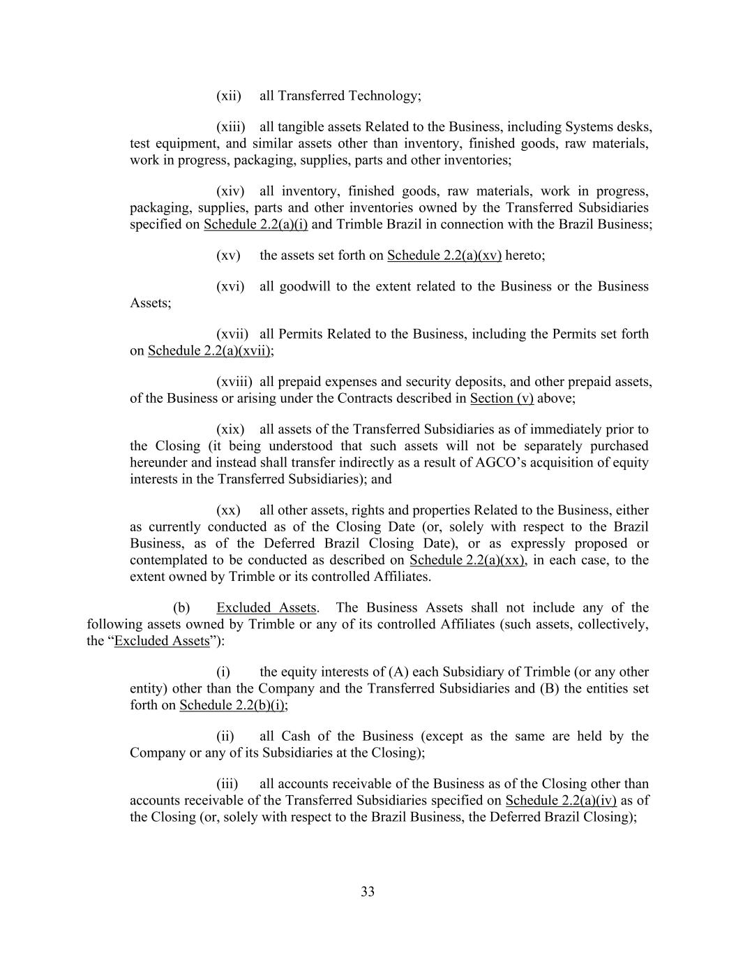 33 (xii) all Transferred Technology; (xiii) all tangible assets Related to the Business, including Systems desks, test equipment, and similar assets other than inventory, finished goods, raw materials, work in progress, packaging, supplies, parts and other inventories; (xiv) all inventory, finished goods, raw materials, work in progress, packaging, supplies, parts and other inventories owned by the Transferred Subsidiaries specified on Schedule 2.2(a)(i) and Trimble Brazil in connection with the Brazil Business; (xv) the assets set forth on Schedule 2.2(a)(xv) hereto; (xvi) all goodwill to the extent related to the Business or the Business Assets; (xvii) all Permits Related to the Business, including the Permits set forth on Schedule 2.2(a)(xvii); (xviii) all prepaid expenses and security deposits, and other prepaid assets, of the Business or arising under the Contracts described in Section (v) above; (xix) all assets of the Transferred Subsidiaries as of immediately prior to the Closing (it being understood that such assets will not be separately purchased hereunder and instead shall transfer indirectly as a result of AGCO’s acquisition of equity interests in the Transferred Subsidiaries); and (xx) all other assets, rights and properties Related to the Business, either as currently conducted as of the Closing Date (or, solely with respect to the Brazil Business, as of the Deferred Brazil Closing Date), or as expressly proposed or contemplated to be conducted as described on Schedule 2.2(a)(xx), in each case, to the extent owned by Trimble or its controlled Affiliates. (b) Excluded Assets. The Business Assets shall not include any of the following assets owned by Trimble or any of its controlled Affiliates (such assets, collectively, the “Excluded Assets”): (i) the equity interests of (A) each Subsidiary of Trimble (or any other entity) other than the Company and the Transferred Subsidiaries and (B) the entities set forth on Schedule 2.2(b)(i); (ii) all Cash of the Business (except as the same are held by the Company or any of its Subsidiaries at the Closing); (iii) all accounts receivable of the Business as of the Closing other than accounts receivable of the Transferred Subsidiaries specified on Schedule 2.2(a)(iv) as of the Closing (or, solely with respect to the Brazil Business, the Deferred Brazil Closing);