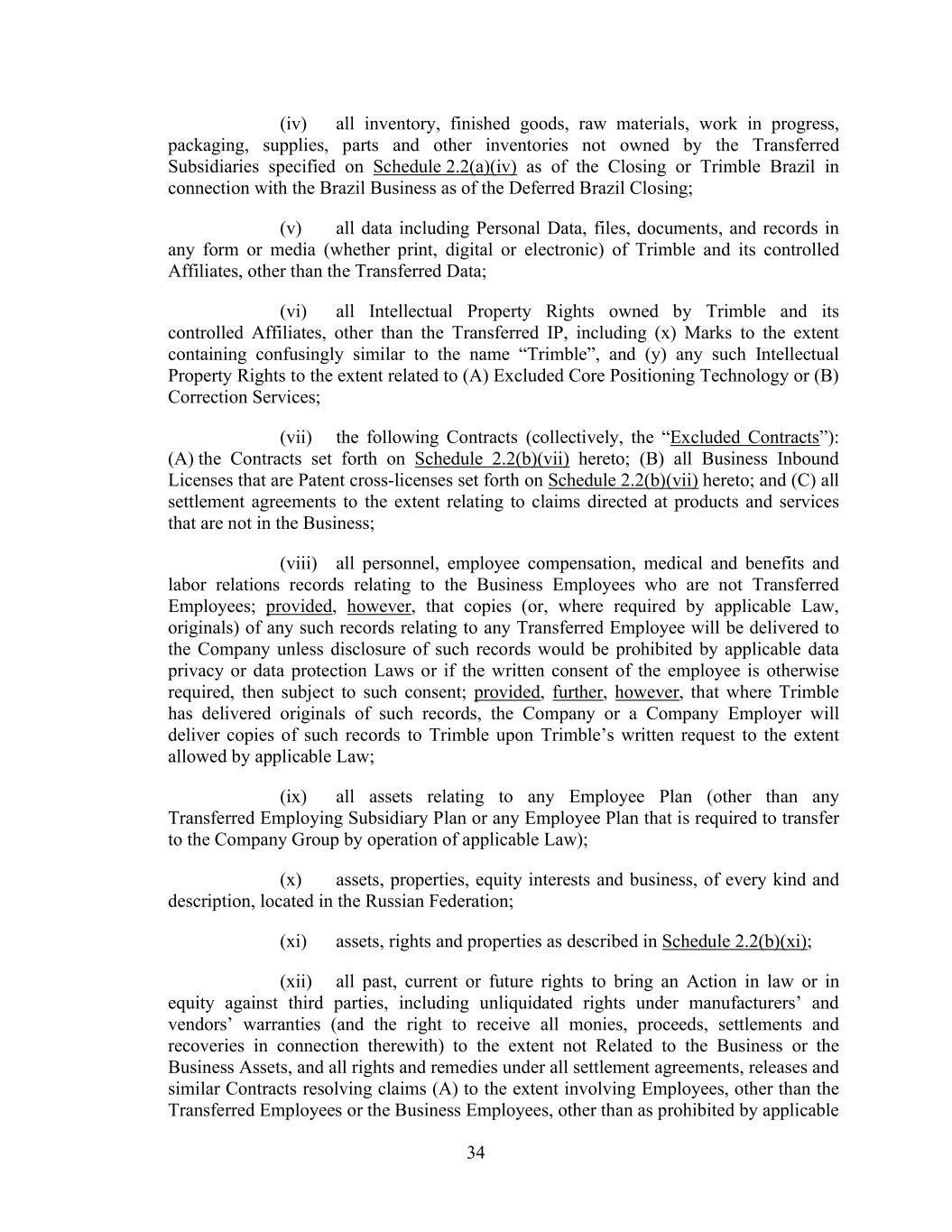 34 (iv) all inventory, finished goods, raw materials, work in progress, packaging, supplies, parts and other inventories not owned by the Transferred Subsidiaries specified on Schedule 2.2(a)(iv) as of the Closing or Trimble Brazil in connection with the Brazil Business as of the Deferred Brazil Closing; (v) all data including Personal Data, files, documents, and records in any form or media (whether print, digital or electronic) of Trimble and its controlled Affiliates, other than the Transferred Data; (vi) all Intellectual Property Rights owned by Trimble and its controlled Affiliates, other than the Transferred IP, including (x) Marks to the extent containing confusingly similar to the name “Trimble”, and (y) any such Intellectual Property Rights to the extent related to (A) Excluded Core Positioning Technology or (B) Correction Services; (vii) the following Contracts (collectively, the “Excluded Contracts”): (A) the Contracts set forth on Schedule 2.2(b)(vii) hereto; (B) all Business Inbound Licenses that are Patent cross-licenses set forth on Schedule 2.2(b)(vii) hereto; and (C) all settlement agreements to the extent relating to claims directed at products and services that are not in the Business; (viii) all personnel, employee compensation, medical and benefits and labor relations records relating to the Business Employees who are not Transferred Employees; provided, however, that copies (or, where required by applicable Law, originals) of any such records relating to any Transferred Employee will be delivered to the Company unless disclosure of such records would be prohibited by applicable data privacy or data protection Laws or if the written consent of the employee is otherwise required, then subject to such consent; provided, further, however, that where Trimble has delivered originals of such records, the Company or a Company Employer will deliver copies of such records to Trimble upon Trimble’s written request to the extent allowed by applicable Law; (ix) all assets relating to any Employee Plan (other than any Transferred Employing Subsidiary Plan or any Employee Plan that is required to transfer to the Company Group by operation of applicable Law); (x) assets, properties, equity interests and business, of every kind and description, located in the Russian Federation; (xi) assets, rights and properties as described in Schedule 2.2(b)(xi); (xii) all past, current or future rights to bring an Action in law or in equity against third parties, including unliquidated rights under manufacturers’ and vendors’ warranties (and the right to receive all monies, proceeds, settlements and recoveries in connection therewith) to the extent not Related to the Business or the Business Assets, and all rights and remedies under all settlement agreements, releases and similar Contracts resolving claims (A) to the extent involving Employees, other than the Transferred Employees or the Business Employees, other than as prohibited by applicable