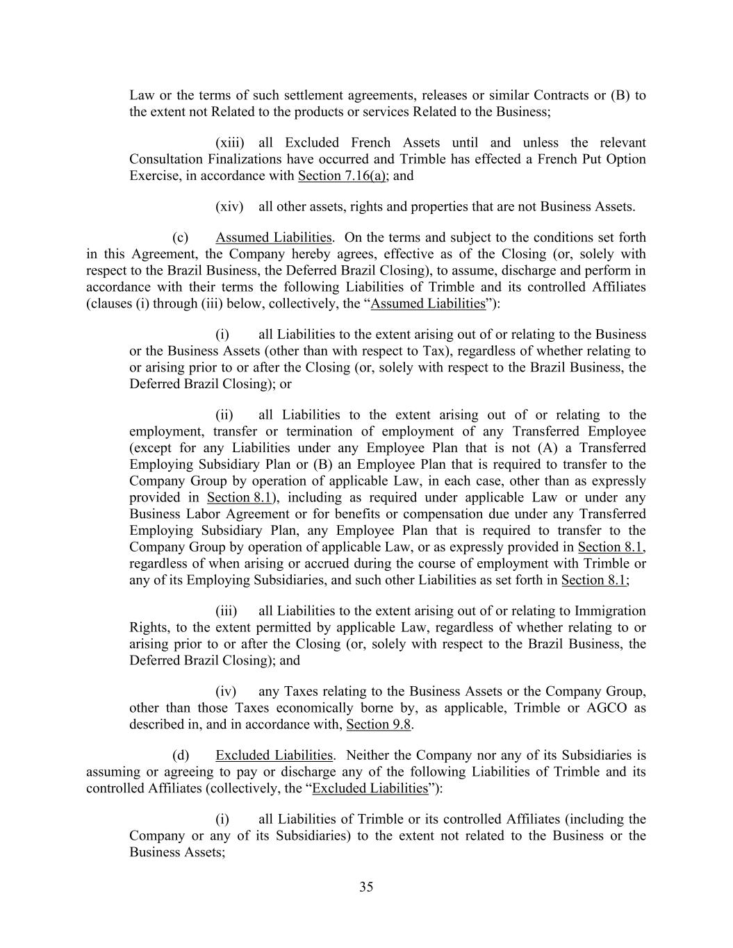 35 Law or the terms of such settlement agreements, releases or similar Contracts or (B) to the extent not Related to the products or services Related to the Business; (xiii) all Excluded French Assets until and unless the relevant Consultation Finalizations have occurred and Trimble has effected a French Put Option Exercise, in accordance with Section 7.16(a); and (xiv) all other assets, rights and properties that are not Business Assets. (c) Assumed Liabilities. On the terms and subject to the conditions set forth in this Agreement, the Company hereby agrees, effective as of the Closing (or, solely with respect to the Brazil Business, the Deferred Brazil Closing), to assume, discharge and perform in accordance with their terms the following Liabilities of Trimble and its controlled Affiliates (clauses (i) through (iii) below, collectively, the “Assumed Liabilities”): (i) all Liabilities to the extent arising out of or relating to the Business or the Business Assets (other than with respect to Tax), regardless of whether relating to or arising prior to or after the Closing (or, solely with respect to the Brazil Business, the Deferred Brazil Closing); or (ii) all Liabilities to the extent arising out of or relating to the employment, transfer or termination of employment of any Transferred Employee (except for any Liabilities under any Employee Plan that is not (A) a Transferred Employing Subsidiary Plan or (B) an Employee Plan that is required to transfer to the Company Group by operation of applicable Law, in each case, other than as expressly provided in Section 8.1), including as required under applicable Law or under any Business Labor Agreement or for benefits or compensation due under any Transferred Employing Subsidiary Plan, any Employee Plan that is required to transfer to the Company Group by operation of applicable Law, or as expressly provided in Section 8.1, regardless of when arising or accrued during the course of employment with Trimble or any of its Employing Subsidiaries, and such other Liabilities as set forth in Section 8.1; (iii) all Liabilities to the extent arising out of or relating to Immigration Rights, to the extent permitted by applicable Law, regardless of whether relating to or arising prior to or after the Closing (or, solely with respect to the Brazil Business, the Deferred Brazil Closing); and (iv) any Taxes relating to the Business Assets or the Company Group, other than those Taxes economically borne by, as applicable, Trimble or AGCO as described in, and in accordance with, Section 9.8. (d) Excluded Liabilities. Neither the Company nor any of its Subsidiaries is assuming or agreeing to pay or discharge any of the following Liabilities of Trimble and its controlled Affiliates (collectively, the “Excluded Liabilities”): (i) all Liabilities of Trimble or its controlled Affiliates (including the Company or any of its Subsidiaries) to the extent not related to the Business or the Business Assets;