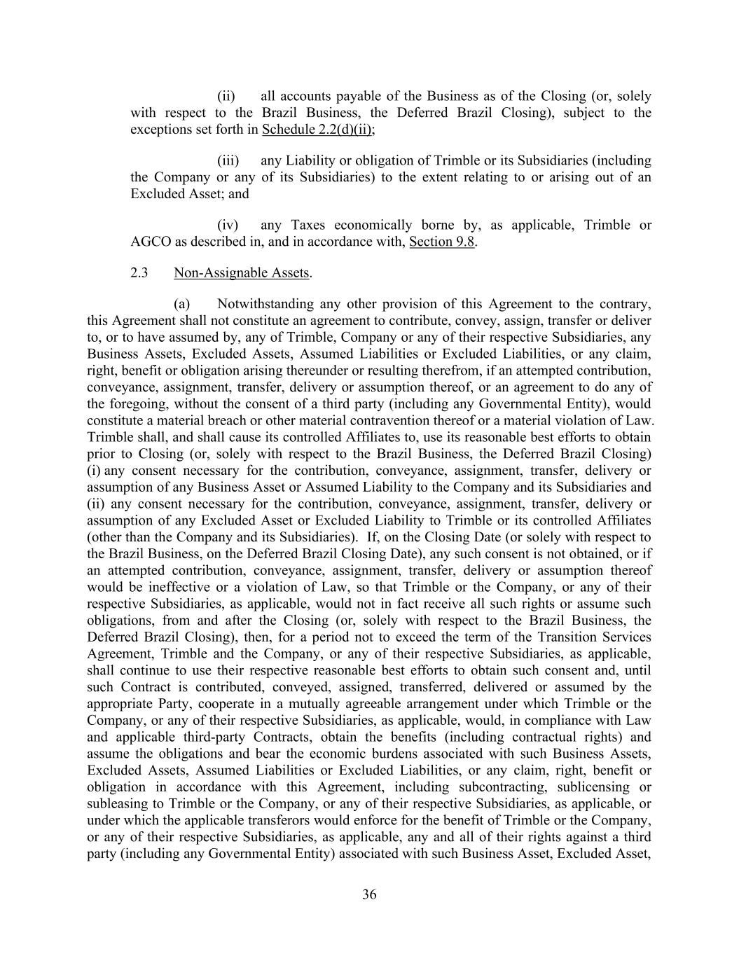 36 (ii) all accounts payable of the Business as of the Closing (or, solely with respect to the Brazil Business, the Deferred Brazil Closing), subject to the exceptions set forth in Schedule 2.2(d)(ii); (iii) any Liability or obligation of Trimble or its Subsidiaries (including the Company or any of its Subsidiaries) to the extent relating to or arising out of an Excluded Asset; and (iv) any Taxes economically borne by, as applicable, Trimble or AGCO as described in, and in accordance with, Section 9.8. 2.3 Non-Assignable Assets. (a) Notwithstanding any other provision of this Agreement to the contrary, this Agreement shall not constitute an agreement to contribute, convey, assign, transfer or deliver to, or to have assumed by, any of Trimble, Company or any of their respective Subsidiaries, any Business Assets, Excluded Assets, Assumed Liabilities or Excluded Liabilities, or any claim, right, benefit or obligation arising thereunder or resulting therefrom, if an attempted contribution, conveyance, assignment, transfer, delivery or assumption thereof, or an agreement to do any of the foregoing, without the consent of a third party (including any Governmental Entity), would constitute a material breach or other material contravention thereof or a material violation of Law. Trimble shall, and shall cause its controlled Affiliates to, use its reasonable best efforts to obtain prior to Closing (or, solely with respect to the Brazil Business, the Deferred Brazil Closing) (i) any consent necessary for the contribution, conveyance, assignment, transfer, delivery or assumption of any Business Asset or Assumed Liability to the Company and its Subsidiaries and (ii) any consent necessary for the contribution, conveyance, assignment, transfer, delivery or assumption of any Excluded Asset or Excluded Liability to Trimble or its controlled Affiliates (other than the Company and its Subsidiaries). If, on the Closing Date (or solely with respect to the Brazil Business, on the Deferred Brazil Closing Date), any such consent is not obtained, or if an attempted contribution, conveyance, assignment, transfer, delivery or assumption thereof would be ineffective or a violation of Law, so that Trimble or the Company, or any of their respective Subsidiaries, as applicable, would not in fact receive all such rights or assume such obligations, from and after the Closing (or, solely with respect to the Brazil Business, the Deferred Brazil Closing), then, for a period not to exceed the term of the Transition Services Agreement, Trimble and the Company, or any of their respective Subsidiaries, as applicable, shall continue to use their respective reasonable best efforts to obtain such consent and, until such Contract is contributed, conveyed, assigned, transferred, delivered or assumed by the appropriate Party, cooperate in a mutually agreeable arrangement under which Trimble or the Company, or any of their respective Subsidiaries, as applicable, would, in compliance with Law and applicable third-party Contracts, obtain the benefits (including contractual rights) and assume the obligations and bear the economic burdens associated with such Business Assets, Excluded Assets, Assumed Liabilities or Excluded Liabilities, or any claim, right, benefit or obligation in accordance with this Agreement, including subcontracting, sublicensing or subleasing to Trimble or the Company, or any of their respective Subsidiaries, as applicable, or under which the applicable transferors would enforce for the benefit of Trimble or the Company, or any of their respective Subsidiaries, as applicable, any and all of their rights against a third party (including any Governmental Entity) associated with such Business Asset, Excluded Asset,