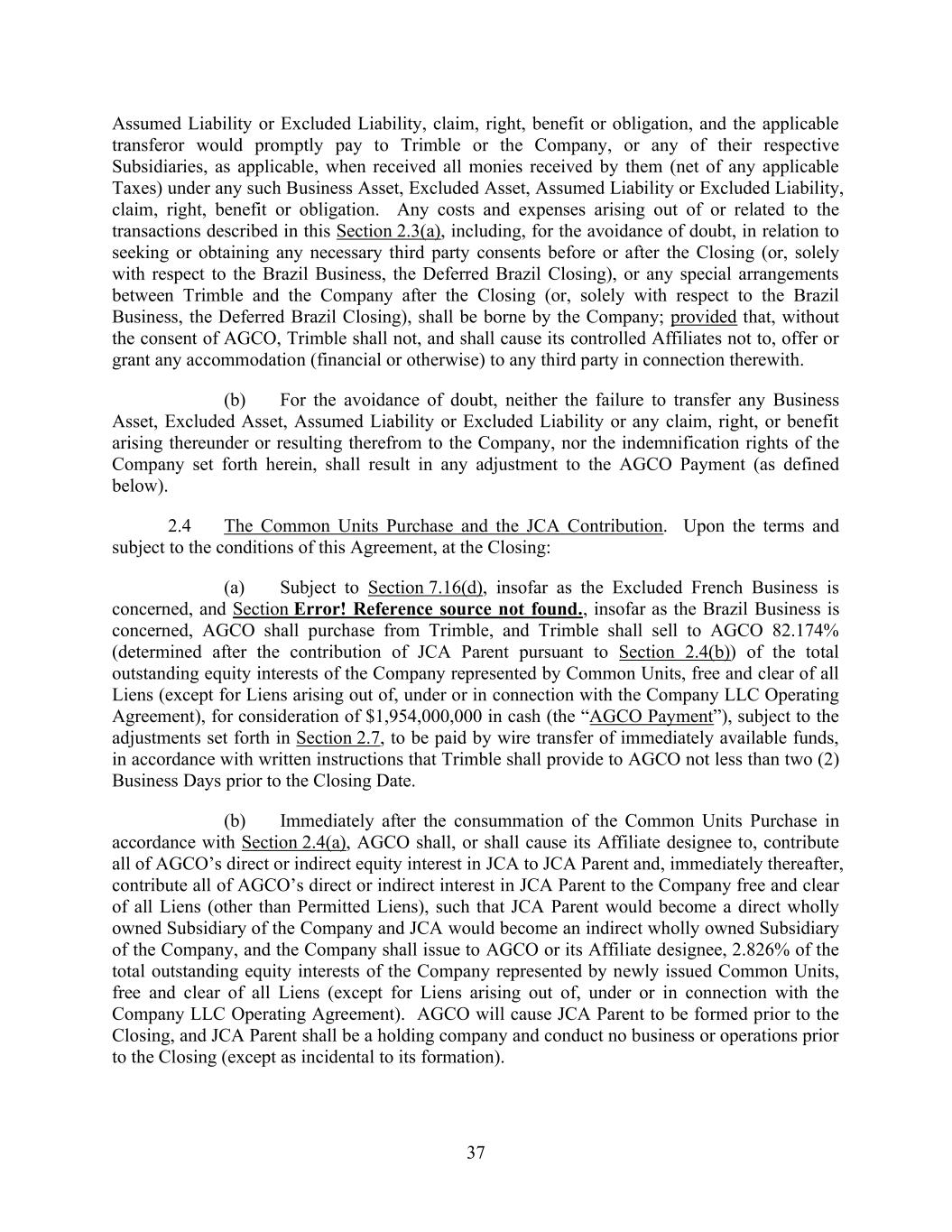 37 Assumed Liability or Excluded Liability, claim, right, benefit or obligation, and the applicable transferor would promptly pay to Trimble or the Company, or any of their respective Subsidiaries, as applicable, when received all monies received by them (net of any applicable Taxes) under any such Business Asset, Excluded Asset, Assumed Liability or Excluded Liability, claim, right, benefit or obligation. Any costs and expenses arising out of or related to the transactions described in this Section 2.3(a), including, for the avoidance of doubt, in relation to seeking or obtaining any necessary third party consents before or after the Closing (or, solely with respect to the Brazil Business, the Deferred Brazil Closing), or any special arrangements between Trimble and the Company after the Closing (or, solely with respect to the Brazil Business, the Deferred Brazil Closing), shall be borne by the Company; provided that, without the consent of AGCO, Trimble shall not, and shall cause its controlled Affiliates not to, offer or grant any accommodation (financial or otherwise) to any third party in connection therewith. (b) For the avoidance of doubt, neither the failure to transfer any Business Asset, Excluded Asset, Assumed Liability or Excluded Liability or any claim, right, or benefit arising thereunder or resulting therefrom to the Company, nor the indemnification rights of the Company set forth herein, shall result in any adjustment to the AGCO Payment (as defined below). 2.4 The Common Units Purchase and the JCA Contribution. Upon the terms and subject to the conditions of this Agreement, at the Closing: (a) Subject to Section 7.16(d), insofar as the Excluded French Business is concerned, and Section Error! Reference source not found., insofar as the Brazil Business is concerned, AGCO shall purchase from Trimble, and Trimble shall sell to AGCO 82.174% (determined after the contribution of JCA Parent pursuant to Section 2.4(b)) of the total outstanding equity interests of the Company represented by Common Units, free and clear of all Liens (except for Liens arising out of, under or in connection with the Company LLC Operating Agreement), for consideration of $1,954,000,000 in cash (the “AGCO Payment”), subject to the adjustments set forth in Section 2.7, to be paid by wire transfer of immediately available funds, in accordance with written instructions that Trimble shall provide to AGCO not less than two (2) Business Days prior to the Closing Date. (b) Immediately after the consummation of the Common Units Purchase in accordance with Section 2.4(a), AGCO shall, or shall cause its Affiliate designee to, contribute all of AGCO’s direct or indirect equity interest in JCA to JCA Parent and, immediately thereafter, contribute all of AGCO’s direct or indirect interest in JCA Parent to the Company free and clear of all Liens (other than Permitted Liens), such that JCA Parent would become a direct wholly owned Subsidiary of the Company and JCA would become an indirect wholly owned Subsidiary of the Company, and the Company shall issue to AGCO or its Affiliate designee, 2.826% of the total outstanding equity interests of the Company represented by newly issued Common Units, free and clear of all Liens (except for Liens arising out of, under or in connection with the Company LLC Operating Agreement). AGCO will cause JCA Parent to be formed prior to the Closing, and JCA Parent shall be a holding company and conduct no business or operations prior to the Closing (except as incidental to its formation).