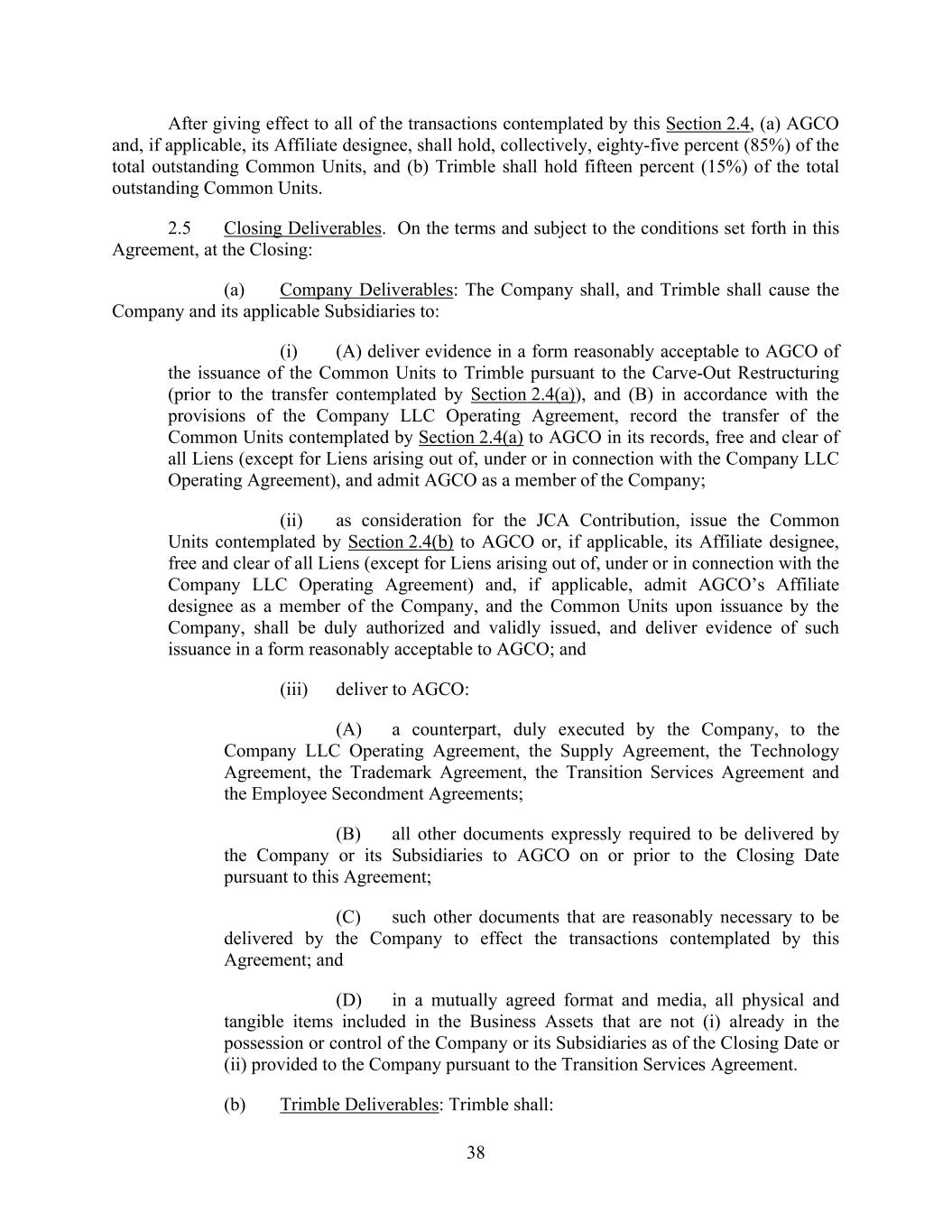 38 After giving effect to all of the transactions contemplated by this Section 2.4, (a) AGCO and, if applicable, its Affiliate designee, shall hold, collectively, eighty-five percent (85%) of the total outstanding Common Units, and (b) Trimble shall hold fifteen percent (15%) of the total outstanding Common Units. 2.5 Closing Deliverables. On the terms and subject to the conditions set forth in this Agreement, at the Closing: (a) Company Deliverables: The Company shall, and Trimble shall cause the Company and its applicable Subsidiaries to: (i) (A) deliver evidence in a form reasonably acceptable to AGCO of the issuance of the Common Units to Trimble pursuant to the Carve-Out Restructuring (prior to the transfer contemplated by Section 2.4(a)), and (B) in accordance with the provisions of the Company LLC Operating Agreement, record the transfer of the Common Units contemplated by Section 2.4(a) to AGCO in its records, free and clear of all Liens (except for Liens arising out of, under or in connection with the Company LLC Operating Agreement), and admit AGCO as a member of the Company; (ii) as consideration for the JCA Contribution, issue the Common Units contemplated by Section 2.4(b) to AGCO or, if applicable, its Affiliate designee, free and clear of all Liens (except for Liens arising out of, under or in connection with the Company LLC Operating Agreement) and, if applicable, admit AGCO’s Affiliate designee as a member of the Company, and the Common Units upon issuance by the Company, shall be duly authorized and validly issued, and deliver evidence of such issuance in a form reasonably acceptable to AGCO; and (iii) deliver to AGCO: (A) a counterpart, duly executed by the Company, to the Company LLC Operating Agreement, the Supply Agreement, the Technology Agreement, the Trademark Agreement, the Transition Services Agreement and the Employee Secondment Agreements; (B) all other documents expressly required to be delivered by the Company or its Subsidiaries to AGCO on or prior to the Closing Date pursuant to this Agreement; (C) such other documents that are reasonably necessary to be delivered by the Company to effect the transactions contemplated by this Agreement; and (D) in a mutually agreed format and media, all physical and tangible items included in the Business Assets that are not (i) already in the possession or control of the Company or its Subsidiaries as of the Closing Date or (ii) provided to the Company pursuant to the Transition Services Agreement. (b) Trimble Deliverables: Trimble shall: