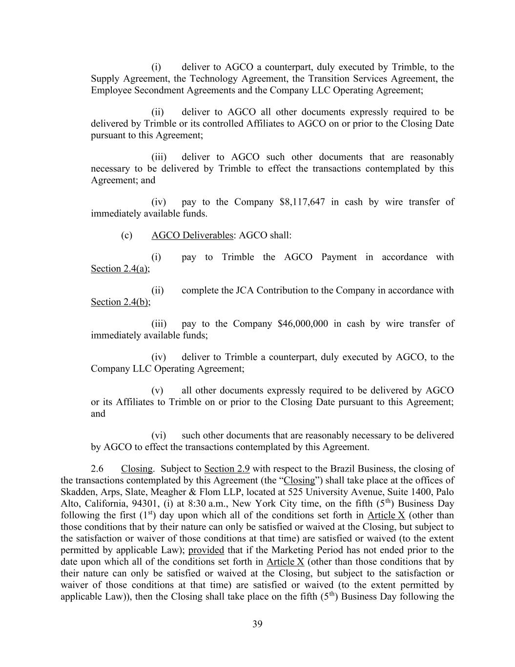 39 (i) deliver to AGCO a counterpart, duly executed by Trimble, to the Supply Agreement, the Technology Agreement, the Transition Services Agreement, the Employee Secondment Agreements and the Company LLC Operating Agreement; (ii) deliver to AGCO all other documents expressly required to be delivered by Trimble or its controlled Affiliates to AGCO on or prior to the Closing Date pursuant to this Agreement; (iii) deliver to AGCO such other documents that are reasonably necessary to be delivered by Trimble to effect the transactions contemplated by this Agreement; and (iv) pay to the Company $8,117,647 in cash by wire transfer of immediately available funds. (c) AGCO Deliverables: AGCO shall: (i) pay to Trimble the AGCO Payment in accordance with Section 2.4(a); (ii) complete the JCA Contribution to the Company in accordance with Section 2.4(b); (iii) pay to the Company $46,000,000 in cash by wire transfer of immediately available funds; (iv) deliver to Trimble a counterpart, duly executed by AGCO, to the Company LLC Operating Agreement; (v) all other documents expressly required to be delivered by AGCO or its Affiliates to Trimble on or prior to the Closing Date pursuant to this Agreement; and (vi) such other documents that are reasonably necessary to be delivered by AGCO to effect the transactions contemplated by this Agreement. 2.6 Closing. Subject to Section 2.9 with respect to the Brazil Business, the closing of the transactions contemplated by this Agreement (the “Closing”) shall take place at the offices of Skadden, Arps, Slate, Meagher & Flom LLP, located at 525 University Avenue, Suite 1400, Palo Alto, California, 94301, (i) at 8:30 a.m., New York City time, on the fifth (5th) Business Day following the first (1st) day upon which all of the conditions set forth in Article X (other than those conditions that by their nature can only be satisfied or waived at the Closing, but subject to the satisfaction or waiver of those conditions at that time) are satisfied or waived (to the extent permitted by applicable Law); provided that if the Marketing Period has not ended prior to the date upon which all of the conditions set forth in Article X (other than those conditions that by their nature can only be satisfied or waived at the Closing, but subject to the satisfaction or waiver of those conditions at that time) are satisfied or waived (to the extent permitted by applicable Law)), then the Closing shall take place on the fifth (5th) Business Day following the