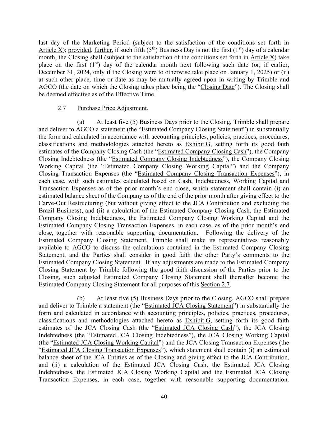 40 last day of the Marketing Period (subject to the satisfaction of the conditions set forth in Article X); provided, further, if such fifth (5th) Business Day is not the first (1st) day of a calendar month, the Closing shall (subject to the satisfaction of the conditions set forth in Article X) take place on the first (1st) day of the calendar month next following such date (or, if earlier, December 31, 2024, only if the Closing were to otherwise take place on January 1, 2025) or (ii) at such other place, time or date as may be mutually agreed upon in writing by Trimble and AGCO (the date on which the Closing takes place being the “Closing Date”). The Closing shall be deemed effective as of the Effective Time. 2.7 Purchase Price Adjustment. (a) At least five (5) Business Days prior to the Closing, Trimble shall prepare and deliver to AGCO a statement (the “Estimated Company Closing Statement”) in substantially the form and calculated in accordance with accounting principles, policies, practices, procedures, classifications and methodologies attached hereto as Exhibit G, setting forth its good faith estimates of the Company Closing Cash (the “Estimated Company Closing Cash”), the Company Closing Indebtedness (the “Estimated Company Closing Indebtedness”), the Company Closing Working Capital (the “Estimated Company Closing Working Capital”) and the Company Closing Transaction Expenses (the “Estimated Company Closing Transaction Expenses”), in each case, with such estimates calculated based on Cash, Indebtedness, Working Capital and Transaction Expenses as of the prior month’s end close, which statement shall contain (i) an estimated balance sheet of the Company as of the end of the prior month after giving effect to the Carve-Out Restructuring (but without giving effect to the JCA Contribution and excluding the Brazil Business), and (ii) a calculation of the Estimated Company Closing Cash, the Estimated Company Closing Indebtedness, the Estimated Company Closing Working Capital and the Estimated Company Closing Transaction Expenses, in each case, as of the prior month’s end close, together with reasonable supporting documentation. Following the delivery of the Estimated Company Closing Statement, Trimble shall make its representatives reasonably available to AGCO to discuss the calculations contained in the Estimated Company Closing Statement, and the Parties shall consider in good faith the other Party’s comments to the Estimated Company Closing Statement. If any adjustments are made to the Estimated Company Closing Statement by Trimble following the good faith discussion of the Parties prior to the Closing, such adjusted Estimated Company Closing Statement shall thereafter become the Estimated Company Closing Statement for all purposes of this Section 2.7. (b) At least five (5) Business Days prior to the Closing, AGCO shall prepare and deliver to Trimble a statement (the “Estimated JCA Closing Statement”) in substantially the form and calculated in accordance with accounting principles, policies, practices, procedures, classifications and methodologies attached hereto as Exhibit G, setting forth its good faith estimates of the JCA Closing Cash (the “Estimated JCA Closing Cash”), the JCA Closing Indebtedness (the “Estimated JCA Closing Indebtedness”), the JCA Closing Working Capital (the “Estimated JCA Closing Working Capital”) and the JCA Closing Transaction Expenses (the “Estimated JCA Closing Transaction Expenses”), which statement shall contain (i) an estimated balance sheet of the JCA Entities as of the Closing and giving effect to the JCA Contribution, and (ii) a calculation of the Estimated JCA Closing Cash, the Estimated JCA Closing Indebtedness, the Estimated JCA Closing Working Capital and the Estimated JCA Closing Transaction Expenses, in each case, together with reasonable supporting documentation.