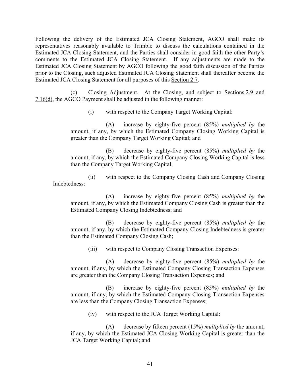 41 Following the delivery of the Estimated JCA Closing Statement, AGCO shall make its representatives reasonably available to Trimble to discuss the calculations contained in the Estimated JCA Closing Statement, and the Parties shall consider in good faith the other Party’s comments to the Estimated JCA Closing Statement. If any adjustments are made to the Estimated JCA Closing Statement by AGCO following the good faith discussion of the Parties prior to the Closing, such adjusted Estimated JCA Closing Statement shall thereafter become the Estimated JCA Closing Statement for all purposes of this Section 2.7. (c) Closing Adjustment. At the Closing, and subject to Sections 2.9 and 7.16(d), the AGCO Payment shall be adjusted in the following manner: (i) with respect to the Company Target Working Capital: (A) increase by eighty-five percent (85%) multiplied by the amount, if any, by which the Estimated Company Closing Working Capital is greater than the Company Target Working Capital; and (B) decrease by eighty-five percent (85%) multiplied by the amount, if any, by which the Estimated Company Closing Working Capital is less than the Company Target Working Capital; (ii) with respect to the Company Closing Cash and Company Closing Indebtedness: (A) increase by eighty-five percent (85%) multiplied by the amount, if any, by which the Estimated Company Closing Cash is greater than the Estimated Company Closing Indebtedness; and (B) decrease by eighty-five percent (85%) multiplied by the amount, if any, by which the Estimated Company Closing Indebtedness is greater than the Estimated Company Closing Cash; (iii) with respect to Company Closing Transaction Expenses: (A) decrease by eighty-five percent (85%) multiplied by the amount, if any, by which the Estimated Company Closing Transaction Expenses are greater than the Company Closing Transaction Expenses; and (B) increase by eighty-five percent (85%) multiplied by the amount, if any, by which the Estimated Company Closing Transaction Expenses are less than the Company Closing Transaction Expenses; (iv) with respect to the JCA Target Working Capital: (A) decrease by fifteen percent (15%) multiplied by the amount, if any, by which the Estimated JCA Closing Working Capital is greater than the JCA Target Working Capital; and