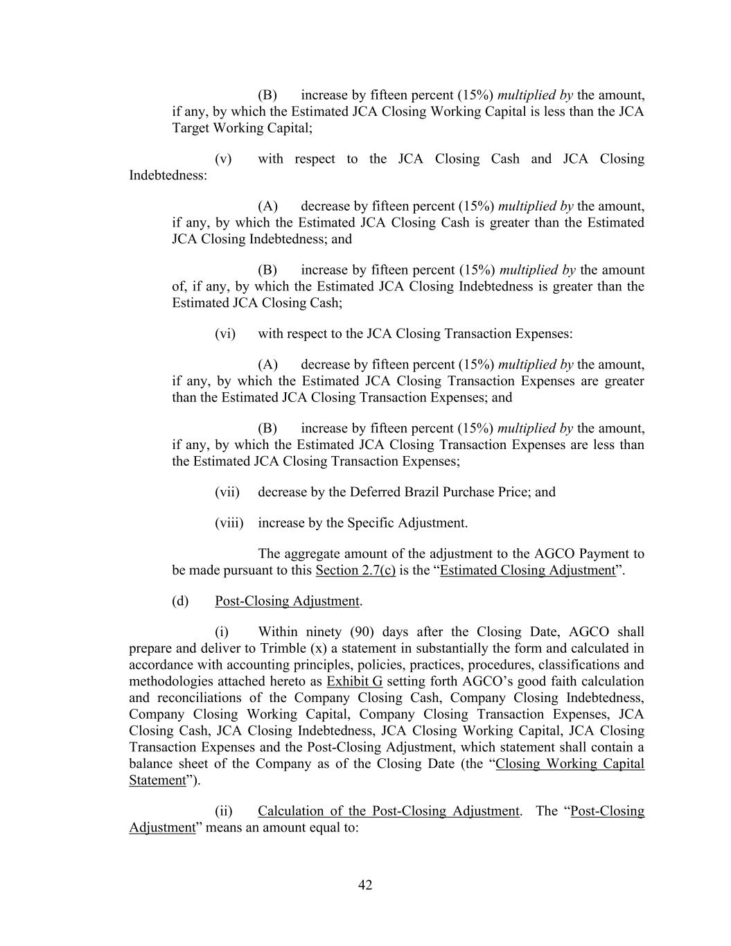 42 (B) increase by fifteen percent (15%) multiplied by the amount, if any, by which the Estimated JCA Closing Working Capital is less than the JCA Target Working Capital; (v) with respect to the JCA Closing Cash and JCA Closing Indebtedness: (A) decrease by fifteen percent (15%) multiplied by the amount, if any, by which the Estimated JCA Closing Cash is greater than the Estimated JCA Closing Indebtedness; and (B) increase by fifteen percent (15%) multiplied by the amount of, if any, by which the Estimated JCA Closing Indebtedness is greater than the Estimated JCA Closing Cash; (vi) with respect to the JCA Closing Transaction Expenses: (A) decrease by fifteen percent (15%) multiplied by the amount, if any, by which the Estimated JCA Closing Transaction Expenses are greater than the Estimated JCA Closing Transaction Expenses; and (B) increase by fifteen percent (15%) multiplied by the amount, if any, by which the Estimated JCA Closing Transaction Expenses are less than the Estimated JCA Closing Transaction Expenses; (vii) decrease by the Deferred Brazil Purchase Price; and (viii) increase by the Specific Adjustment. The aggregate amount of the adjustment to the AGCO Payment to be made pursuant to this Section 2.7(c) is the “Estimated Closing Adjustment”. (d) Post-Closing Adjustment. (i) Within ninety (90) days after the Closing Date, AGCO shall prepare and deliver to Trimble (x) a statement in substantially the form and calculated in accordance with accounting principles, policies, practices, procedures, classifications and methodologies attached hereto as Exhibit G setting forth AGCO’s good faith calculation and reconciliations of the Company Closing Cash, Company Closing Indebtedness, Company Closing Working Capital, Company Closing Transaction Expenses, JCA Closing Cash, JCA Closing Indebtedness, JCA Closing Working Capital, JCA Closing Transaction Expenses and the Post-Closing Adjustment, which statement shall contain a balance sheet of the Company as of the Closing Date (the “Closing Working Capital Statement”). (ii) Calculation of the Post-Closing Adjustment. The “Post-Closing Adjustment” means an amount equal to: