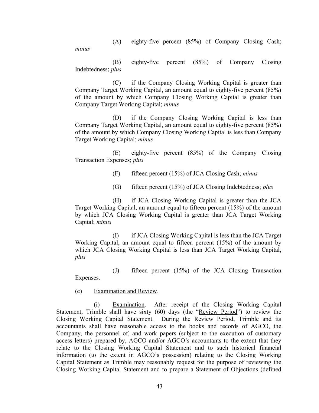 43 (A) eighty-five percent (85%) of Company Closing Cash; minus (B) eighty-five percent (85%) of Company Closing Indebtedness; plus (C) if the Company Closing Working Capital is greater than Company Target Working Capital, an amount equal to eighty-five percent (85%) of the amount by which Company Closing Working Capital is greater than Company Target Working Capital; minus (D) if the Company Closing Working Capital is less than Company Target Working Capital, an amount equal to eighty-five percent (85%) of the amount by which Company Closing Working Capital is less than Company Target Working Capital; minus (E) eighty-five percent (85%) of the Company Closing Transaction Expenses; plus (F) fifteen percent (15%) of JCA Closing Cash; minus (G) fifteen percent (15%) of JCA Closing Indebtedness; plus (H) if JCA Closing Working Capital is greater than the JCA Target Working Capital, an amount equal to fifteen percent (15%) of the amount by which JCA Closing Working Capital is greater than JCA Target Working Capital; minus (I) if JCA Closing Working Capital is less than the JCA Target Working Capital, an amount equal to fifteen percent (15%) of the amount by which JCA Closing Working Capital is less than JCA Target Working Capital, plus (J) fifteen percent (15%) of the JCA Closing Transaction Expenses. (e) Examination and Review. (i) Examination. After receipt of the Closing Working Capital Statement, Trimble shall have sixty (60) days (the “Review Period”) to review the Closing Working Capital Statement. During the Review Period, Trimble and its accountants shall have reasonable access to the books and records of AGCO, the Company, the personnel of, and work papers (subject to the execution of customary access letters) prepared by, AGCO and/or AGCO’s accountants to the extent that they relate to the Closing Working Capital Statement and to such historical financial information (to the extent in AGCO’s possession) relating to the Closing Working Capital Statement as Trimble may reasonably request for the purpose of reviewing the Closing Working Capital Statement and to prepare a Statement of Objections (defined