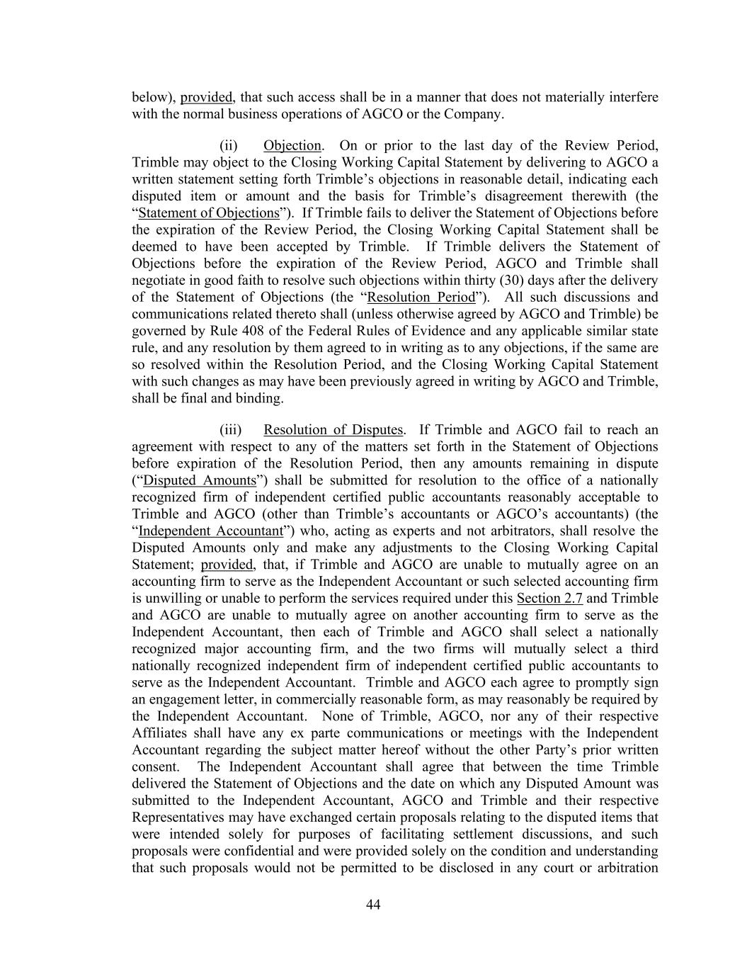 44 below), provided, that such access shall be in a manner that does not materially interfere with the normal business operations of AGCO or the Company. (ii) Objection. On or prior to the last day of the Review Period, Trimble may object to the Closing Working Capital Statement by delivering to AGCO a written statement setting forth Trimble’s objections in reasonable detail, indicating each disputed item or amount and the basis for Trimble’s disagreement therewith (the “Statement of Objections”). If Trimble fails to deliver the Statement of Objections before the expiration of the Review Period, the Closing Working Capital Statement shall be deemed to have been accepted by Trimble. If Trimble delivers the Statement of Objections before the expiration of the Review Period, AGCO and Trimble shall negotiate in good faith to resolve such objections within thirty (30) days after the delivery of the Statement of Objections (the “Resolution Period”). All such discussions and communications related thereto shall (unless otherwise agreed by AGCO and Trimble) be governed by Rule 408 of the Federal Rules of Evidence and any applicable similar state rule, and any resolution by them agreed to in writing as to any objections, if the same are so resolved within the Resolution Period, and the Closing Working Capital Statement with such changes as may have been previously agreed in writing by AGCO and Trimble, shall be final and binding. (iii) Resolution of Disputes. If Trimble and AGCO fail to reach an agreement with respect to any of the matters set forth in the Statement of Objections before expiration of the Resolution Period, then any amounts remaining in dispute (“Disputed Amounts”) shall be submitted for resolution to the office of a nationally recognized firm of independent certified public accountants reasonably acceptable to Trimble and AGCO (other than Trimble’s accountants or AGCO’s accountants) (the “Independent Accountant”) who, acting as experts and not arbitrators, shall resolve the Disputed Amounts only and make any adjustments to the Closing Working Capital Statement; provided, that, if Trimble and AGCO are unable to mutually agree on an accounting firm to serve as the Independent Accountant or such selected accounting firm is unwilling or unable to perform the services required under this Section 2.7 and Trimble and AGCO are unable to mutually agree on another accounting firm to serve as the Independent Accountant, then each of Trimble and AGCO shall select a nationally recognized major accounting firm, and the two firms will mutually select a third nationally recognized independent firm of independent certified public accountants to serve as the Independent Accountant. Trimble and AGCO each agree to promptly sign an engagement letter, in commercially reasonable form, as may reasonably be required by the Independent Accountant. None of Trimble, AGCO, nor any of their respective Affiliates shall have any ex parte communications or meetings with the Independent Accountant regarding the subject matter hereof without the other Party’s prior written consent. The Independent Accountant shall agree that between the time Trimble delivered the Statement of Objections and the date on which any Disputed Amount was submitted to the Independent Accountant, AGCO and Trimble and their respective Representatives may have exchanged certain proposals relating to the disputed items that were intended solely for purposes of facilitating settlement discussions, and such proposals were confidential and were provided solely on the condition and understanding that such proposals would not be permitted to be disclosed in any court or arbitration