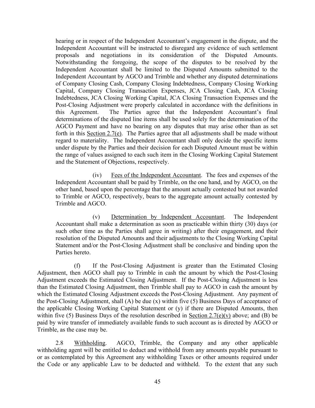 45 hearing or in respect of the Independent Accountant’s engagement in the dispute, and the Independent Accountant will be instructed to disregard any evidence of such settlement proposals and negotiations in its consideration of the Disputed Amounts. Notwithstanding the foregoing, the scope of the disputes to be resolved by the Independent Accountant shall be limited to the Disputed Amounts submitted to the Independent Accountant by AGCO and Trimble and whether any disputed determinations of Company Closing Cash, Company Closing Indebtedness, Company Closing Working Capital, Company Closing Transaction Expenses, JCA Closing Cash, JCA Closing Indebtedness, JCA Closing Working Capital, JCA Closing Transaction Expenses and the Post-Closing Adjustment were properly calculated in accordance with the definitions in this Agreement. The Parties agree that the Independent Accountant’s final determinations of the disputed line items shall be used solely for the determination of the AGCO Payment and have no bearing on any disputes that may arise other than as set forth in this Section 2.7(e). The Parties agree that all adjustments shall be made without regard to materiality. The Independent Accountant shall only decide the specific items under dispute by the Parties and their decision for each Disputed Amount must be within the range of values assigned to each such item in the Closing Working Capital Statement and the Statement of Objections, respectively. (iv) Fees of the Independent Accountant. The fees and expenses of the Independent Accountant shall be paid by Trimble, on the one hand, and by AGCO, on the other hand, based upon the percentage that the amount actually contested but not awarded to Trimble or AGCO, respectively, bears to the aggregate amount actually contested by Trimble and AGCO. (v) Determination by Independent Accountant. The Independent Accountant shall make a determination as soon as practicable within thirty (30) days (or such other time as the Parties shall agree in writing) after their engagement, and their resolution of the Disputed Amounts and their adjustments to the Closing Working Capital Statement and/or the Post-Closing Adjustment shall be conclusive and binding upon the Parties hereto. (f) If the Post-Closing Adjustment is greater than the Estimated Closing Adjustment, then AGCO shall pay to Trimble in cash the amount by which the Post-Closing Adjustment exceeds the Estimated Closing Adjustment. If the Post-Closing Adjustment is less than the Estimated Closing Adjustment, then Trimble shall pay to AGCO in cash the amount by which the Estimated Closing Adjustment exceeds the Post-Closing Adjustment. Any payment of the Post-Closing Adjustment, shall (A) be due (x) within five (5) Business Days of acceptance of the applicable Closing Working Capital Statement or (y) if there are Disputed Amounts, then within five (5) Business Days of the resolution described in Section 2.7(e)(v) above; and (B) be paid by wire transfer of immediately available funds to such account as is directed by AGCO or Trimble, as the case may be. 2.8 Withholding. AGCO, Trimble, the Company and any other applicable withholding agent will be entitled to deduct and withhold from any amounts payable pursuant to or as contemplated by this Agreement any withholding Taxes or other amounts required under the Code or any applicable Law to be deducted and withheld. To the extent that any such