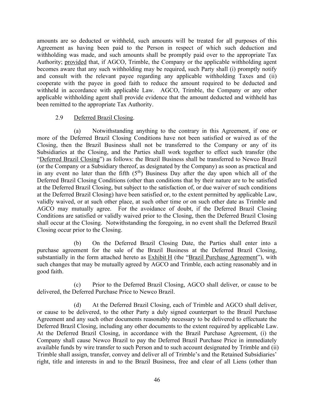 46 amounts are so deducted or withheld, such amounts will be treated for all purposes of this Agreement as having been paid to the Person in respect of which such deduction and withholding was made, and such amounts shall be promptly paid over to the appropriate Tax Authority; provided that, if AGCO, Trimble, the Company or the applicable withholding agent becomes aware that any such withholding may be required, such Party shall (i) promptly notify and consult with the relevant payee regarding any applicable withholding Taxes and (ii) cooperate with the payee in good faith to reduce the amount required to be deducted and withheld in accordance with applicable Law. AGCO, Trimble, the Company or any other applicable withholding agent shall provide evidence that the amount deducted and withheld has been remitted to the appropriate Tax Authority. 2.9 Deferred Brazil Closing. (a) Notwithstanding anything to the contrary in this Agreement, if one or more of the Deferred Brazil Closing Conditions have not been satisfied or waived as of the Closing, then the Brazil Business shall not be transferred to the Company or any of its Subsidiaries at the Closing, and the Parties shall work together to effect such transfer (the “Deferred Brazil Closing”) as follows: the Brazil Business shall be transferred to Newco Brazil (or the Company or a Subsidiary thereof, as designated by the Company) as soon as practical and in any event no later than the fifth (5th) Business Day after the day upon which all of the Deferred Brazil Closing Conditions (other than conditions that by their nature are to be satisfied at the Deferred Brazil Closing, but subject to the satisfaction of, or due waiver of such conditions at the Deferred Brazil Closing) have been satisfied or, to the extent permitted by applicable Law, validly waived, or at such other place, at such other time or on such other date as Trimble and AGCO may mutually agree. For the avoidance of doubt, if the Deferred Brazil Closing Conditions are satisfied or validly waived prior to the Closing, then the Deferred Brazil Closing shall occur at the Closing. Notwithstanding the foregoing, in no event shall the Deferred Brazil Closing occur prior to the Closing. (b) On the Deferred Brazil Closing Date, the Parties shall enter into a purchase agreement for the sale of the Brazil Business at the Deferred Brazil Closing, substantially in the form attached hereto as Exhibit H (the “Brazil Purchase Agreement”), with such changes that may be mutually agreed by AGCO and Trimble, each acting reasonably and in good faith. (c) Prior to the Deferred Brazil Closing, AGCO shall deliver, or cause to be delivered, the Deferred Purchase Price to Newco Brazil. (d) At the Deferred Brazil Closing, each of Trimble and AGCO shall deliver, or cause to be delivered, to the other Party a duly signed counterpart to the Brazil Purchase Agreement and any such other documents reasonably necessary to be delivered to effectuate the Deferred Brazil Closing, including any other documents to the extent required by applicable Law. At the Deferred Brazil Closing, in accordance with the Brazil Purchase Agreement, (i) the Company shall cause Newco Brazil to pay the Deferred Brazil Purchase Price in immediately available funds by wire transfer to such Person and to such account designated by Trimble and (ii) Trimble shall assign, transfer, convey and deliver all of Trimble’s and the Retained Subsidiaries’ right, title and interests in and to the Brazil Business, free and clear of all Liens (other than