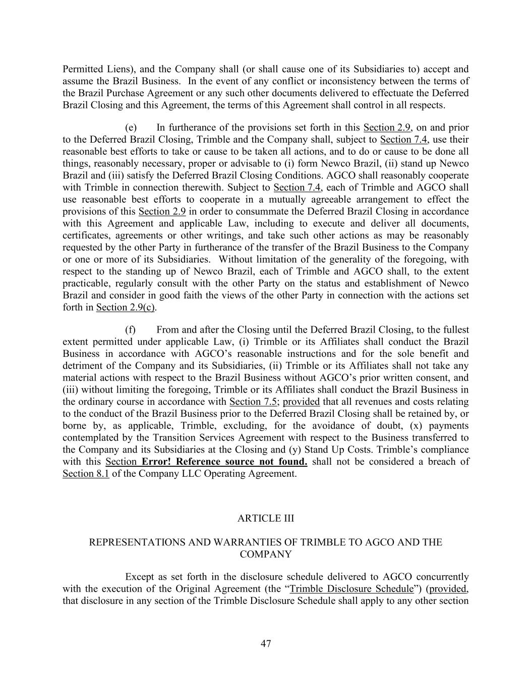 47 Permitted Liens), and the Company shall (or shall cause one of its Subsidiaries to) accept and assume the Brazil Business. In the event of any conflict or inconsistency between the terms of the Brazil Purchase Agreement or any such other documents delivered to effectuate the Deferred Brazil Closing and this Agreement, the terms of this Agreement shall control in all respects. (e) In furtherance of the provisions set forth in this Section 2.9, on and prior to the Deferred Brazil Closing, Trimble and the Company shall, subject to Section 7.4, use their reasonable best efforts to take or cause to be taken all actions, and to do or cause to be done all things, reasonably necessary, proper or advisable to (i) form Newco Brazil, (ii) stand up Newco Brazil and (iii) satisfy the Deferred Brazil Closing Conditions. AGCO shall reasonably cooperate with Trimble in connection therewith. Subject to Section 7.4, each of Trimble and AGCO shall use reasonable best efforts to cooperate in a mutually agreeable arrangement to effect the provisions of this Section 2.9 in order to consummate the Deferred Brazil Closing in accordance with this Agreement and applicable Law, including to execute and deliver all documents, certificates, agreements or other writings, and take such other actions as may be reasonably requested by the other Party in furtherance of the transfer of the Brazil Business to the Company or one or more of its Subsidiaries. Without limitation of the generality of the foregoing, with respect to the standing up of Newco Brazil, each of Trimble and AGCO shall, to the extent practicable, regularly consult with the other Party on the status and establishment of Newco Brazil and consider in good faith the views of the other Party in connection with the actions set forth in Section 2.9(c). (f) From and after the Closing until the Deferred Brazil Closing, to the fullest extent permitted under applicable Law, (i) Trimble or its Affiliates shall conduct the Brazil Business in accordance with AGCO’s reasonable instructions and for the sole benefit and detriment of the Company and its Subsidiaries, (ii) Trimble or its Affiliates shall not take any material actions with respect to the Brazil Business without AGCO’s prior written consent, and (iii) without limiting the foregoing, Trimble or its Affiliates shall conduct the Brazil Business in the ordinary course in accordance with Section 7.5; provided that all revenues and costs relating to the conduct of the Brazil Business prior to the Deferred Brazil Closing shall be retained by, or borne by, as applicable, Trimble, excluding, for the avoidance of doubt, (x) payments contemplated by the Transition Services Agreement with respect to the Business transferred to the Company and its Subsidiaries at the Closing and (y) Stand Up Costs. Trimble’s compliance with this Section Error! Reference source not found. shall not be considered a breach of Section 8.1 of the Company LLC Operating Agreement. ARTICLE III REPRESENTATIONS AND WARRANTIES OF TRIMBLE TO AGCO AND THE COMPANY Except as set forth in the disclosure schedule delivered to AGCO concurrently with the execution of the Original Agreement (the “Trimble Disclosure Schedule”) (provided, that disclosure in any section of the Trimble Disclosure Schedule shall apply to any other section