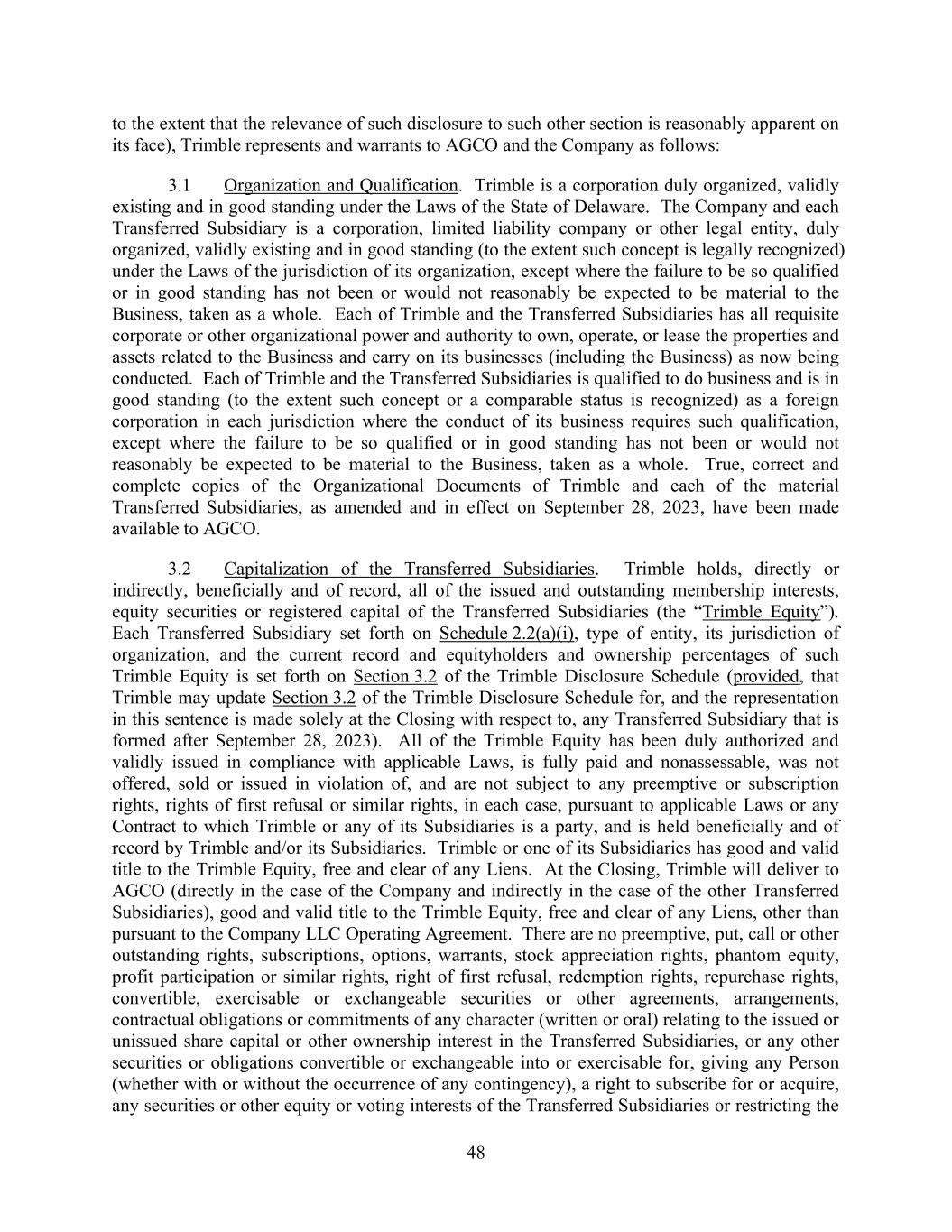 48 to the extent that the relevance of such disclosure to such other section is reasonably apparent on its face), Trimble represents and warrants to AGCO and the Company as follows: 3.1 Organization and Qualification. Trimble is a corporation duly organized, validly existing and in good standing under the Laws of the State of Delaware. The Company and each Transferred Subsidiary is a corporation, limited liability company or other legal entity, duly organized, validly existing and in good standing (to the extent such concept is legally recognized) under the Laws of the jurisdiction of its organization, except where the failure to be so qualified or in good standing has not been or would not reasonably be expected to be material to the Business, taken as a whole. Each of Trimble and the Transferred Subsidiaries has all requisite corporate or other organizational power and authority to own, operate, or lease the properties and assets related to the Business and carry on its businesses (including the Business) as now being conducted. Each of Trimble and the Transferred Subsidiaries is qualified to do business and is in good standing (to the extent such concept or a comparable status is recognized) as a foreign corporation in each jurisdiction where the conduct of its business requires such qualification, except where the failure to be so qualified or in good standing has not been or would not reasonably be expected to be material to the Business, taken as a whole. True, correct and complete copies of the Organizational Documents of Trimble and each of the material Transferred Subsidiaries, as amended and in effect on September 28, 2023, have been made available to AGCO. 3.2 Capitalization of the Transferred Subsidiaries. Trimble holds, directly or indirectly, beneficially and of record, all of the issued and outstanding membership interests, equity securities or registered capital of the Transferred Subsidiaries (the “Trimble Equity”). Each Transferred Subsidiary set forth on Schedule 2.2(a)(i), type of entity, its jurisdiction of organization, and the current record and equityholders and ownership percentages of such Trimble Equity is set forth on Section 3.2 of the Trimble Disclosure Schedule (provided, that Trimble may update Section 3.2 of the Trimble Disclosure Schedule for, and the representation in this sentence is made solely at the Closing with respect to, any Transferred Subsidiary that is formed after September 28, 2023). All of the Trimble Equity has been duly authorized and validly issued in compliance with applicable Laws, is fully paid and nonassessable, was not offered, sold or issued in violation of, and are not subject to any preemptive or subscription rights, rights of first refusal or similar rights, in each case, pursuant to applicable Laws or any Contract to which Trimble or any of its Subsidiaries is a party, and is held beneficially and of record by Trimble and/or its Subsidiaries. Trimble or one of its Subsidiaries has good and valid title to the Trimble Equity, free and clear of any Liens. At the Closing, Trimble will deliver to AGCO (directly in the case of the Company and indirectly in the case of the other Transferred Subsidiaries), good and valid title to the Trimble Equity, free and clear of any Liens, other than pursuant to the Company LLC Operating Agreement. There are no preemptive, put, call or other outstanding rights, subscriptions, options, warrants, stock appreciation rights, phantom equity, profit participation or similar rights, right of first refusal, redemption rights, repurchase rights, convertible, exercisable or exchangeable securities or other agreements, arrangements, contractual obligations or commitments of any character (written or oral) relating to the issued or unissued share capital or other ownership interest in the Transferred Subsidiaries, or any other securities or obligations convertible or exchangeable into or exercisable for, giving any Person (whether with or without the occurrence of any contingency), a right to subscribe for or acquire, any securities or other equity or voting interests of the Transferred Subsidiaries or restricting the