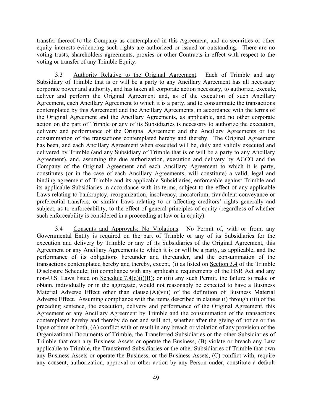 49 transfer thereof to the Company as contemplated in this Agreement, and no securities or other equity interests evidencing such rights are authorized or issued or outstanding. There are no voting trusts, shareholders agreements, proxies or other Contracts in effect with respect to the voting or transfer of any Trimble Equity. 3.3 Authority Relative to the Original Agreement. Each of Trimble and any Subsidiary of Trimble that is or will be a party to any Ancillary Agreement has all necessary corporate power and authority, and has taken all corporate action necessary, to authorize, execute, deliver and perform the Original Agreement and, as of the execution of such Ancillary Agreement, each Ancillary Agreement to which it is a party, and to consummate the transactions contemplated by this Agreement and the Ancillary Agreements, in accordance with the terms of the Original Agreement and the Ancillary Agreements, as applicable, and no other corporate action on the part of Trimble or any of its Subsidiaries is necessary to authorize the execution, delivery and performance of the Original Agreement and the Ancillary Agreements or the consummation of the transactions contemplated hereby and thereby. The Original Agreement has been, and each Ancillary Agreement when executed will be, duly and validly executed and delivered by Trimble (and any Subsidiary of Trimble that is or will be a party to any Ancillary Agreement), and, assuming the due authorization, execution and delivery by AGCO and the Company of the Original Agreement and each Ancillary Agreement to which it is party, constitutes (or in the case of each Ancillary Agreements, will constitute) a valid, legal and binding agreement of Trimble and its applicable Subsidiaries, enforceable against Trimble and its applicable Subsidiaries in accordance with its terms, subject to the effect of any applicable Laws relating to bankruptcy, reorganization, insolvency, moratorium, fraudulent conveyance or preferential transfers, or similar Laws relating to or affecting creditors’ rights generally and subject, as to enforceability, to the effect of general principles of equity (regardless of whether such enforceability is considered in a proceeding at law or in equity). 3.4 Consents and Approvals; No Violations. No Permit of, with or from, any Governmental Entity is required on the part of Trimble or any of its Subsidiaries for the execution and delivery by Trimble or any of its Subsidiaries of the Original Agreement, this Agreement or any Ancillary Agreements to which it is or will be a party, as applicable, and the performance of its obligations hereunder and thereunder, and the consummation of the transactions contemplated hereby and thereby, except, (i) as listed on Section 3.4 of the Trimble Disclosure Schedule; (ii) compliance with any applicable requirements of the HSR Act and any non-U.S. Laws listed on Schedule 7.4(d)(i)(B); or (iii) any such Permit, the failure to make or obtain, individually or in the aggregate, would not reasonably be expected to have a Business Material Adverse Effect other than clause (A)(viii) of the definition of Business Material Adverse Effect. Assuming compliance with the items described in clauses (i) through (iii) of the preceding sentence, the execution, delivery and performance of the Original Agreement, this Agreement or any Ancillary Agreement by Trimble and the consummation of the transactions contemplated hereby and thereby do not and will not, whether after the giving of notice or the lapse of time or both, (A) conflict with or result in any breach or violation of any provision of the Organizational Documents of Trimble, the Transferred Subsidiaries or the other Subsidiaries of Trimble that own any Business Assets or operate the Business, (B) violate or breach any Law applicable to Trimble, the Transferred Subsidiaries or the other Subsidiaries of Trimble that own any Business Assets or operate the Business, or the Business Assets, (C) conflict with, require any consent, authorization, approval or other action by any Person under, constitute a default