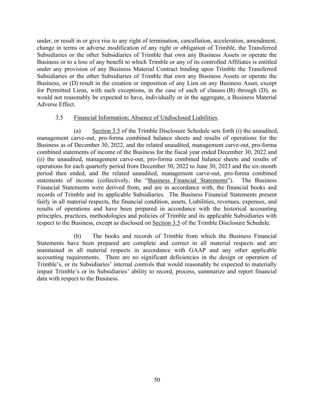 50 under, or result in or give rise to any right of termination, cancellation, acceleration, amendment, change in terms or adverse modification of any right or obligation of Trimble, the Transferred Subsidiaries or the other Subsidiaries of Trimble that own any Business Assets or operate the Business or to a loss of any benefit to which Trimble or any of its controlled Affiliates is entitled under any provision of any Business Material Contract binding upon Trimble the Transferred Subsidiaries or the other Subsidiaries of Trimble that own any Business Assets or operate the Business, or (D) result in the creation or imposition of any Lien on any Business Asset, except for Permitted Liens, with such exceptions, in the case of each of clauses (B) through (D), as would not reasonably be expected to have, individually or in the aggregate, a Business Material Adverse Effect. 3.5 Financial Information; Absence of Undisclosed Liabilities. (a) Section 3.5 of the Trimble Disclosure Schedule sets forth (i) the unaudited, management carve-out, pro-forma combined balance sheets and results of operations for the Business as of December 30, 2022, and the related unaudited, management carve-out, pro-forma combined statements of income of the Business for the fiscal year ended December 30, 2022 and (ii) the unaudited, management carve-out, pro-forma combined balance sheets and results of operations for each quarterly period from December 30, 2022 to June 30, 2023 and the six-month period then ended, and the related unaudited, management carve-out, pro-forma combined statements of income (collectively, the “Business Financial Statements”). The Business Financial Statements were derived from, and are in accordance with, the financial books and records of Trimble and its applicable Subsidiaries. The Business Financial Statements present fairly in all material respects, the financial condition, assets, Liabilities, revenues, expenses, and results of operations and have been prepared in accordance with the historical accounting principles, practices, methodologies and policies of Trimble and its applicable Subsidiaries with respect to the Business, except as disclosed on Section 3.5 of the Trimble Disclosure Schedule. (b) The books and records of Trimble from which the Business Financial Statements have been prepared are complete and correct in all material respects and are maintained in all material respects in accordance with GAAP and any other applicable accounting requirements. There are no significant deficiencies in the design or operation of Trimble’s, or its Subsidiaries’ internal controls that would reasonably be expected to materially impair Trimble’s or its Subsidiaries’ ability to record, process, summarize and report financial data with respect to the Business.
