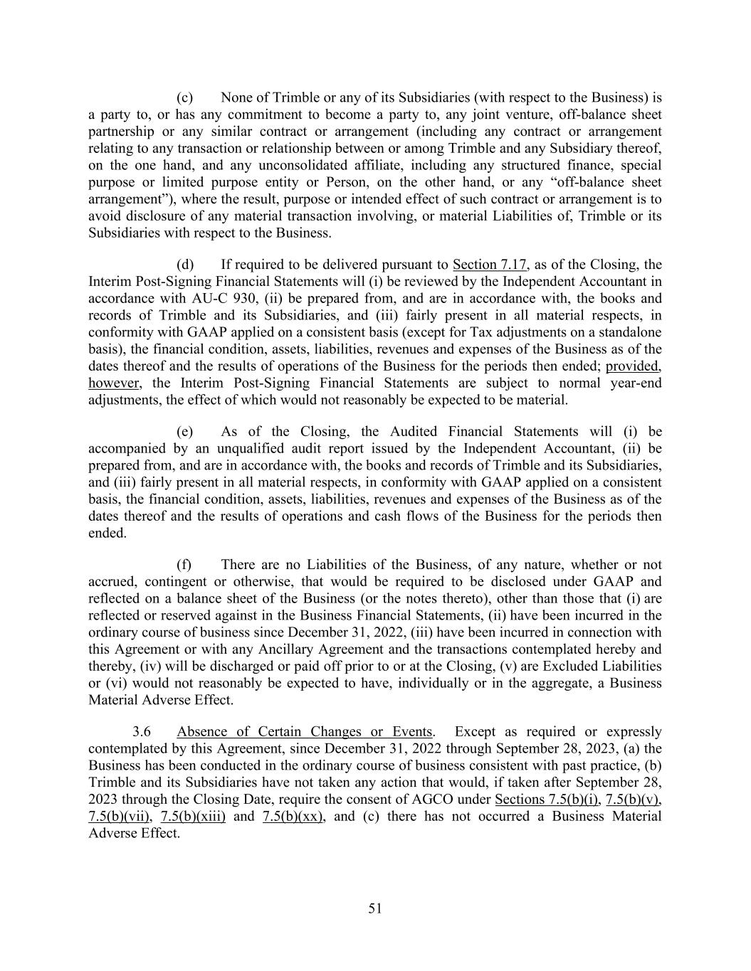 51 (c) None of Trimble or any of its Subsidiaries (with respect to the Business) is a party to, or has any commitment to become a party to, any joint venture, off-balance sheet partnership or any similar contract or arrangement (including any contract or arrangement relating to any transaction or relationship between or among Trimble and any Subsidiary thereof, on the one hand, and any unconsolidated affiliate, including any structured finance, special purpose or limited purpose entity or Person, on the other hand, or any “off-balance sheet arrangement”), where the result, purpose or intended effect of such contract or arrangement is to avoid disclosure of any material transaction involving, or material Liabilities of, Trimble or its Subsidiaries with respect to the Business. (d) If required to be delivered pursuant to Section 7.17, as of the Closing, the Interim Post-Signing Financial Statements will (i) be reviewed by the Independent Accountant in accordance with AU-C 930, (ii) be prepared from, and are in accordance with, the books and records of Trimble and its Subsidiaries, and (iii) fairly present in all material respects, in conformity with GAAP applied on a consistent basis (except for Tax adjustments on a standalone basis), the financial condition, assets, liabilities, revenues and expenses of the Business as of the dates thereof and the results of operations of the Business for the periods then ended; provided, however, the Interim Post-Signing Financial Statements are subject to normal year-end adjustments, the effect of which would not reasonably be expected to be material. (e) As of the Closing, the Audited Financial Statements will (i) be accompanied by an unqualified audit report issued by the Independent Accountant, (ii) be prepared from, and are in accordance with, the books and records of Trimble and its Subsidiaries, and (iii) fairly present in all material respects, in conformity with GAAP applied on a consistent basis, the financial condition, assets, liabilities, revenues and expenses of the Business as of the dates thereof and the results of operations and cash flows of the Business for the periods then ended. (f) There are no Liabilities of the Business, of any nature, whether or not accrued, contingent or otherwise, that would be required to be disclosed under GAAP and reflected on a balance sheet of the Business (or the notes thereto), other than those that (i) are reflected or reserved against in the Business Financial Statements, (ii) have been incurred in the ordinary course of business since December 31, 2022, (iii) have been incurred in connection with this Agreement or with any Ancillary Agreement and the transactions contemplated hereby and thereby, (iv) will be discharged or paid off prior to or at the Closing, (v) are Excluded Liabilities or (vi) would not reasonably be expected to have, individually or in the aggregate, a Business Material Adverse Effect. 3.6 Absence of Certain Changes or Events. Except as required or expressly contemplated by this Agreement, since December 31, 2022 through September 28, 2023, (a) the Business has been conducted in the ordinary course of business consistent with past practice, (b) Trimble and its Subsidiaries have not taken any action that would, if taken after September 28, 2023 through the Closing Date, require the consent of AGCO under Sections 7.5(b)(i), 7.5(b)(v), 7.5(b)(vii), 7.5(b)(xiii) and 7.5(b)(xx), and (c) there has not occurred a Business Material Adverse Effect.