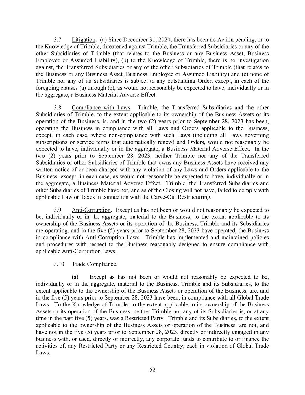 52 3.7 Litigation. (a) Since December 31, 2020, there has been no Action pending, or to the Knowledge of Trimble, threatened against Trimble, the Transferred Subsidiaries or any of the other Subsidiaries of Trimble (that relates to the Business or any Business Asset, Business Employee or Assumed Liability), (b) to the Knowledge of Trimble, there is no investigation against, the Transferred Subsidiaries or any of the other Subsidiaries of Trimble (that relates to the Business or any Business Asset, Business Employee or Assumed Liability) and (c) none of Trimble nor any of its Subsidiaries is subject to any outstanding Order, except, in each of the foregoing clauses (a) through (c), as would not reasonably be expected to have, individually or in the aggregate, a Business Material Adverse Effect. 3.8 Compliance with Laws. Trimble, the Transferred Subsidiaries and the other Subsidiaries of Trimble, to the extent applicable to its ownership of the Business Assets or its operation of the Business, is, and in the two (2) years prior to September 28, 2023 has been, operating the Business in compliance with all Laws and Orders applicable to the Business, except, in each case, where non-compliance with such Laws (including all Laws governing subscriptions or service terms that automatically renew) and Orders, would not reasonably be expected to have, individually or in the aggregate, a Business Material Adverse Effect. In the two (2) years prior to September 28, 2023, neither Trimble nor any of the Transferred Subsidiaries or other Subsidiaries of Trimble that owns any Business Assets have received any written notice of or been charged with any violation of any Laws and Orders applicable to the Business, except, in each case, as would not reasonably be expected to have, individually or in the aggregate, a Business Material Adverse Effect. Trimble, the Transferred Subsidiaries and other Subsidiaries of Trimble have not, and as of the Closing will not have, failed to comply with applicable Law or Taxes in connection with the Carve-Out Restructuring. 3.9 Anti-Corruption. Except as has not been or would not reasonably be expected to be, individually or in the aggregate, material to the Business, to the extent applicable to its ownership of the Business Assets or its operation of the Business, Trimble and its Subsidiaries are operating, and in the five (5) years prior to September 28, 2023 have operated, the Business in compliance with Anti-Corruption Laws. Trimble has implemented and maintained policies and procedures with respect to the Business reasonably designed to ensure compliance with applicable Anti-Corruption Laws. 3.10 Trade Compliance. (a) Except as has not been or would not reasonably be expected to be, individually or in the aggregate, material to the Business, Trimble and its Subsidiaries, to the extent applicable to the ownership of the Business Assets or operation of the Business, are, and in the five (5) years prior to September 28, 2023 have been, in compliance with all Global Trade Laws. To the Knowledge of Trimble, to the extent applicable to its ownership of the Business Assets or its operation of the Business, neither Trimble nor any of its Subsidiaries is, or at any time in the past five (5) years, was a Restricted Party. Trimble and its Subsidiaries, to the extent applicable to the ownership of the Business Assets or operation of the Business, are not, and have not in the five (5) years prior to September 28, 2023, directly or indirectly engaged in any business with, or used, directly or indirectly, any corporate funds to contribute to or finance the activities of, any Restricted Party or any Restricted Country, each in violation of Global Trade Laws.