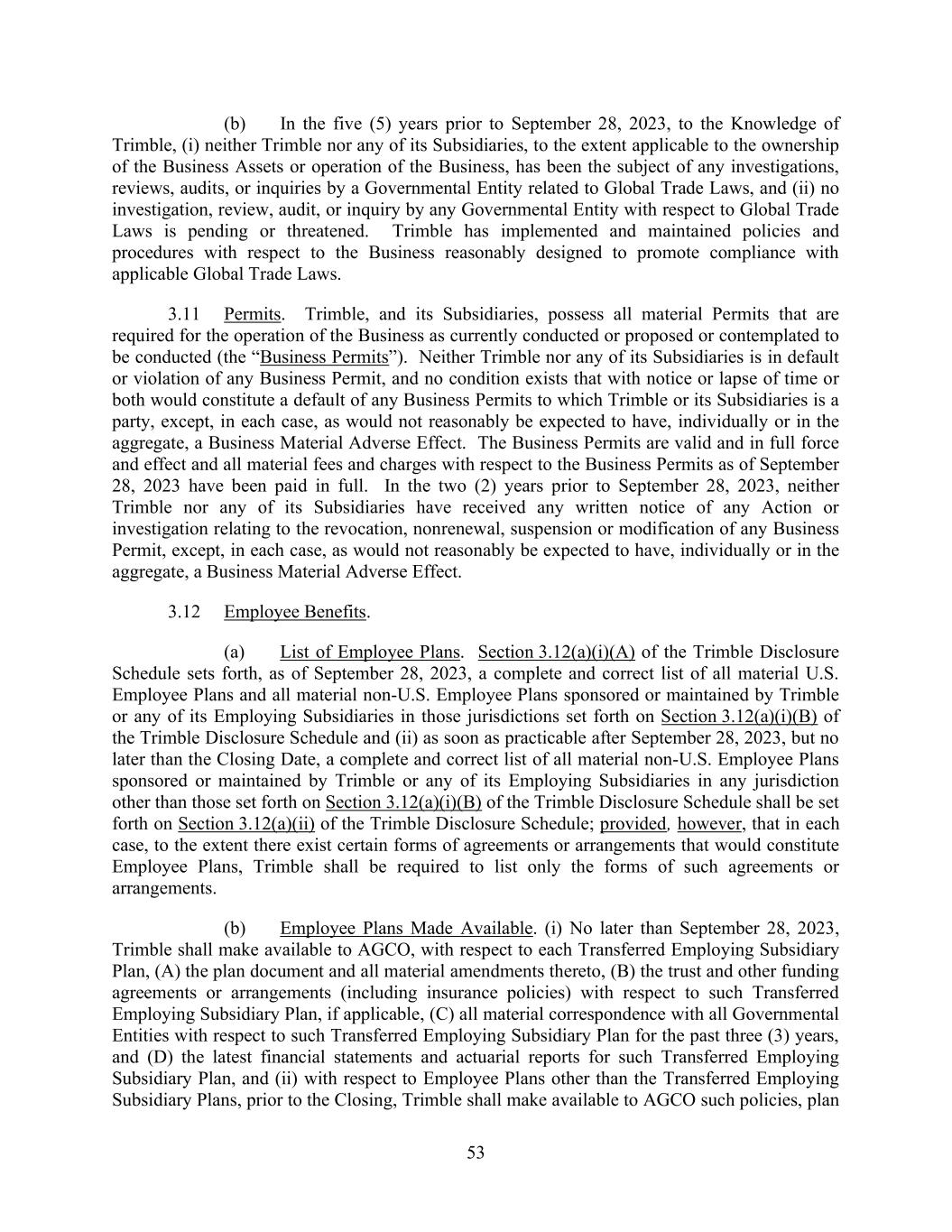 53 (b) In the five (5) years prior to September 28, 2023, to the Knowledge of Trimble, (i) neither Trimble nor any of its Subsidiaries, to the extent applicable to the ownership of the Business Assets or operation of the Business, has been the subject of any investigations, reviews, audits, or inquiries by a Governmental Entity related to Global Trade Laws, and (ii) no investigation, review, audit, or inquiry by any Governmental Entity with respect to Global Trade Laws is pending or threatened. Trimble has implemented and maintained policies and procedures with respect to the Business reasonably designed to promote compliance with applicable Global Trade Laws. 3.11 Permits. Trimble, and its Subsidiaries, possess all material Permits that are required for the operation of the Business as currently conducted or proposed or contemplated to be conducted (the “Business Permits”). Neither Trimble nor any of its Subsidiaries is in default or violation of any Business Permit, and no condition exists that with notice or lapse of time or both would constitute a default of any Business Permits to which Trimble or its Subsidiaries is a party, except, in each case, as would not reasonably be expected to have, individually or in the aggregate, a Business Material Adverse Effect. The Business Permits are valid and in full force and effect and all material fees and charges with respect to the Business Permits as of September 28, 2023 have been paid in full. In the two (2) years prior to September 28, 2023, neither Trimble nor any of its Subsidiaries have received any written notice of any Action or investigation relating to the revocation, nonrenewal, suspension or modification of any Business Permit, except, in each case, as would not reasonably be expected to have, individually or in the aggregate, a Business Material Adverse Effect. 3.12 Employee Benefits. (a) List of Employee Plans. Section 3.12(a)(i)(A) of the Trimble Disclosure Schedule sets forth, as of September 28, 2023, a complete and correct list of all material U.S. Employee Plans and all material non-U.S. Employee Plans sponsored or maintained by Trimble or any of its Employing Subsidiaries in those jurisdictions set forth on Section 3.12(a)(i)(B) of the Trimble Disclosure Schedule and (ii) as soon as practicable after September 28, 2023, but no later than the Closing Date, a complete and correct list of all material non-U.S. Employee Plans sponsored or maintained by Trimble or any of its Employing Subsidiaries in any jurisdiction other than those set forth on Section 3.12(a)(i)(B) of the Trimble Disclosure Schedule shall be set forth on Section 3.12(a)(ii) of the Trimble Disclosure Schedule; provided, however, that in each case, to the extent there exist certain forms of agreements or arrangements that would constitute Employee Plans, Trimble shall be required to list only the forms of such agreements or arrangements. (b) Employee Plans Made Available. (i) No later than September 28, 2023, Trimble shall make available to AGCO, with respect to each Transferred Employing Subsidiary Plan, (A) the plan document and all material amendments thereto, (B) the trust and other funding agreements or arrangements (including insurance policies) with respect to such Transferred Employing Subsidiary Plan, if applicable, (C) all material correspondence with all Governmental Entities with respect to such Transferred Employing Subsidiary Plan for the past three (3) years, and (D) the latest financial statements and actuarial reports for such Transferred Employing Subsidiary Plan, and (ii) with respect to Employee Plans other than the Transferred Employing Subsidiary Plans, prior to the Closing, Trimble shall make available to AGCO such policies, plan