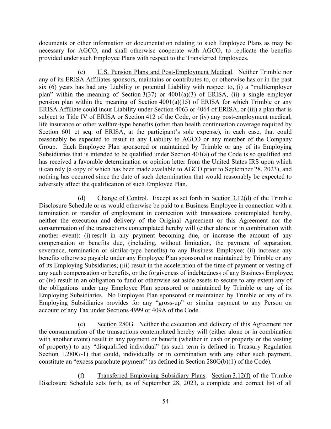 54 documents or other information or documentation relating to such Employee Plans as may be necessary for AGCO, and shall otherwise cooperate with AGCO, to replicate the benefits provided under such Employee Plans with respect to the Transferred Employees. (c) U.S. Pension Plans and Post-Employment Medical. Neither Trimble nor any of its ERISA Affiliates sponsors, maintains or contributes to, or otherwise has or in the past six (6) years has had any Liability or potential Liability with respect to, (i) a “multiemployer plan” within the meaning of Section 3(37) or 4001(a)(3) of ERISA, (ii) a single employer pension plan within the meaning of Section 4001(a)(15) of ERISA for which Trimble or any ERISA Affiliate could incur Liability under Section 4063 or 4064 of ERISA, or (iii) a plan that is subject to Title IV of ERISA or Section 412 of the Code, or (iv) any post-employment medical, life insurance or other welfare-type benefits (other than health continuation coverage required by Section 601 et seq. of ERISA, at the participant’s sole expense), in each case, that could reasonably be expected to result in any Liability to AGCO or any member of the Company Group. Each Employee Plan sponsored or maintained by Trimble or any of its Employing Subsidiaries that is intended to be qualified under Section 401(a) of the Code is so qualified and has received a favorable determination or opinion letter from the United States IRS upon which it can rely (a copy of which has been made available to AGCO prior to September 28, 2023), and nothing has occurred since the date of such determination that would reasonably be expected to adversely affect the qualification of such Employee Plan. (d) Change of Control. Except as set forth in Section 3.12(d) of the Trimble Disclosure Schedule or as would otherwise be paid to a Business Employee in connection with a termination or transfer of employment in connection with transactions contemplated hereby, neither the execution and delivery of the Original Agreement or this Agreement nor the consummation of the transactions contemplated hereby will (either alone or in combination with another event): (i) result in any payment becoming due, or increase the amount of any compensation or benefits due, (including, without limitation, the payment of separation, severance, termination or similar-type benefits) to any Business Employee; (ii) increase any benefits otherwise payable under any Employee Plan sponsored or maintained by Trimble or any of its Employing Subsidiaries; (iii) result in the acceleration of the time of payment or vesting of any such compensation or benefits, or the forgiveness of indebtedness of any Business Employee; or (iv) result in an obligation to fund or otherwise set aside assets to secure to any extent any of the obligations under any Employee Plan sponsored or maintained by Trimble or any of its Employing Subsidiaries. No Employee Plan sponsored or maintained by Trimble or any of its Employing Subsidiaries provides for any “gross-up” or similar payment to any Person on account of any Tax under Sections 4999 or 409A of the Code. (e) Section 280G. Neither the execution and delivery of this Agreement nor the consummation of the transactions contemplated hereby will (either alone or in combination with another event) result in any payment or benefit (whether in cash or property or the vesting of property) to any “disqualified individual” (as such term is defined in Treasury Regulation Section 1.280G-1) that could, individually or in combination with any other such payment, constitute an “excess parachute payment” (as defined in Section 280G(b)(1) of the Code). (f) Transferred Employing Subsidiary Plans. Section 3.12(f) of the Trimble Disclosure Schedule sets forth, as of September 28, 2023, a complete and correct list of all