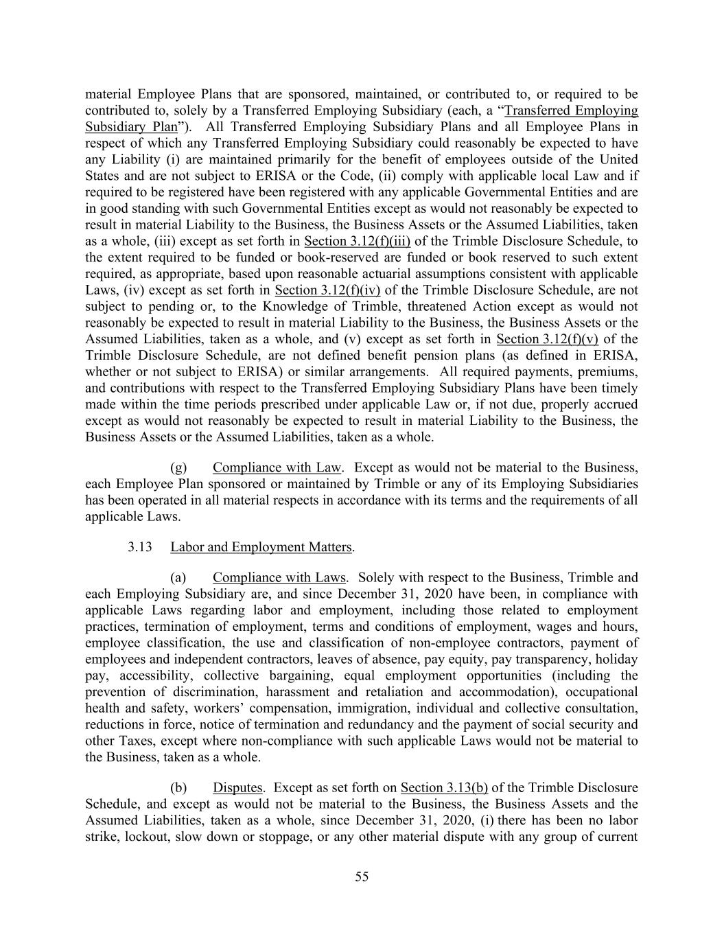 55 material Employee Plans that are sponsored, maintained, or contributed to, or required to be contributed to, solely by a Transferred Employing Subsidiary (each, a “Transferred Employing Subsidiary Plan”). All Transferred Employing Subsidiary Plans and all Employee Plans in respect of which any Transferred Employing Subsidiary could reasonably be expected to have any Liability (i) are maintained primarily for the benefit of employees outside of the United States and are not subject to ERISA or the Code, (ii) comply with applicable local Law and if required to be registered have been registered with any applicable Governmental Entities and are in good standing with such Governmental Entities except as would not reasonably be expected to result in material Liability to the Business, the Business Assets or the Assumed Liabilities, taken as a whole, (iii) except as set forth in Section 3.12(f)(iii) of the Trimble Disclosure Schedule, to the extent required to be funded or book-reserved are funded or book reserved to such extent required, as appropriate, based upon reasonable actuarial assumptions consistent with applicable Laws, (iv) except as set forth in Section 3.12(f)(iv) of the Trimble Disclosure Schedule, are not subject to pending or, to the Knowledge of Trimble, threatened Action except as would not reasonably be expected to result in material Liability to the Business, the Business Assets or the Assumed Liabilities, taken as a whole, and (v) except as set forth in Section 3.12(f)(v) of the Trimble Disclosure Schedule, are not defined benefit pension plans (as defined in ERISA, whether or not subject to ERISA) or similar arrangements. All required payments, premiums, and contributions with respect to the Transferred Employing Subsidiary Plans have been timely made within the time periods prescribed under applicable Law or, if not due, properly accrued except as would not reasonably be expected to result in material Liability to the Business, the Business Assets or the Assumed Liabilities, taken as a whole. (g) Compliance with Law. Except as would not be material to the Business, each Employee Plan sponsored or maintained by Trimble or any of its Employing Subsidiaries has been operated in all material respects in accordance with its terms and the requirements of all applicable Laws. 3.13 Labor and Employment Matters. (a) Compliance with Laws. Solely with respect to the Business, Trimble and each Employing Subsidiary are, and since December 31, 2020 have been, in compliance with applicable Laws regarding labor and employment, including those related to employment practices, termination of employment, terms and conditions of employment, wages and hours, employee classification, the use and classification of non-employee contractors, payment of employees and independent contractors, leaves of absence, pay equity, pay transparency, holiday pay, accessibility, collective bargaining, equal employment opportunities (including the prevention of discrimination, harassment and retaliation and accommodation), occupational health and safety, workers’ compensation, immigration, individual and collective consultation, reductions in force, notice of termination and redundancy and the payment of social security and other Taxes, except where non-compliance with such applicable Laws would not be material to the Business, taken as a whole. (b) Disputes. Except as set forth on Section 3.13(b) of the Trimble Disclosure Schedule, and except as would not be material to the Business, the Business Assets and the Assumed Liabilities, taken as a whole, since December 31, 2020, (i) there has been no labor strike, lockout, slow down or stoppage, or any other material dispute with any group of current