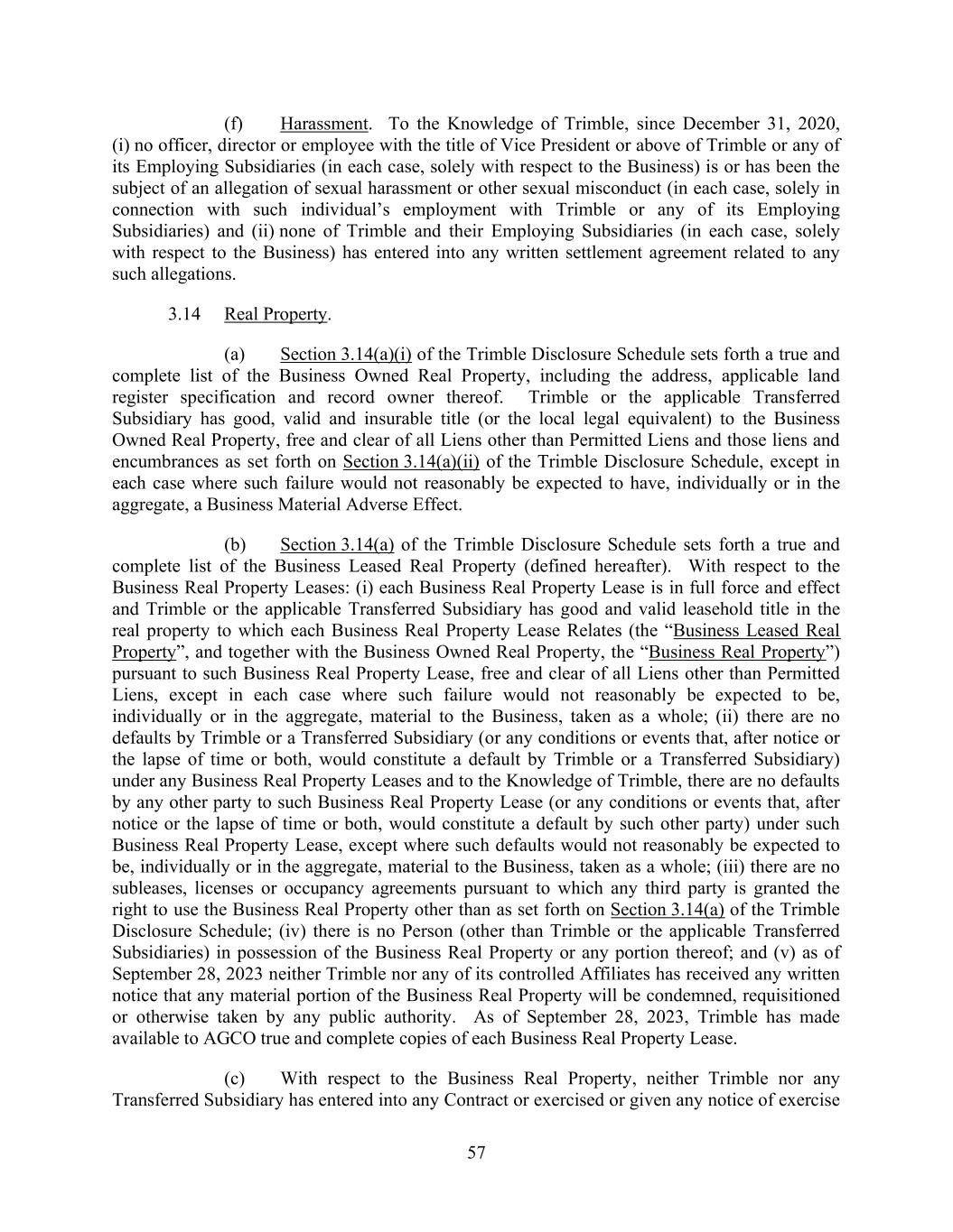 57 (f) Harassment. To the Knowledge of Trimble, since December 31, 2020, (i) no officer, director or employee with the title of Vice President or above of Trimble or any of its Employing Subsidiaries (in each case, solely with respect to the Business) is or has been the subject of an allegation of sexual harassment or other sexual misconduct (in each case, solely in connection with such individual’s employment with Trimble or any of its Employing Subsidiaries) and (ii) none of Trimble and their Employing Subsidiaries (in each case, solely with respect to the Business) has entered into any written settlement agreement related to any such allegations. 3.14 Real Property. (a) Section 3.14(a)(i) of the Trimble Disclosure Schedule sets forth a true and complete list of the Business Owned Real Property, including the address, applicable land register specification and record owner thereof. Trimble or the applicable Transferred Subsidiary has good, valid and insurable title (or the local legal equivalent) to the Business Owned Real Property, free and clear of all Liens other than Permitted Liens and those liens and encumbrances as set forth on Section 3.14(a)(ii) of the Trimble Disclosure Schedule, except in each case where such failure would not reasonably be expected to have, individually or in the aggregate, a Business Material Adverse Effect. (b) Section 3.14(a) of the Trimble Disclosure Schedule sets forth a true and complete list of the Business Leased Real Property (defined hereafter). With respect to the Business Real Property Leases: (i) each Business Real Property Lease is in full force and effect and Trimble or the applicable Transferred Subsidiary has good and valid leasehold title in the real property to which each Business Real Property Lease Relates (the “Business Leased Real Property”, and together with the Business Owned Real Property, the “Business Real Property”) pursuant to such Business Real Property Lease, free and clear of all Liens other than Permitted Liens, except in each case where such failure would not reasonably be expected to be, individually or in the aggregate, material to the Business, taken as a whole; (ii) there are no defaults by Trimble or a Transferred Subsidiary (or any conditions or events that, after notice or the lapse of time or both, would constitute a default by Trimble or a Transferred Subsidiary) under any Business Real Property Leases and to the Knowledge of Trimble, there are no defaults by any other party to such Business Real Property Lease (or any conditions or events that, after notice or the lapse of time or both, would constitute a default by such other party) under such Business Real Property Lease, except where such defaults would not reasonably be expected to be, individually or in the aggregate, material to the Business, taken as a whole; (iii) there are no subleases, licenses or occupancy agreements pursuant to which any third party is granted the right to use the Business Real Property other than as set forth on Section 3.14(a) of the Trimble Disclosure Schedule; (iv) there is no Person (other than Trimble or the applicable Transferred Subsidiaries) in possession of the Business Real Property or any portion thereof; and (v) as of September 28, 2023 neither Trimble nor any of its controlled Affiliates has received any written notice that any material portion of the Business Real Property will be condemned, requisitioned or otherwise taken by any public authority. As of September 28, 2023, Trimble has made available to AGCO true and complete copies of each Business Real Property Lease. (c) With respect to the Business Real Property, neither Trimble nor any Transferred Subsidiary has entered into any Contract or exercised or given any notice of exercise