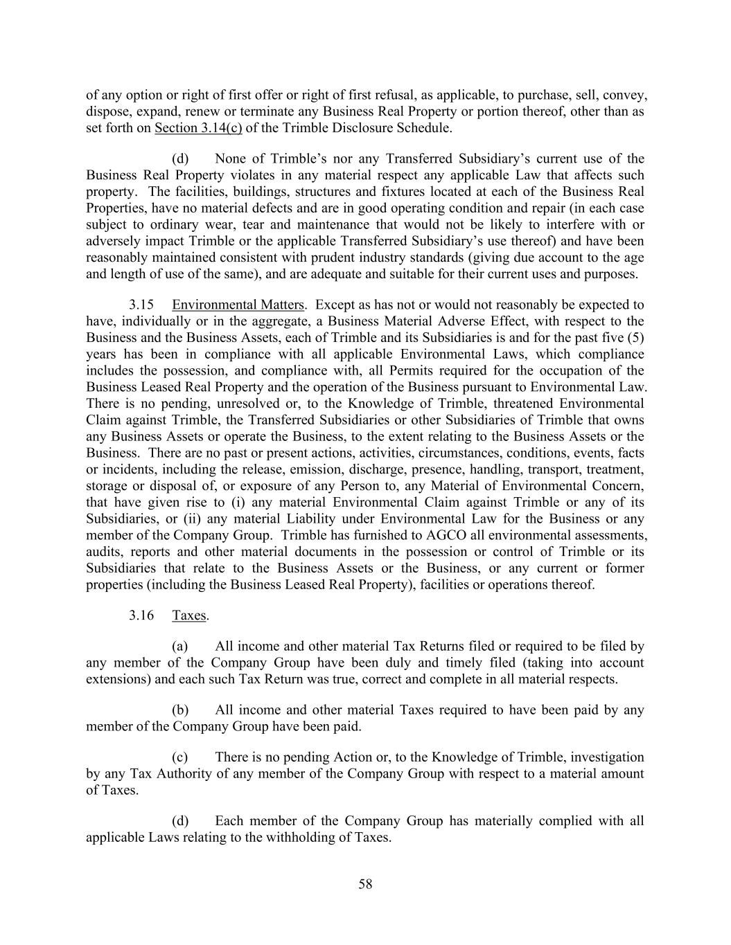 58 of any option or right of first offer or right of first refusal, as applicable, to purchase, sell, convey, dispose, expand, renew or terminate any Business Real Property or portion thereof, other than as set forth on Section 3.14(c) of the Trimble Disclosure Schedule. (d) None of Trimble’s nor any Transferred Subsidiary’s current use of the Business Real Property violates in any material respect any applicable Law that affects such property. The facilities, buildings, structures and fixtures located at each of the Business Real Properties, have no material defects and are in good operating condition and repair (in each case subject to ordinary wear, tear and maintenance that would not be likely to interfere with or adversely impact Trimble or the applicable Transferred Subsidiary’s use thereof) and have been reasonably maintained consistent with prudent industry standards (giving due account to the age and length of use of the same), and are adequate and suitable for their current uses and purposes. 3.15 Environmental Matters. Except as has not or would not reasonably be expected to have, individually or in the aggregate, a Business Material Adverse Effect, with respect to the Business and the Business Assets, each of Trimble and its Subsidiaries is and for the past five (5) years has been in compliance with all applicable Environmental Laws, which compliance includes the possession, and compliance with, all Permits required for the occupation of the Business Leased Real Property and the operation of the Business pursuant to Environmental Law. There is no pending, unresolved or, to the Knowledge of Trimble, threatened Environmental Claim against Trimble, the Transferred Subsidiaries or other Subsidiaries of Trimble that owns any Business Assets or operate the Business, to the extent relating to the Business Assets or the Business. There are no past or present actions, activities, circumstances, conditions, events, facts or incidents, including the release, emission, discharge, presence, handling, transport, treatment, storage or disposal of, or exposure of any Person to, any Material of Environmental Concern, that have given rise to (i) any material Environmental Claim against Trimble or any of its Subsidiaries, or (ii) any material Liability under Environmental Law for the Business or any member of the Company Group. Trimble has furnished to AGCO all environmental assessments, audits, reports and other material documents in the possession or control of Trimble or its Subsidiaries that relate to the Business Assets or the Business, or any current or former properties (including the Business Leased Real Property), facilities or operations thereof. 3.16 Taxes. (a) All income and other material Tax Returns filed or required to be filed by any member of the Company Group have been duly and timely filed (taking into account extensions) and each such Tax Return was true, correct and complete in all material respects. (b) All income and other material Taxes required to have been paid by any member of the Company Group have been paid. (c) There is no pending Action or, to the Knowledge of Trimble, investigation by any Tax Authority of any member of the Company Group with respect to a material amount of Taxes. (d) Each member of the Company Group has materially complied with all applicable Laws relating to the withholding of Taxes.