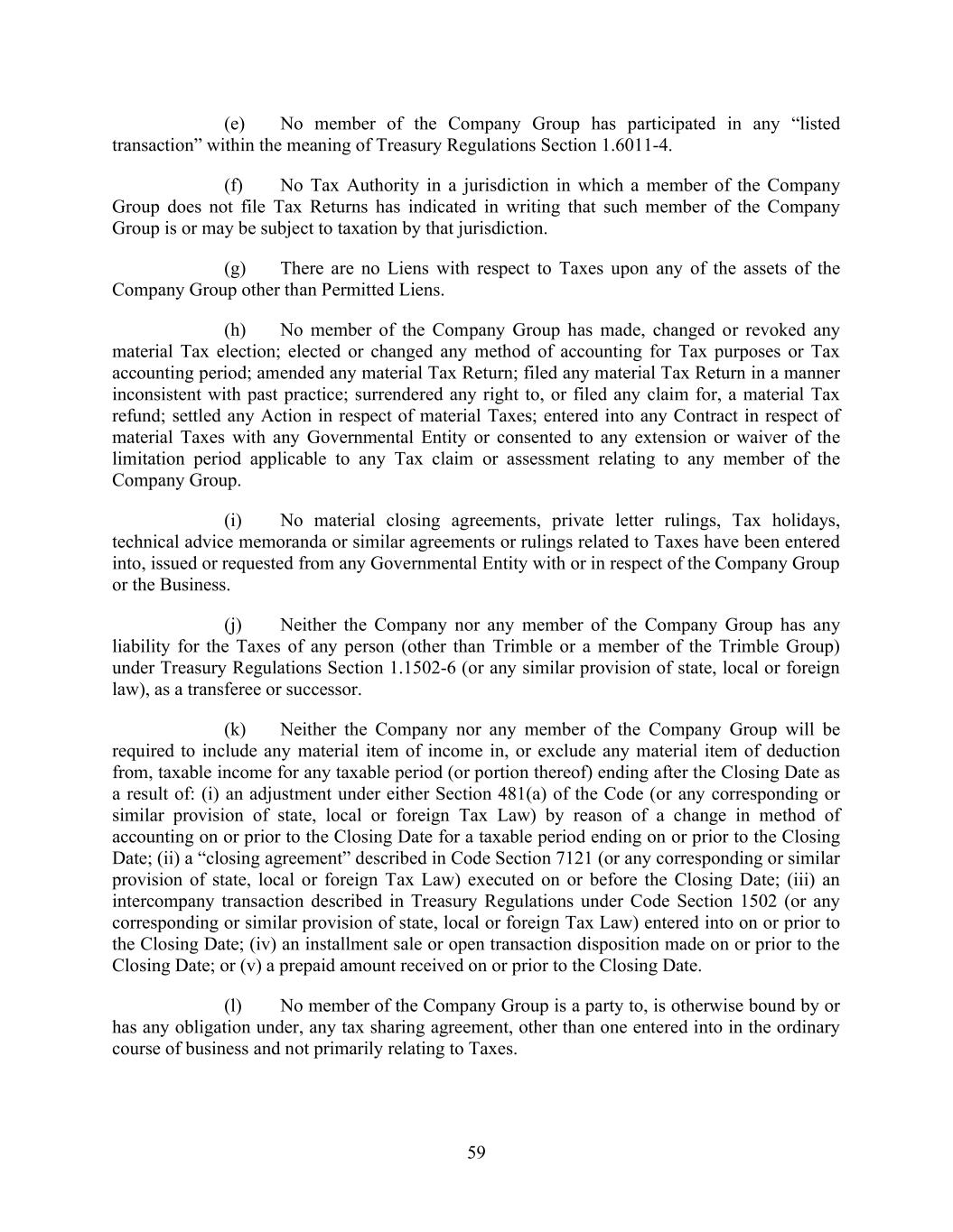 59 (e) No member of the Company Group has participated in any “listed transaction” within the meaning of Treasury Regulations Section 1.6011-4. (f) No Tax Authority in a jurisdiction in which a member of the Company Group does not file Tax Returns has indicated in writing that such member of the Company Group is or may be subject to taxation by that jurisdiction. (g) There are no Liens with respect to Taxes upon any of the assets of the Company Group other than Permitted Liens. (h) No member of the Company Group has made, changed or revoked any material Tax election; elected or changed any method of accounting for Tax purposes or Tax accounting period; amended any material Tax Return; filed any material Tax Return in a manner inconsistent with past practice; surrendered any right to, or filed any claim for, a material Tax refund; settled any Action in respect of material Taxes; entered into any Contract in respect of material Taxes with any Governmental Entity or consented to any extension or waiver of the limitation period applicable to any Tax claim or assessment relating to any member of the Company Group. (i) No material closing agreements, private letter rulings, Tax holidays, technical advice memoranda or similar agreements or rulings related to Taxes have been entered into, issued or requested from any Governmental Entity with or in respect of the Company Group or the Business. (j) Neither the Company nor any member of the Company Group has any liability for the Taxes of any person (other than Trimble or a member of the Trimble Group) under Treasury Regulations Section 1.1502-6 (or any similar provision of state, local or foreign law), as a transferee or successor. (k) Neither the Company nor any member of the Company Group will be required to include any material item of income in, or exclude any material item of deduction from, taxable income for any taxable period (or portion thereof) ending after the Closing Date as a result of: (i) an adjustment under either Section 481(a) of the Code (or any corresponding or similar provision of state, local or foreign Tax Law) by reason of a change in method of accounting on or prior to the Closing Date for a taxable period ending on or prior to the Closing Date; (ii) a “closing agreement” described in Code Section 7121 (or any corresponding or similar provision of state, local or foreign Tax Law) executed on or before the Closing Date; (iii) an intercompany transaction described in Treasury Regulations under Code Section 1502 (or any corresponding or similar provision of state, local or foreign Tax Law) entered into on or prior to the Closing Date; (iv) an installment sale or open transaction disposition made on or prior to the Closing Date; or (v) a prepaid amount received on or prior to the Closing Date. (l) No member of the Company Group is a party to, is otherwise bound by or has any obligation under, any tax sharing agreement, other than one entered into in the ordinary course of business and not primarily relating to Taxes.