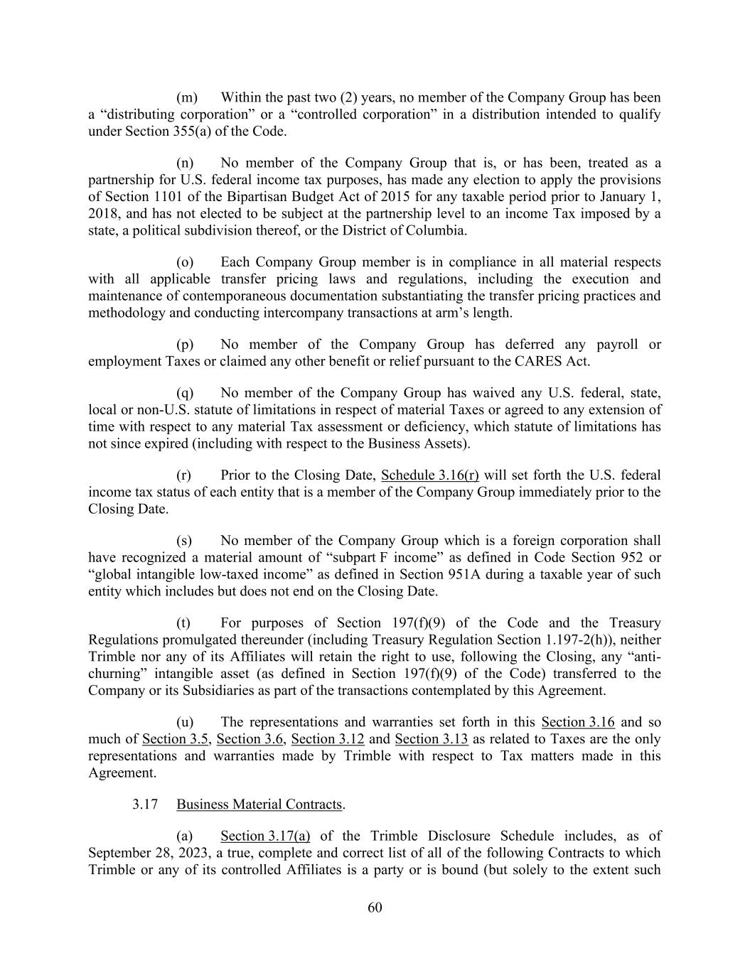 60 (m) Within the past two (2) years, no member of the Company Group has been a “distributing corporation” or a “controlled corporation” in a distribution intended to qualify under Section 355(a) of the Code. (n) No member of the Company Group that is, or has been, treated as a partnership for U.S. federal income tax purposes, has made any election to apply the provisions of Section 1101 of the Bipartisan Budget Act of 2015 for any taxable period prior to January 1, 2018, and has not elected to be subject at the partnership level to an income Tax imposed by a state, a political subdivision thereof, or the District of Columbia. (o) Each Company Group member is in compliance in all material respects with all applicable transfer pricing laws and regulations, including the execution and maintenance of contemporaneous documentation substantiating the transfer pricing practices and methodology and conducting intercompany transactions at arm’s length. (p) No member of the Company Group has deferred any payroll or employment Taxes or claimed any other benefit or relief pursuant to the CARES Act. (q) No member of the Company Group has waived any U.S. federal, state, local or non-U.S. statute of limitations in respect of material Taxes or agreed to any extension of time with respect to any material Tax assessment or deficiency, which statute of limitations has not since expired (including with respect to the Business Assets). (r) Prior to the Closing Date, Schedule 3.16(r) will set forth the U.S. federal income tax status of each entity that is a member of the Company Group immediately prior to the Closing Date. (s) No member of the Company Group which is a foreign corporation shall have recognized a material amount of “subpart F income” as defined in Code Section 952 or “global intangible low-taxed income” as defined in Section 951A during a taxable year of such entity which includes but does not end on the Closing Date. (t) For purposes of Section 197(f)(9) of the Code and the Treasury Regulations promulgated thereunder (including Treasury Regulation Section 1.197-2(h)), neither Trimble nor any of its Affiliates will retain the right to use, following the Closing, any “anti- churning” intangible asset (as defined in Section 197(f)(9) of the Code) transferred to the Company or its Subsidiaries as part of the transactions contemplated by this Agreement. (u) The representations and warranties set forth in this Section 3.16 and so much of Section 3.5, Section 3.6, Section 3.12 and Section 3.13 as related to Taxes are the only representations and warranties made by Trimble with respect to Tax matters made in this Agreement. 3.17 Business Material Contracts. (a) Section 3.17(a) of the Trimble Disclosure Schedule includes, as of September 28, 2023, a true, complete and correct list of all of the following Contracts to which Trimble or any of its controlled Affiliates is a party or is bound (but solely to the extent such