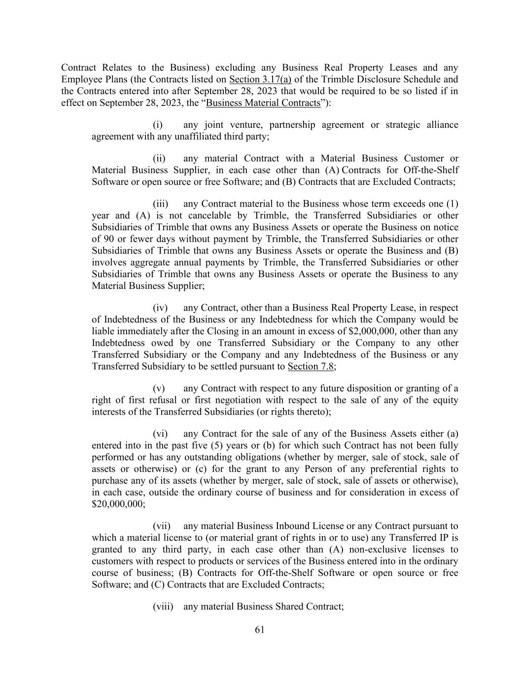 61 Contract Relates to the Business) excluding any Business Real Property Leases and any Employee Plans (the Contracts listed on Section 3.17(a) of the Trimble Disclosure Schedule and the Contracts entered into after September 28, 2023 that would be required to be so listed if in effect on September 28, 2023, the “Business Material Contracts”): (i) any joint venture, partnership agreement or strategic alliance agreement with any unaffiliated third party; (ii) any material Contract with a Material Business Customer or Material Business Supplier, in each case other than (A) Contracts for Off-the-Shelf Software or open source or free Software; and (B) Contracts that are Excluded Contracts; (iii) any Contract material to the Business whose term exceeds one (1) year and (A) is not cancelable by Trimble, the Transferred Subsidiaries or other Subsidiaries of Trimble that owns any Business Assets or operate the Business on notice of 90 or fewer days without payment by Trimble, the Transferred Subsidiaries or other Subsidiaries of Trimble that owns any Business Assets or operate the Business and (B) involves aggregate annual payments by Trimble, the Transferred Subsidiaries or other Subsidiaries of Trimble that owns any Business Assets or operate the Business to any Material Business Supplier; (iv) any Contract, other than a Business Real Property Lease, in respect of Indebtedness of the Business or any Indebtedness for which the Company would be liable immediately after the Closing in an amount in excess of $2,000,000, other than any Indebtedness owed by one Transferred Subsidiary or the Company to any other Transferred Subsidiary or the Company and any Indebtedness of the Business or any Transferred Subsidiary to be settled pursuant to Section 7.8; (v) any Contract with respect to any future disposition or granting of a right of first refusal or first negotiation with respect to the sale of any of the equity interests of the Transferred Subsidiaries (or rights thereto); (vi) any Contract for the sale of any of the Business Assets either (a) entered into in the past five (5) years or (b) for which such Contract has not been fully performed or has any outstanding obligations (whether by merger, sale of stock, sale of assets or otherwise) or (c) for the grant to any Person of any preferential rights to purchase any of its assets (whether by merger, sale of stock, sale of assets or otherwise), in each case, outside the ordinary course of business and for consideration in excess of $20,000,000; (vii) any material Business Inbound License or any Contract pursuant to which a material license to (or material grant of rights in or to use) any Transferred IP is granted to any third party, in each case other than (A) non-exclusive licenses to customers with respect to products or services of the Business entered into in the ordinary course of business; (B) Contracts for Off-the-Shelf Software or open source or free Software; and (C) Contracts that are Excluded Contracts; (viii) any material Business Shared Contract;