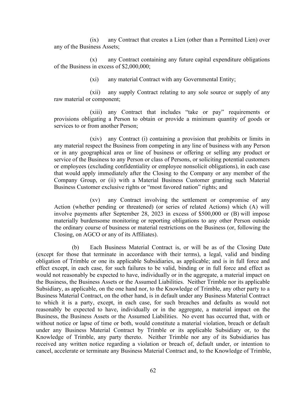 62 (ix) any Contract that creates a Lien (other than a Permitted Lien) over any of the Business Assets; (x) any Contract containing any future capital expenditure obligations of the Business in excess of $2,000,000; (xi) any material Contract with any Governmental Entity; (xii) any supply Contract relating to any sole source or supply of any raw material or component; (xiii) any Contract that includes “take or pay” requirements or provisions obligating a Person to obtain or provide a minimum quantity of goods or services to or from another Person; (xiv) any Contract (i) containing a provision that prohibits or limits in any material respect the Business from competing in any line of business with any Person or in any geographical area or line of business or offering or selling any product or service of the Business to any Person or class of Persons, or soliciting potential customers or employees (excluding confidentiality or employee nonsolicit obligations), in each case that would apply immediately after the Closing to the Company or any member of the Company Group, or (ii) with a Material Business Customer granting such Material Business Customer exclusive rights or “most favored nation” rights; and (xv) any Contract involving the settlement or compromise of any Action (whether pending or threatened) (or series of related Actions) which (A) will involve payments after September 28, 2023 in excess of $500,000 or (B) will impose materially burdensome monitoring or reporting obligations to any other Person outside the ordinary course of business or material restrictions on the Business (or, following the Closing, on AGCO or any of its Affiliates). (b) Each Business Material Contract is, or will be as of the Closing Date (except for those that terminate in accordance with their terms), a legal, valid and binding obligation of Trimble or one its applicable Subsidiaries, as applicable; and is in full force and effect except, in each case, for such failures to be valid, binding or in full force and effect as would not reasonably be expected to have, individually or in the aggregate, a material impact on the Business, the Business Assets or the Assumed Liabilities. Neither Trimble nor its applicable Subsidiary, as applicable, on the one hand nor, to the Knowledge of Trimble, any other party to a Business Material Contract, on the other hand, is in default under any Business Material Contract to which it is a party, except, in each case, for such breaches and defaults as would not reasonably be expected to have, individually or in the aggregate, a material impact on the Business, the Business Assets or the Assumed Liabilities. No event has occurred that, with or without notice or lapse of time or both, would constitute a material violation, breach or default under any Business Material Contract by Trimble or its applicable Subsidiary or, to the Knowledge of Trimble, any party thereto. Neither Trimble nor any of its Subsidiaries has received any written notice regarding a violation or breach of, default under, or intention to cancel, accelerate or terminate any Business Material Contract and, to the Knowledge of Trimble,