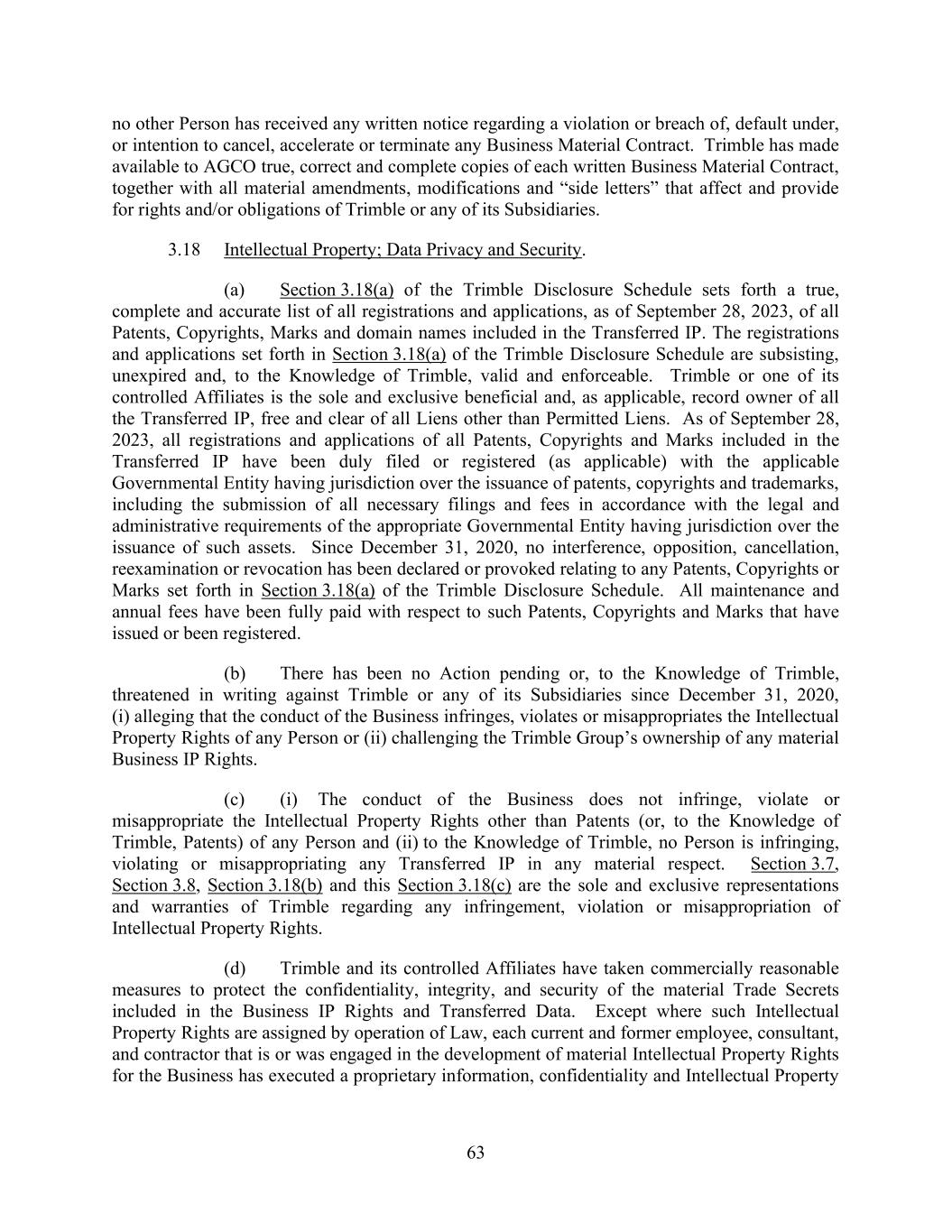 63 no other Person has received any written notice regarding a violation or breach of, default under, or intention to cancel, accelerate or terminate any Business Material Contract. Trimble has made available to AGCO true, correct and complete copies of each written Business Material Contract, together with all material amendments, modifications and “side letters” that affect and provide for rights and/or obligations of Trimble or any of its Subsidiaries. 3.18 Intellectual Property; Data Privacy and Security. (a) Section 3.18(a) of the Trimble Disclosure Schedule sets forth a true, complete and accurate list of all registrations and applications, as of September 28, 2023, of all Patents, Copyrights, Marks and domain names included in the Transferred IP. The registrations and applications set forth in Section 3.18(a) of the Trimble Disclosure Schedule are subsisting, unexpired and, to the Knowledge of Trimble, valid and enforceable. Trimble or one of its controlled Affiliates is the sole and exclusive beneficial and, as applicable, record owner of all the Transferred IP, free and clear of all Liens other than Permitted Liens. As of September 28, 2023, all registrations and applications of all Patents, Copyrights and Marks included in the Transferred IP have been duly filed or registered (as applicable) with the applicable Governmental Entity having jurisdiction over the issuance of patents, copyrights and trademarks, including the submission of all necessary filings and fees in accordance with the legal and administrative requirements of the appropriate Governmental Entity having jurisdiction over the issuance of such assets. Since December 31, 2020, no interference, opposition, cancellation, reexamination or revocation has been declared or provoked relating to any Patents, Copyrights or Marks set forth in Section 3.18(a) of the Trimble Disclosure Schedule. All maintenance and annual fees have been fully paid with respect to such Patents, Copyrights and Marks that have issued or been registered. (b) There has been no Action pending or, to the Knowledge of Trimble, threatened in writing against Trimble or any of its Subsidiaries since December 31, 2020, (i) alleging that the conduct of the Business infringes, violates or misappropriates the Intellectual Property Rights of any Person or (ii) challenging the Trimble Group’s ownership of any material Business IP Rights. (c) (i) The conduct of the Business does not infringe, violate or misappropriate the Intellectual Property Rights other than Patents (or, to the Knowledge of Trimble, Patents) of any Person and (ii) to the Knowledge of Trimble, no Person is infringing, violating or misappropriating any Transferred IP in any material respect. Section 3.7, Section 3.8, Section 3.18(b) and this Section 3.18(c) are the sole and exclusive representations and warranties of Trimble regarding any infringement, violation or misappropriation of Intellectual Property Rights. (d) Trimble and its controlled Affiliates have taken commercially reasonable measures to protect the confidentiality, integrity, and security of the material Trade Secrets included in the Business IP Rights and Transferred Data. Except where such Intellectual Property Rights are assigned by operation of Law, each current and former employee, consultant, and contractor that is or was engaged in the development of material Intellectual Property Rights for the Business has executed a proprietary information, confidentiality and Intellectual Property