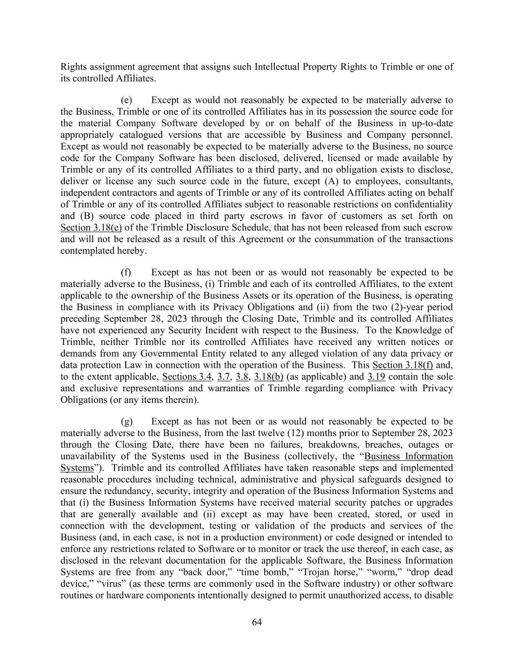 64 Rights assignment agreement that assigns such Intellectual Property Rights to Trimble or one of its controlled Affiliates. (e) Except as would not reasonably be expected to be materially adverse to the Business, Trimble or one of its controlled Affiliates has in its possession the source code for the material Company Software developed by or on behalf of the Business in up-to-date appropriately catalogued versions that are accessible by Business and Company personnel. Except as would not reasonably be expected to be materially adverse to the Business, no source code for the Company Software has been disclosed, delivered, licensed or made available by Trimble or any of its controlled Affiliates to a third party, and no obligation exists to disclose, deliver or license any such source code in the future, except (A) to employees, consultants, independent contractors and agents of Trimble or any of its controlled Affiliates acting on behalf of Trimble or any of its controlled Affiliates subject to reasonable restrictions on confidentiality and (B) source code placed in third party escrows in favor of customers as set forth on Section 3.18(e) of the Trimble Disclosure Schedule, that has not been released from such escrow and will not be released as a result of this Agreement or the consummation of the transactions contemplated hereby. (f) Except as has not been or as would not reasonably be expected to be materially adverse to the Business, (i) Trimble and each of its controlled Affiliates, to the extent applicable to the ownership of the Business Assets or its operation of the Business, is operating the Business in compliance with its Privacy Obligations and (ii) from the two (2)-year period preceding September 28, 2023 through the Closing Date, Trimble and its controlled Affiliates have not experienced any Security Incident with respect to the Business. To the Knowledge of Trimble, neither Trimble nor its controlled Affiliates have received any written notices or demands from any Governmental Entity related to any alleged violation of any data privacy or data protection Law in connection with the operation of the Business. This Section 3.18(f) and, to the extent applicable, Sections 3.4, 3.7, 3.8, 3.18(b) (as applicable) and 3.19 contain the sole and exclusive representations and warranties of Trimble regarding compliance with Privacy Obligations (or any items therein). (g) Except as has not been or as would not reasonably be expected to be materially adverse to the Business, from the last twelve (12) months prior to September 28, 2023 through the Closing Date, there have been no failures, breakdowns, breaches, outages or unavailability of the Systems used in the Business (collectively, the “Business Information Systems”). Trimble and its controlled Affiliates have taken reasonable steps and implemented reasonable procedures including technical, administrative and physical safeguards designed to ensure the redundancy, security, integrity and operation of the Business Information Systems and that (i) the Business Information Systems have received material security patches or upgrades that are generally available and (ii) except as may have been created, stored, or used in connection with the development, testing or validation of the products and services of the Business (and, in each case, is not in a production environment) or code designed or intended to enforce any restrictions related to Software or to monitor or track the use thereof, in each case, as disclosed in the relevant documentation for the applicable Software, the Business Information Systems are free from any “back door,” “time bomb,” “Trojan horse,” “worm,” “drop dead device,” “virus” (as these terms are commonly used in the Software industry) or other software routines or hardware components intentionally designed to permit unauthorized access, to disable