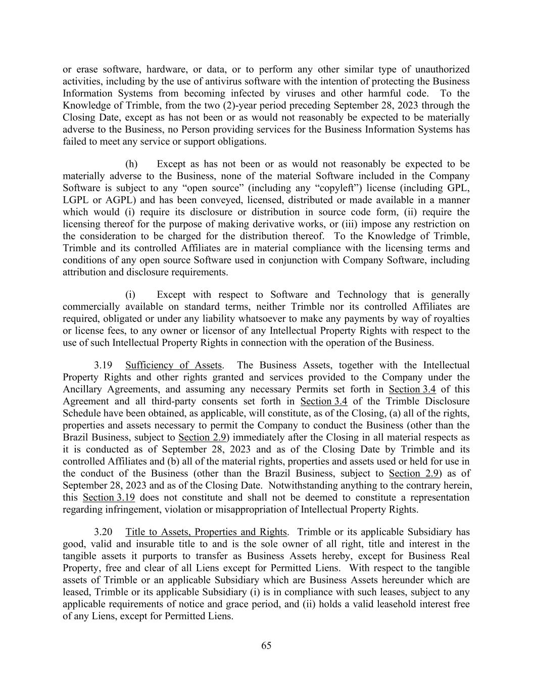 65 or erase software, hardware, or data, or to perform any other similar type of unauthorized activities, including by the use of antivirus software with the intention of protecting the Business Information Systems from becoming infected by viruses and other harmful code. To the Knowledge of Trimble, from the two (2)-year period preceding September 28, 2023 through the Closing Date, except as has not been or as would not reasonably be expected to be materially adverse to the Business, no Person providing services for the Business Information Systems has failed to meet any service or support obligations. (h) Except as has not been or as would not reasonably be expected to be materially adverse to the Business, none of the material Software included in the Company Software is subject to any “open source” (including any “copyleft”) license (including GPL, LGPL or AGPL) and has been conveyed, licensed, distributed or made available in a manner which would (i) require its disclosure or distribution in source code form, (ii) require the licensing thereof for the purpose of making derivative works, or (iii) impose any restriction on the consideration to be charged for the distribution thereof. To the Knowledge of Trimble, Trimble and its controlled Affiliates are in material compliance with the licensing terms and conditions of any open source Software used in conjunction with Company Software, including attribution and disclosure requirements. (i) Except with respect to Software and Technology that is generally commercially available on standard terms, neither Trimble nor its controlled Affiliates are required, obligated or under any liability whatsoever to make any payments by way of royalties or license fees, to any owner or licensor of any Intellectual Property Rights with respect to the use of such Intellectual Property Rights in connection with the operation of the Business. 3.19 Sufficiency of Assets. The Business Assets, together with the Intellectual Property Rights and other rights granted and services provided to the Company under the Ancillary Agreements, and assuming any necessary Permits set forth in Section 3.4 of this Agreement and all third-party consents set forth in Section 3.4 of the Trimble Disclosure Schedule have been obtained, as applicable, will constitute, as of the Closing, (a) all of the rights, properties and assets necessary to permit the Company to conduct the Business (other than the Brazil Business, subject to Section 2.9) immediately after the Closing in all material respects as it is conducted as of September 28, 2023 and as of the Closing Date by Trimble and its controlled Affiliates and (b) all of the material rights, properties and assets used or held for use in the conduct of the Business (other than the Brazil Business, subject to Section 2.9) as of September 28, 2023 and as of the Closing Date. Notwithstanding anything to the contrary herein, this Section 3.19 does not constitute and shall not be deemed to constitute a representation regarding infringement, violation or misappropriation of Intellectual Property Rights. 3.20 Title to Assets, Properties and Rights. Trimble or its applicable Subsidiary has good, valid and insurable title to and is the sole owner of all right, title and interest in the tangible assets it purports to transfer as Business Assets hereby, except for Business Real Property, free and clear of all Liens except for Permitted Liens. With respect to the tangible assets of Trimble or an applicable Subsidiary which are Business Assets hereunder which are leased, Trimble or its applicable Subsidiary (i) is in compliance with such leases, subject to any applicable requirements of notice and grace period, and (ii) holds a valid leasehold interest free of any Liens, except for Permitted Liens.
