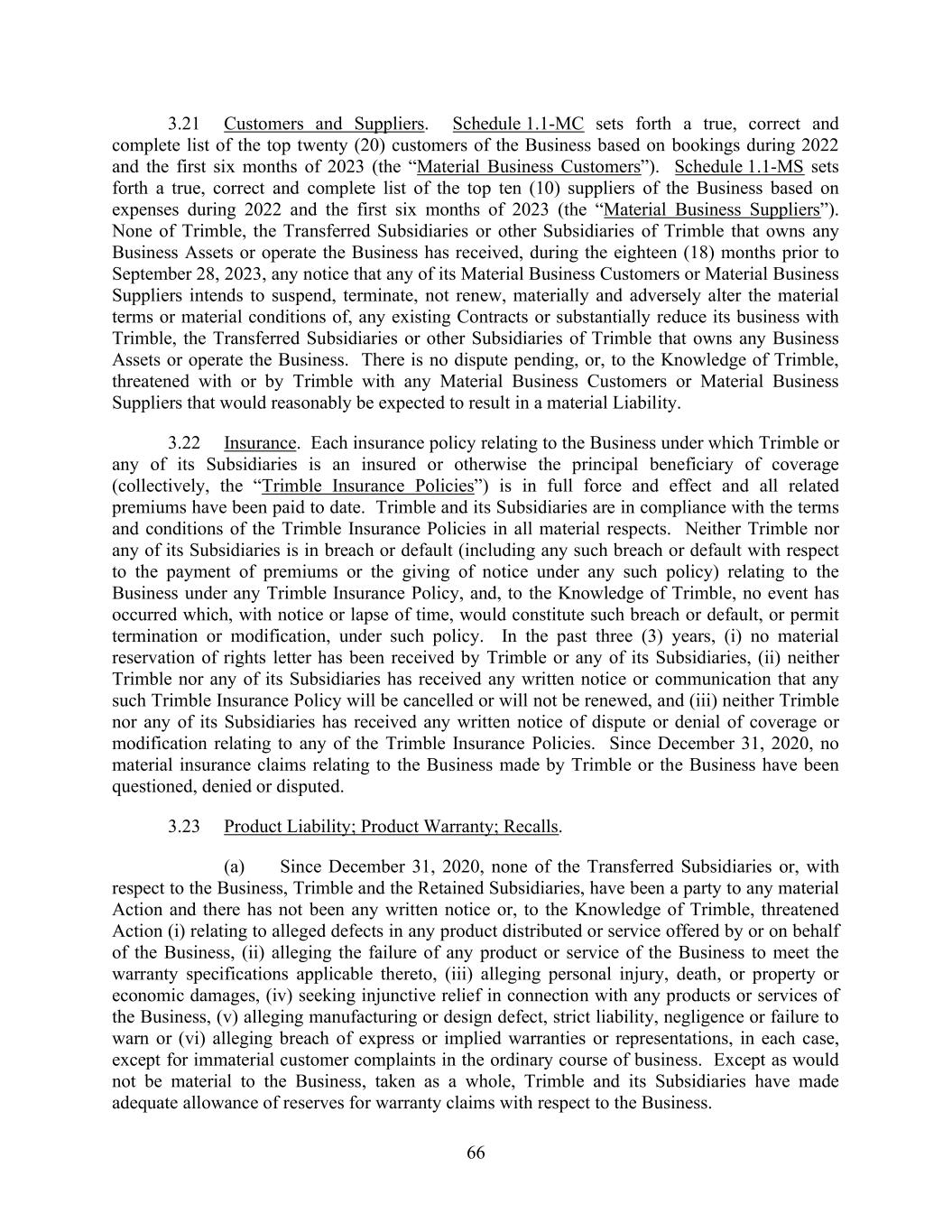 66 3.21 Customers and Suppliers. Schedule 1.1-MC sets forth a true, correct and complete list of the top twenty (20) customers of the Business based on bookings during 2022 and the first six months of 2023 (the “Material Business Customers”). Schedule 1.1-MS sets forth a true, correct and complete list of the top ten (10) suppliers of the Business based on expenses during 2022 and the first six months of 2023 (the “Material Business Suppliers”). None of Trimble, the Transferred Subsidiaries or other Subsidiaries of Trimble that owns any Business Assets or operate the Business has received, during the eighteen (18) months prior to September 28, 2023, any notice that any of its Material Business Customers or Material Business Suppliers intends to suspend, terminate, not renew, materially and adversely alter the material terms or material conditions of, any existing Contracts or substantially reduce its business with Trimble, the Transferred Subsidiaries or other Subsidiaries of Trimble that owns any Business Assets or operate the Business. There is no dispute pending, or, to the Knowledge of Trimble, threatened with or by Trimble with any Material Business Customers or Material Business Suppliers that would reasonably be expected to result in a material Liability. 3.22 Insurance. Each insurance policy relating to the Business under which Trimble or any of its Subsidiaries is an insured or otherwise the principal beneficiary of coverage (collectively, the “Trimble Insurance Policies”) is in full force and effect and all related premiums have been paid to date. Trimble and its Subsidiaries are in compliance with the terms and conditions of the Trimble Insurance Policies in all material respects. Neither Trimble nor any of its Subsidiaries is in breach or default (including any such breach or default with respect to the payment of premiums or the giving of notice under any such policy) relating to the Business under any Trimble Insurance Policy, and, to the Knowledge of Trimble, no event has occurred which, with notice or lapse of time, would constitute such breach or default, or permit termination or modification, under such policy. In the past three (3) years, (i) no material reservation of rights letter has been received by Trimble or any of its Subsidiaries, (ii) neither Trimble nor any of its Subsidiaries has received any written notice or communication that any such Trimble Insurance Policy will be cancelled or will not be renewed, and (iii) neither Trimble nor any of its Subsidiaries has received any written notice of dispute or denial of coverage or modification relating to any of the Trimble Insurance Policies. Since December 31, 2020, no material insurance claims relating to the Business made by Trimble or the Business have been questioned, denied or disputed. 3.23 Product Liability; Product Warranty; Recalls. (a) Since December 31, 2020, none of the Transferred Subsidiaries or, with respect to the Business, Trimble and the Retained Subsidiaries, have been a party to any material Action and there has not been any written notice or, to the Knowledge of Trimble, threatened Action (i) relating to alleged defects in any product distributed or service offered by or on behalf of the Business, (ii) alleging the failure of any product or service of the Business to meet the warranty specifications applicable thereto, (iii) alleging personal injury, death, or property or economic damages, (iv) seeking injunctive relief in connection with any products or services of the Business, (v) alleging manufacturing or design defect, strict liability, negligence or failure to warn or (vi) alleging breach of express or implied warranties or representations, in each case, except for immaterial customer complaints in the ordinary course of business. Except as would not be material to the Business, taken as a whole, Trimble and its Subsidiaries have made adequate allowance of reserves for warranty claims with respect to the Business.