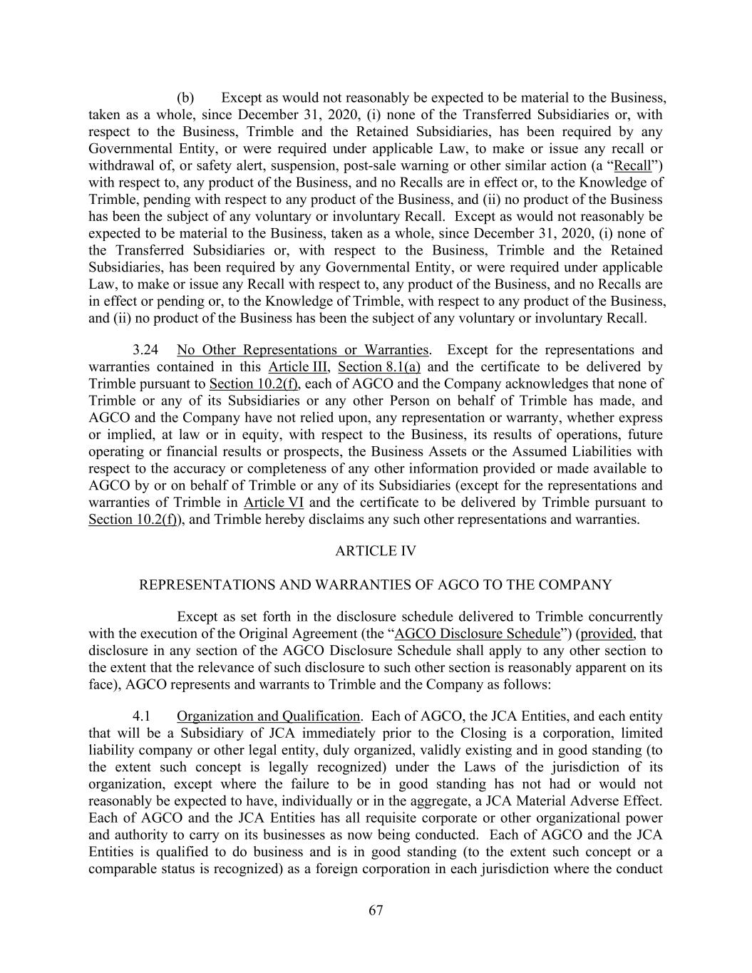 67 (b) Except as would not reasonably be expected to be material to the Business, taken as a whole, since December 31, 2020, (i) none of the Transferred Subsidiaries or, with respect to the Business, Trimble and the Retained Subsidiaries, has been required by any Governmental Entity, or were required under applicable Law, to make or issue any recall or withdrawal of, or safety alert, suspension, post-sale warning or other similar action (a “Recall”) with respect to, any product of the Business, and no Recalls are in effect or, to the Knowledge of Trimble, pending with respect to any product of the Business, and (ii) no product of the Business has been the subject of any voluntary or involuntary Recall. Except as would not reasonably be expected to be material to the Business, taken as a whole, since December 31, 2020, (i) none of the Transferred Subsidiaries or, with respect to the Business, Trimble and the Retained Subsidiaries, has been required by any Governmental Entity, or were required under applicable Law, to make or issue any Recall with respect to, any product of the Business, and no Recalls are in effect or pending or, to the Knowledge of Trimble, with respect to any product of the Business, and (ii) no product of the Business has been the subject of any voluntary or involuntary Recall. 3.24 No Other Representations or Warranties. Except for the representations and warranties contained in this Article III, Section 8.1(a) and the certificate to be delivered by Trimble pursuant to Section 10.2(f), each of AGCO and the Company acknowledges that none of Trimble or any of its Subsidiaries or any other Person on behalf of Trimble has made, and AGCO and the Company have not relied upon, any representation or warranty, whether express or implied, at law or in equity, with respect to the Business, its results of operations, future operating or financial results or prospects, the Business Assets or the Assumed Liabilities with respect to the accuracy or completeness of any other information provided or made available to AGCO by or on behalf of Trimble or any of its Subsidiaries (except for the representations and warranties of Trimble in Article VI and the certificate to be delivered by Trimble pursuant to Section 10.2(f)), and Trimble hereby disclaims any such other representations and warranties. ARTICLE IV REPRESENTATIONS AND WARRANTIES OF AGCO TO THE COMPANY Except as set forth in the disclosure schedule delivered to Trimble concurrently with the execution of the Original Agreement (the “AGCO Disclosure Schedule”) (provided, that disclosure in any section of the AGCO Disclosure Schedule shall apply to any other section to the extent that the relevance of such disclosure to such other section is reasonably apparent on its face), AGCO represents and warrants to Trimble and the Company as follows: 4.1 Organization and Qualification. Each of AGCO, the JCA Entities, and each entity that will be a Subsidiary of JCA immediately prior to the Closing is a corporation, limited liability company or other legal entity, duly organized, validly existing and in good standing (to the extent such concept is legally recognized) under the Laws of the jurisdiction of its organization, except where the failure to be in good standing has not had or would not reasonably be expected to have, individually or in the aggregate, a JCA Material Adverse Effect. Each of AGCO and the JCA Entities has all requisite corporate or other organizational power and authority to carry on its businesses as now being conducted. Each of AGCO and the JCA Entities is qualified to do business and is in good standing (to the extent such concept or a comparable status is recognized) as a foreign corporation in each jurisdiction where the conduct