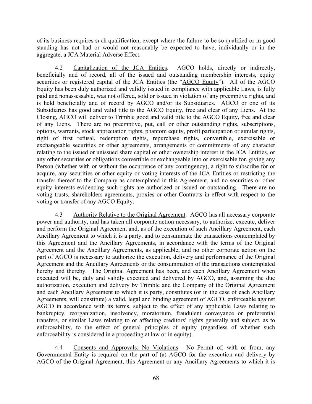 68 of its business requires such qualification, except where the failure to be so qualified or in good standing has not had or would not reasonably be expected to have, individually or in the aggregate, a JCA Material Adverse Effect. 4.2 Capitalization of the JCA Entities. AGCO holds, directly or indirectly, beneficially and of record, all of the issued and outstanding membership interests, equity securities or registered capital of the JCA Entities (the “AGCO Equity”). All of the AGCO Equity has been duly authorized and validly issued in compliance with applicable Laws, is fully paid and nonassessable, was not offered, sold or issued in violation of any preemptive rights, and is held beneficially and of record by AGCO and/or its Subsidiaries. AGCO or one of its Subsidiaries has good and valid title to the AGCO Equity, free and clear of any Liens. At the Closing, AGCO will deliver to Trimble good and valid title to the AGCO Equity, free and clear of any Liens. There are no preemptive, put, call or other outstanding rights, subscriptions, options, warrants, stock appreciation rights, phantom equity, profit participation or similar rights, right of first refusal, redemption rights, repurchase rights, convertible, exercisable or exchangeable securities or other agreements, arrangements or commitments of any character relating to the issued or unissued share capital or other ownership interest in the JCA Entities, or any other securities or obligations convertible or exchangeable into or exercisable for, giving any Person (whether with or without the occurrence of any contingency), a right to subscribe for or acquire, any securities or other equity or voting interests of the JCA Entities or restricting the transfer thereof to the Company as contemplated in this Agreement, and no securities or other equity interests evidencing such rights are authorized or issued or outstanding. There are no voting trusts, shareholders agreements, proxies or other Contracts in effect with respect to the voting or transfer of any AGCO Equity. 4.3 Authority Relative to the Original Agreement. AGCO has all necessary corporate power and authority, and has taken all corporate action necessary, to authorize, execute, deliver and perform the Original Agreement and, as of the execution of such Ancillary Agreement, each Ancillary Agreement to which it is a party, and to consummate the transactions contemplated by this Agreement and the Ancillary Agreements, in accordance with the terms of the Original Agreement and the Ancillary Agreements, as applicable, and no other corporate action on the part of AGCO is necessary to authorize the execution, delivery and performance of the Original Agreement and the Ancillary Agreements or the consummation of the transactions contemplated hereby and thereby. The Original Agreement has been, and each Ancillary Agreement when executed will be, duly and validly executed and delivered by AGCO, and, assuming the due authorization, execution and delivery by Trimble and the Company of the Original Agreement and each Ancillary Agreement to which it is party, constitutes (or in the case of each Ancillary Agreements, will constitute) a valid, legal and binding agreement of AGCO, enforceable against AGCO in accordance with its terms, subject to the effect of any applicable Laws relating to bankruptcy, reorganization, insolvency, moratorium, fraudulent conveyance or preferential transfers, or similar Laws relating to or affecting creditors’ rights generally and subject, as to enforceability, to the effect of general principles of equity (regardless of whether such enforceability is considered in a proceeding at law or in equity). 4.4 Consents and Approvals; No Violations. No Permit of, with or from, any Governmental Entity is required on the part of (a) AGCO for the execution and delivery by AGCO of the Original Agreement, this Agreement or any Ancillary Agreements to which it is