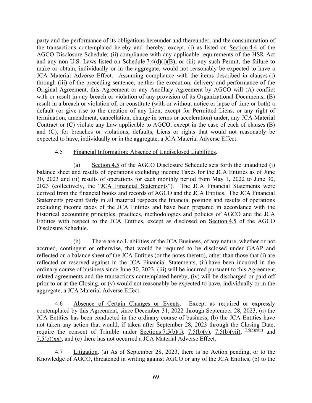 69 party and the performance of its obligations hereunder and thereunder, and the consummation of the transactions contemplated hereby and thereby, except, (i) as listed on Section 4.4 of the AGCO Disclosure Schedule; (ii) compliance with any applicable requirements of the HSR Act and any non-U.S. Laws listed on Schedule 7.4(d)(i)(B); or (iii) any such Permit, the failure to make or obtain, individually or in the aggregate, would not reasonably be expected to have a JCA Material Adverse Effect. Assuming compliance with the items described in clauses (i) through (iii) of the preceding sentence, neither the execution, delivery and performance of the Original Agreement, this Agreement or any Ancillary Agreement by AGCO will (A) conflict with or result in any breach or violation of any provision of its Organizational Documents, (B) result in a breach or violation of, or constitute (with or without notice or lapse of time or both) a default (or give rise to the creation of any Lien, except for Permitted Liens, or any right of termination, amendment, cancellation, change in terms or acceleration) under, any JCA Material Contract or (C) violate any Law applicable to AGCO, except in the case of each of clauses (B) and (C), for breaches or violations, defaults, Liens or rights that would not reasonably be expected to have, individually or in the aggregate, a JCA Material Adverse Effect. 4.5 Financial Information; Absence of Undisclosed Liabilities. (a) Section 4.5 of the AGCO Disclosure Schedule sets forth the unaudited (i) balance sheet and results of operations excluding income Taxes for the JCA Entities as of June 30, 2023 and (ii) results of operations for each monthly period from May 1, 2022 to June 30, 2023 (collectively, the “JCA Financial Statements”). The JCA Financial Statements were derived from the financial books and records of AGCO and the JCA Entities. The JCA Financial Statements present fairly in all material respects the financial position and results of operations excluding income taxes of the JCA Entities and have been prepared in accordance with the historical accounting principles, practices, methodologies and policies of AGCO and the JCA Entities with respect to the JCA Entities, except as disclosed on Section 4.5 of the AGCO Disclosure Schedule. (b) There are no Liabilities of the JCA Business, of any nature, whether or not accrued, contingent or otherwise, that would be required to be disclosed under GAAP and reflected on a balance sheet of the JCA Entities (or the notes thereto), other than those that (i) are reflected or reserved against in the JCA Financial Statements, (ii) have been incurred in the ordinary course of business since June 30, 2023, (iii) will be incurred pursuant to this Agreement, related agreements and the transactions contemplated hereby, (iv) will be discharged or paid off prior to or at the Closing, or (v) would not reasonably be expected to have, individually or in the aggregate, a JCA Material Adverse Effect. 4.6 Absence of Certain Changes or Events. Except as required or expressly contemplated by this Agreement, since December 31, 2022 through September 28, 2023, (a) the JCA Entities has been conducted in the ordinary course of business, (b) the JCA Entities have not taken any action that would, if taken after September 28, 2023 through the Closing Date, require the consent of Trimble under Sections 7.5(b)(i), 7.5(b)(v), 7.5(b)(vii), 7.5(b)(xiii) and 7.5(b)(xx), and (c) there has not occurred a JCA Material Adverse Effect. 4.7 Litigation. (a) As of September 28, 2023, there is no Action pending, or to the Knowledge of AGCO, threatened in writing against AGCO or any of the JCA Entities, (b) to the