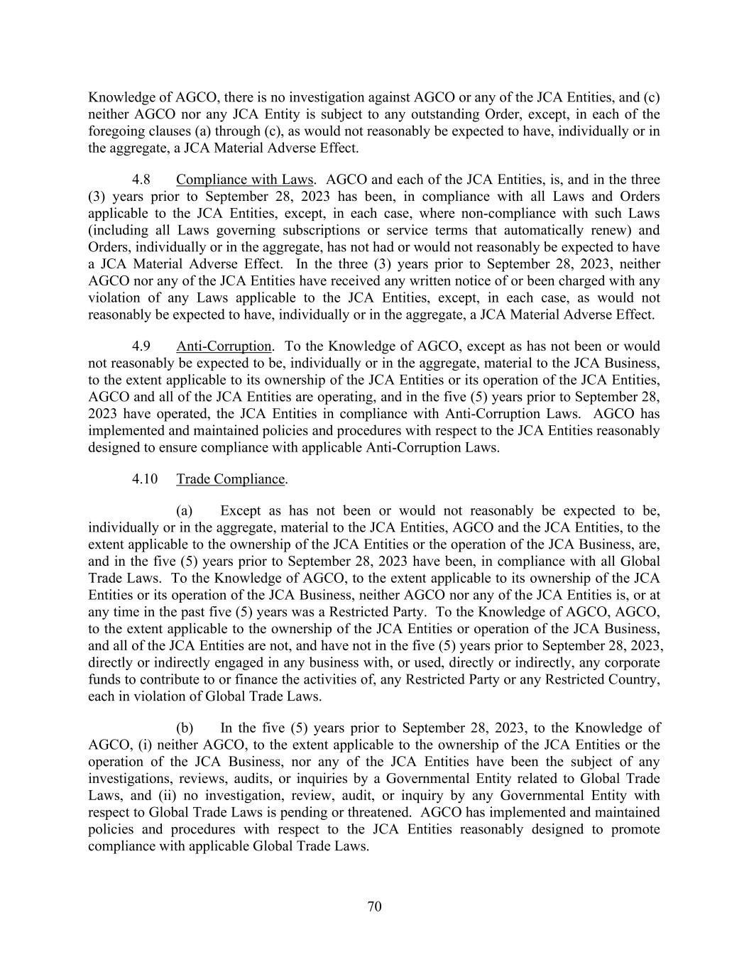 70 Knowledge of AGCO, there is no investigation against AGCO or any of the JCA Entities, and (c) neither AGCO nor any JCA Entity is subject to any outstanding Order, except, in each of the foregoing clauses (a) through (c), as would not reasonably be expected to have, individually or in the aggregate, a JCA Material Adverse Effect. 4.8 Compliance with Laws. AGCO and each of the JCA Entities, is, and in the three (3) years prior to September 28, 2023 has been, in compliance with all Laws and Orders applicable to the JCA Entities, except, in each case, where non-compliance with such Laws (including all Laws governing subscriptions or service terms that automatically renew) and Orders, individually or in the aggregate, has not had or would not reasonably be expected to have a JCA Material Adverse Effect. In the three (3) years prior to September 28, 2023, neither AGCO nor any of the JCA Entities have received any written notice of or been charged with any violation of any Laws applicable to the JCA Entities, except, in each case, as would not reasonably be expected to have, individually or in the aggregate, a JCA Material Adverse Effect. 4.9 Anti-Corruption. To the Knowledge of AGCO, except as has not been or would not reasonably be expected to be, individually or in the aggregate, material to the JCA Business, to the extent applicable to its ownership of the JCA Entities or its operation of the JCA Entities, AGCO and all of the JCA Entities are operating, and in the five (5) years prior to September 28, 2023 have operated, the JCA Entities in compliance with Anti-Corruption Laws. AGCO has implemented and maintained policies and procedures with respect to the JCA Entities reasonably designed to ensure compliance with applicable Anti-Corruption Laws. 4.10 Trade Compliance. (a) Except as has not been or would not reasonably be expected to be, individually or in the aggregate, material to the JCA Entities, AGCO and the JCA Entities, to the extent applicable to the ownership of the JCA Entities or the operation of the JCA Business, are, and in the five (5) years prior to September 28, 2023 have been, in compliance with all Global Trade Laws. To the Knowledge of AGCO, to the extent applicable to its ownership of the JCA Entities or its operation of the JCA Business, neither AGCO nor any of the JCA Entities is, or at any time in the past five (5) years was a Restricted Party. To the Knowledge of AGCO, AGCO, to the extent applicable to the ownership of the JCA Entities or operation of the JCA Business, and all of the JCA Entities are not, and have not in the five (5) years prior to September 28, 2023, directly or indirectly engaged in any business with, or used, directly or indirectly, any corporate funds to contribute to or finance the activities of, any Restricted Party or any Restricted Country, each in violation of Global Trade Laws. (b) In the five (5) years prior to September 28, 2023, to the Knowledge of AGCO, (i) neither AGCO, to the extent applicable to the ownership of the JCA Entities or the operation of the JCA Business, nor any of the JCA Entities have been the subject of any investigations, reviews, audits, or inquiries by a Governmental Entity related to Global Trade Laws, and (ii) no investigation, review, audit, or inquiry by any Governmental Entity with respect to Global Trade Laws is pending or threatened. AGCO has implemented and maintained policies and procedures with respect to the JCA Entities reasonably designed to promote compliance with applicable Global Trade Laws.