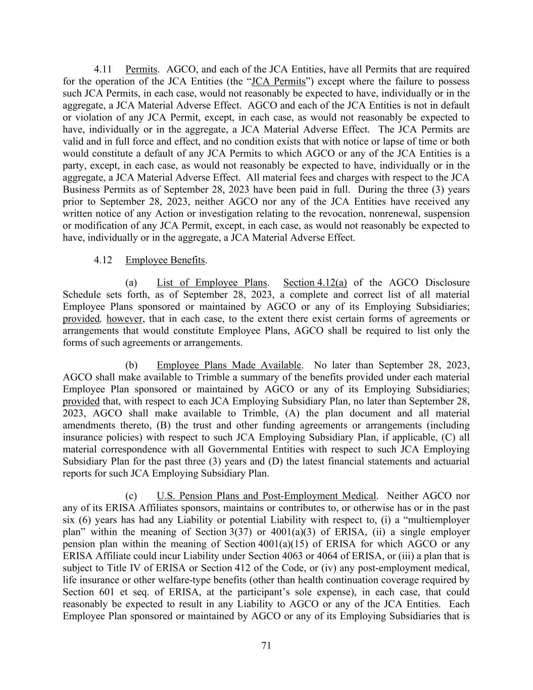 71 4.11 Permits. AGCO, and each of the JCA Entities, have all Permits that are required for the operation of the JCA Entities (the “JCA Permits”) except where the failure to possess such JCA Permits, in each case, would not reasonably be expected to have, individually or in the aggregate, a JCA Material Adverse Effect. AGCO and each of the JCA Entities is not in default or violation of any JCA Permit, except, in each case, as would not reasonably be expected to have, individually or in the aggregate, a JCA Material Adverse Effect. The JCA Permits are valid and in full force and effect, and no condition exists that with notice or lapse of time or both would constitute a default of any JCA Permits to which AGCO or any of the JCA Entities is a party, except, in each case, as would not reasonably be expected to have, individually or in the aggregate, a JCA Material Adverse Effect. All material fees and charges with respect to the JCA Business Permits as of September 28, 2023 have been paid in full. During the three (3) years prior to September 28, 2023, neither AGCO nor any of the JCA Entities have received any written notice of any Action or investigation relating to the revocation, nonrenewal, suspension or modification of any JCA Permit, except, in each case, as would not reasonably be expected to have, individually or in the aggregate, a JCA Material Adverse Effect. 4.12 Employee Benefits. (a) List of Employee Plans. Section 4.12(a) of the AGCO Disclosure Schedule sets forth, as of September 28, 2023, a complete and correct list of all material Employee Plans sponsored or maintained by AGCO or any of its Employing Subsidiaries; provided, however, that in each case, to the extent there exist certain forms of agreements or arrangements that would constitute Employee Plans, AGCO shall be required to list only the forms of such agreements or arrangements. (b) Employee Plans Made Available. No later than September 28, 2023, AGCO shall make available to Trimble a summary of the benefits provided under each material Employee Plan sponsored or maintained by AGCO or any of its Employing Subsidiaries; provided that, with respect to each JCA Employing Subsidiary Plan, no later than September 28, 2023, AGCO shall make available to Trimble, (A) the plan document and all material amendments thereto, (B) the trust and other funding agreements or arrangements (including insurance policies) with respect to such JCA Employing Subsidiary Plan, if applicable, (C) all material correspondence with all Governmental Entities with respect to such JCA Employing Subsidiary Plan for the past three (3) years and (D) the latest financial statements and actuarial reports for such JCA Employing Subsidiary Plan. (c) U.S. Pension Plans and Post-Employment Medical. Neither AGCO nor any of its ERISA Affiliates sponsors, maintains or contributes to, or otherwise has or in the past six (6) years has had any Liability or potential Liability with respect to, (i) a “multiemployer plan” within the meaning of Section 3(37) or 4001(a)(3) of ERISA, (ii) a single employer pension plan within the meaning of Section 4001(a)(15) of ERISA for which AGCO or any ERISA Affiliate could incur Liability under Section 4063 or 4064 of ERISA, or (iii) a plan that is subject to Title IV of ERISA or Section 412 of the Code, or (iv) any post-employment medical, life insurance or other welfare-type benefits (other than health continuation coverage required by Section 601 et seq. of ERISA, at the participant’s sole expense), in each case, that could reasonably be expected to result in any Liability to AGCO or any of the JCA Entities. Each Employee Plan sponsored or maintained by AGCO or any of its Employing Subsidiaries that is