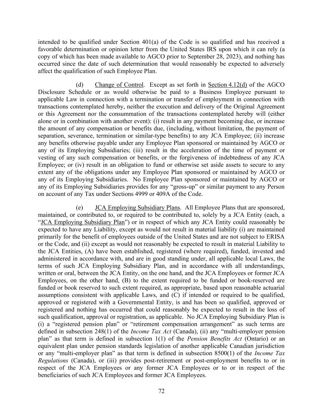 72 intended to be qualified under Section 401(a) of the Code is so qualified and has received a favorable determination or opinion letter from the United States IRS upon which it can rely (a copy of which has been made available to AGCO prior to September 28, 2023), and nothing has occurred since the date of such determination that would reasonably be expected to adversely affect the qualification of such Employee Plan. (d) Change of Control. Except as set forth in Section 4.12(d) of the AGCO Disclosure Schedule or as would otherwise be paid to a Business Employee pursuant to applicable Law in connection with a termination or transfer of employment in connection with transactions contemplated hereby, neither the execution and delivery of the Original Agreement or this Agreement nor the consummation of the transactions contemplated hereby will (either alone or in combination with another event): (i) result in any payment becoming due, or increase the amount of any compensation or benefits due, (including, without limitation, the payment of separation, severance, termination or similar-type benefits) to any JCA Employee; (ii) increase any benefits otherwise payable under any Employee Plan sponsored or maintained by AGCO or any of its Employing Subsidiaries; (iii) result in the acceleration of the time of payment or vesting of any such compensation or benefits, or the forgiveness of indebtedness of any JCA Employee; or (iv) result in an obligation to fund or otherwise set aside assets to secure to any extent any of the obligations under any Employee Plan sponsored or maintained by AGCO or any of its Employing Subsidiaries. No Employee Plan sponsored or maintained by AGCO or any of its Employing Subsidiaries provides for any “gross-up” or similar payment to any Person on account of any Tax under Sections 4999 or 409A of the Code. (e) JCA Employing Subsidiary Plans. All Employee Plans that are sponsored, maintained, or contributed to, or required to be contributed to, solely by a JCA Entity (each, a “JCA Employing Subsidiary Plan”) or in respect of which any JCA Entity could reasonably be expected to have any Liability, except as would not result in material liability (i) are maintained primarily for the benefit of employees outside of the United States and are not subject to ERISA or the Code, and (ii) except as would not reasonably be expected to result in material Liability to the JCA Entities, (A) have been established, registered (where required), funded, invested and administered in accordance with, and are in good standing under, all applicable local Laws, the terms of such JCA Employing Subsidiary Plan, and in accordance with all understandings, written or oral, between the JCA Entity, on the one hand, and the JCA Employees or former JCA Employees, on the other hand, (B) to the extent required to be funded or book-reserved are funded or book reserved to such extent required, as appropriate, based upon reasonable actuarial assumptions consistent with applicable Laws, and (C) if intended or required to be qualified, approved or registered with a Governmental Entity, is and has been so qualified, approved or registered and nothing has occurred that could reasonably be expected to result in the loss of such qualification, approval or registration, as applicable. No JCA Employing Subsidiary Plan is (i) a “registered pension plan” or “retirement compensation arrangement” as such terms are defined in subsection 248(1) of the Income Tax Act (Canada), (ii) any “multi-employer pension plan” as that term is defined in subsection 1(1) of the Pension Benefits Act (Ontario) or an equivalent plan under pension standards legislation of another applicable Canadian jurisdiction or any “multi-employer plan” as that term is defined in subsection 8500(1) of the Income Tax Regulations (Canada), or (iii) provides post-retirement or post-employment benefits to or in respect of the JCA Employees or any former JCA Employees or to or in respect of the beneficiaries of such JCA Employees and former JCA Employees.