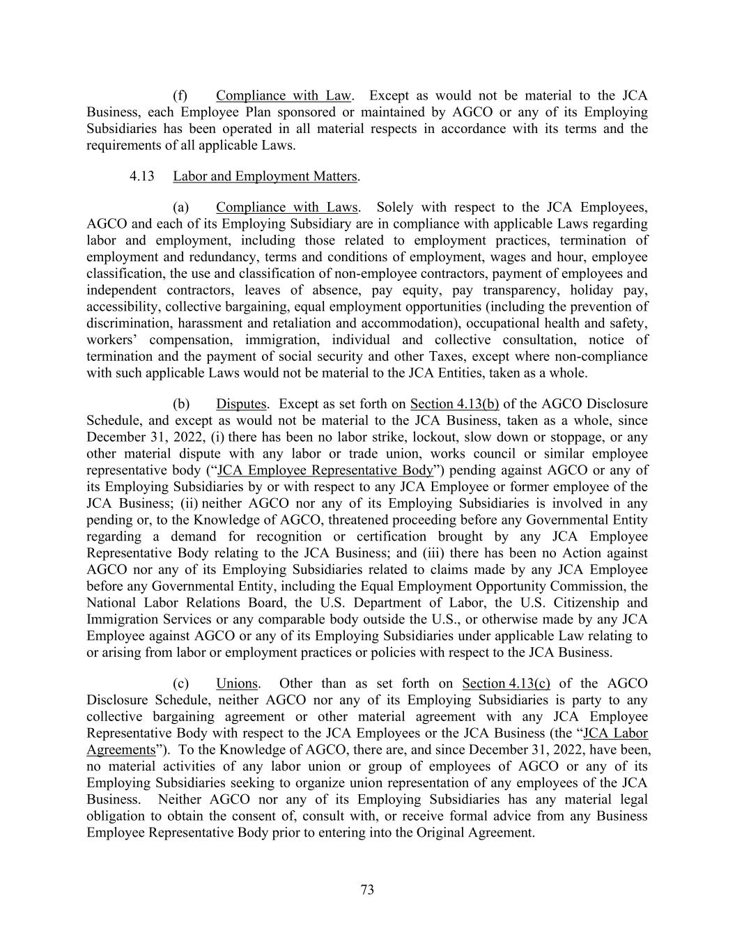 73 (f) Compliance with Law. Except as would not be material to the JCA Business, each Employee Plan sponsored or maintained by AGCO or any of its Employing Subsidiaries has been operated in all material respects in accordance with its terms and the requirements of all applicable Laws. 4.13 Labor and Employment Matters. (a) Compliance with Laws. Solely with respect to the JCA Employees, AGCO and each of its Employing Subsidiary are in compliance with applicable Laws regarding labor and employment, including those related to employment practices, termination of employment and redundancy, terms and conditions of employment, wages and hour, employee classification, the use and classification of non-employee contractors, payment of employees and independent contractors, leaves of absence, pay equity, pay transparency, holiday pay, accessibility, collective bargaining, equal employment opportunities (including the prevention of discrimination, harassment and retaliation and accommodation), occupational health and safety, workers’ compensation, immigration, individual and collective consultation, notice of termination and the payment of social security and other Taxes, except where non-compliance with such applicable Laws would not be material to the JCA Entities, taken as a whole. (b) Disputes. Except as set forth on Section 4.13(b) of the AGCO Disclosure Schedule, and except as would not be material to the JCA Business, taken as a whole, since December 31, 2022, (i) there has been no labor strike, lockout, slow down or stoppage, or any other material dispute with any labor or trade union, works council or similar employee representative body (“JCA Employee Representative Body”) pending against AGCO or any of its Employing Subsidiaries by or with respect to any JCA Employee or former employee of the JCA Business; (ii) neither AGCO nor any of its Employing Subsidiaries is involved in any pending or, to the Knowledge of AGCO, threatened proceeding before any Governmental Entity regarding a demand for recognition or certification brought by any JCA Employee Representative Body relating to the JCA Business; and (iii) there has been no Action against AGCO nor any of its Employing Subsidiaries related to claims made by any JCA Employee before any Governmental Entity, including the Equal Employment Opportunity Commission, the National Labor Relations Board, the U.S. Department of Labor, the U.S. Citizenship and Immigration Services or any comparable body outside the U.S., or otherwise made by any JCA Employee against AGCO or any of its Employing Subsidiaries under applicable Law relating to or arising from labor or employment practices or policies with respect to the JCA Business. (c) Unions. Other than as set forth on Section 4.13(c) of the AGCO Disclosure Schedule, neither AGCO nor any of its Employing Subsidiaries is party to any collective bargaining agreement or other material agreement with any JCA Employee Representative Body with respect to the JCA Employees or the JCA Business (the “JCA Labor Agreements”). To the Knowledge of AGCO, there are, and since December 31, 2022, have been, no material activities of any labor union or group of employees of AGCO or any of its Employing Subsidiaries seeking to organize union representation of any employees of the JCA Business. Neither AGCO nor any of its Employing Subsidiaries has any material legal obligation to obtain the consent of, consult with, or receive formal advice from any Business Employee Representative Body prior to entering into the Original Agreement.