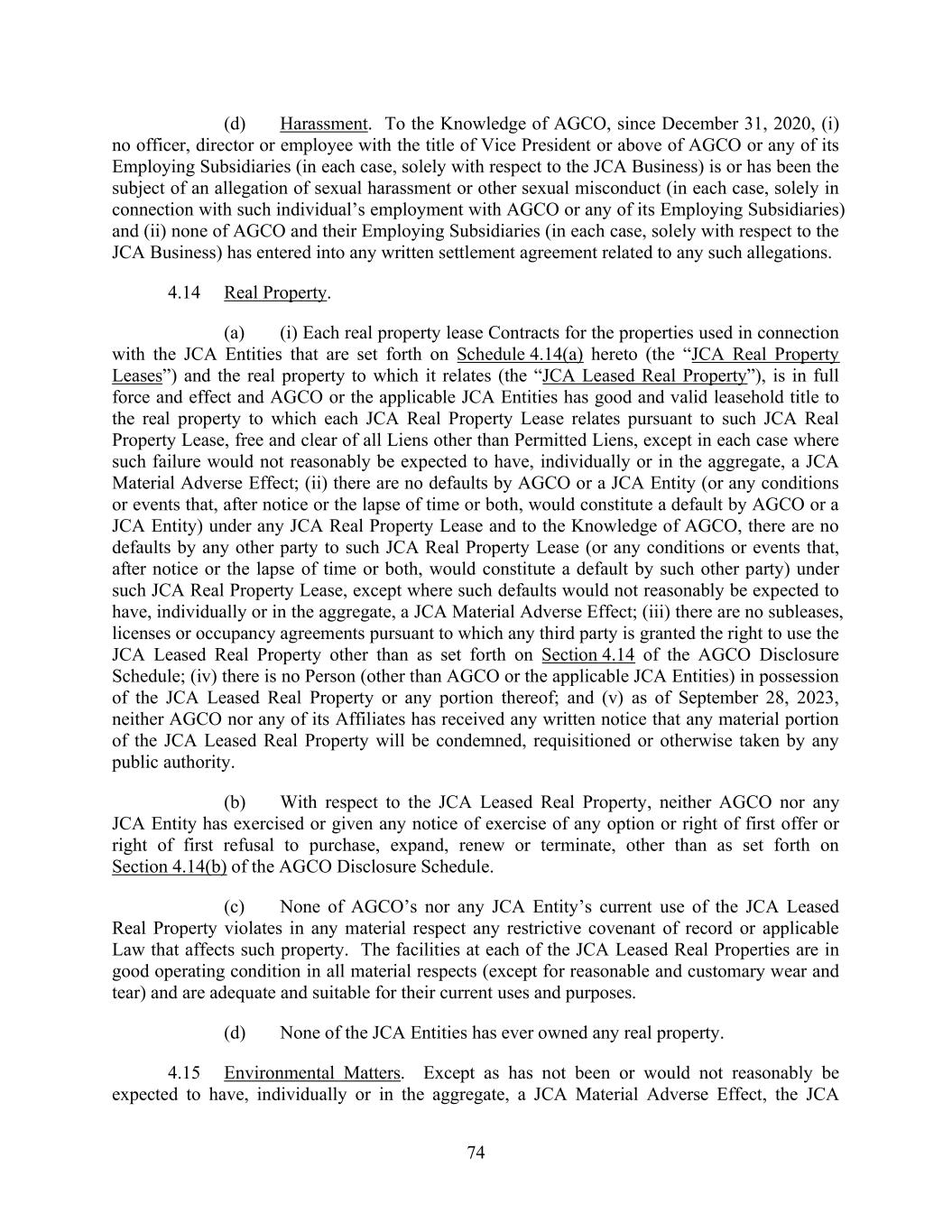 74 (d) Harassment. To the Knowledge of AGCO, since December 31, 2020, (i) no officer, director or employee with the title of Vice President or above of AGCO or any of its Employing Subsidiaries (in each case, solely with respect to the JCA Business) is or has been the subject of an allegation of sexual harassment or other sexual misconduct (in each case, solely in connection with such individual’s employment with AGCO or any of its Employing Subsidiaries) and (ii) none of AGCO and their Employing Subsidiaries (in each case, solely with respect to the JCA Business) has entered into any written settlement agreement related to any such allegations. 4.14 Real Property. (a) (i) Each real property lease Contracts for the properties used in connection with the JCA Entities that are set forth on Schedule 4.14(a) hereto (the “JCA Real Property Leases”) and the real property to which it relates (the “JCA Leased Real Property”), is in full force and effect and AGCO or the applicable JCA Entities has good and valid leasehold title to the real property to which each JCA Real Property Lease relates pursuant to such JCA Real Property Lease, free and clear of all Liens other than Permitted Liens, except in each case where such failure would not reasonably be expected to have, individually or in the aggregate, a JCA Material Adverse Effect; (ii) there are no defaults by AGCO or a JCA Entity (or any conditions or events that, after notice or the lapse of time or both, would constitute a default by AGCO or a JCA Entity) under any JCA Real Property Lease and to the Knowledge of AGCO, there are no defaults by any other party to such JCA Real Property Lease (or any conditions or events that, after notice or the lapse of time or both, would constitute a default by such other party) under such JCA Real Property Lease, except where such defaults would not reasonably be expected to have, individually or in the aggregate, a JCA Material Adverse Effect; (iii) there are no subleases, licenses or occupancy agreements pursuant to which any third party is granted the right to use the JCA Leased Real Property other than as set forth on Section 4.14 of the AGCO Disclosure Schedule; (iv) there is no Person (other than AGCO or the applicable JCA Entities) in possession of the JCA Leased Real Property or any portion thereof; and (v) as of September 28, 2023, neither AGCO nor any of its Affiliates has received any written notice that any material portion of the JCA Leased Real Property will be condemned, requisitioned or otherwise taken by any public authority. (b) With respect to the JCA Leased Real Property, neither AGCO nor any JCA Entity has exercised or given any notice of exercise of any option or right of first offer or right of first refusal to purchase, expand, renew or terminate, other than as set forth on Section 4.14(b) of the AGCO Disclosure Schedule. (c) None of AGCO’s nor any JCA Entity’s current use of the JCA Leased Real Property violates in any material respect any restrictive covenant of record or applicable Law that affects such property. The facilities at each of the JCA Leased Real Properties are in good operating condition in all material respects (except for reasonable and customary wear and tear) and are adequate and suitable for their current uses and purposes. (d) None of the JCA Entities has ever owned any real property. 4.15 Environmental Matters. Except as has not been or would not reasonably be expected to have, individually or in the aggregate, a JCA Material Adverse Effect, the JCA